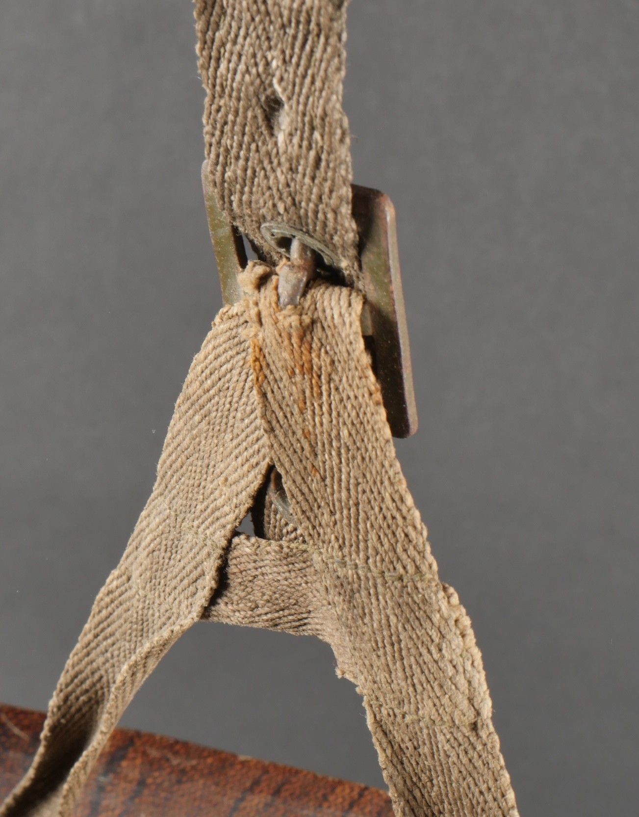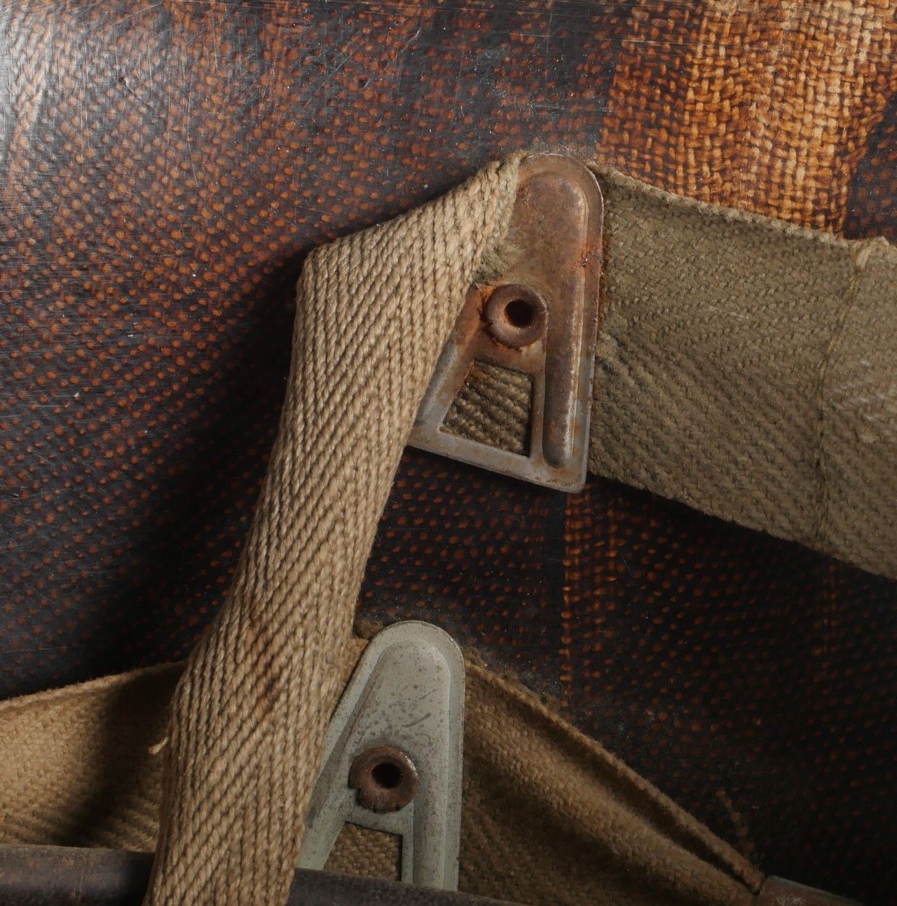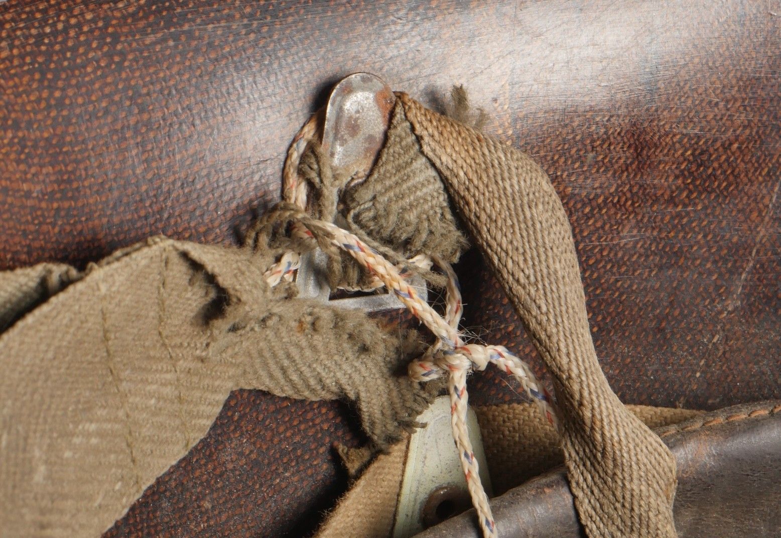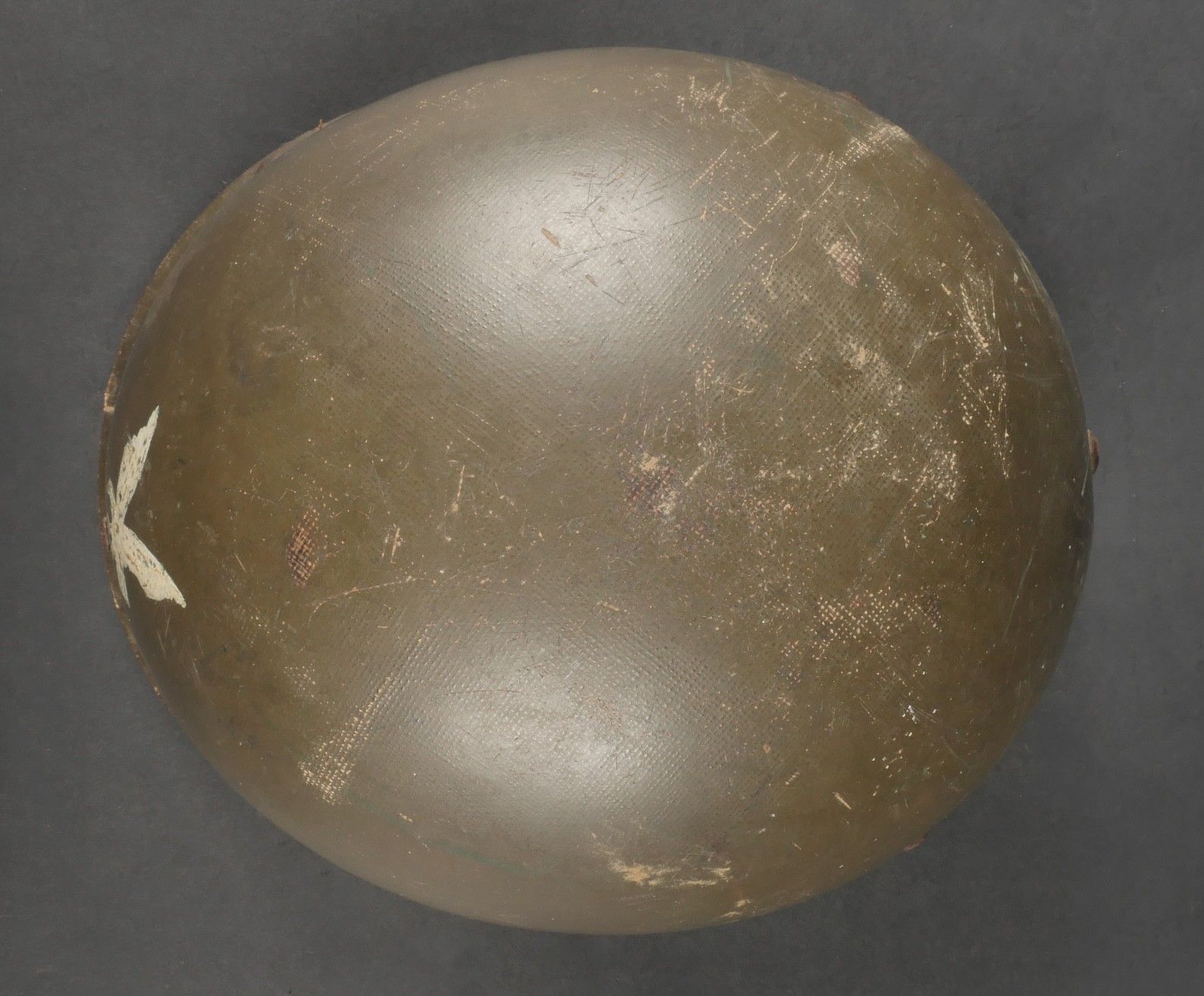Nice under helmet model TAP 1951, 2nd type with a white eagle on the front over the number 10 Commando Parachutiste de l'Air 10 . Under helmet made of vulcanised celoron fibre by FD and dated 1954. Second type neck protector, sewn in, with a small repair. Adjustment buckle in khaki paint. Leather headband present but two staples missing. Chin strap in khaki canvas specific to the TAP model. An unusual item. This helmet can be seen in the book Paras Français Algérie 1954 1962, page 154. Fine TAP 1951 liner second type bearing at front a white eagle above number 10 Commando Parachutiste de l'Air 10 made of vulcanized fiber by FD dated 1954. Secondtype neckband with small period repair adjustment buckle khaki paint leather sweatband with two clips missing khaki web chinstrap specific to TAP model rare piece referenced in Paras Français Algérie 1954-1962 page 154.