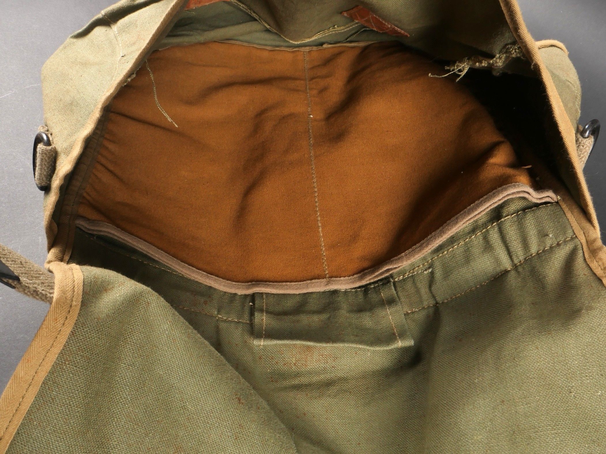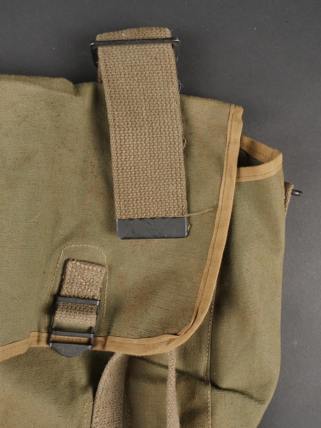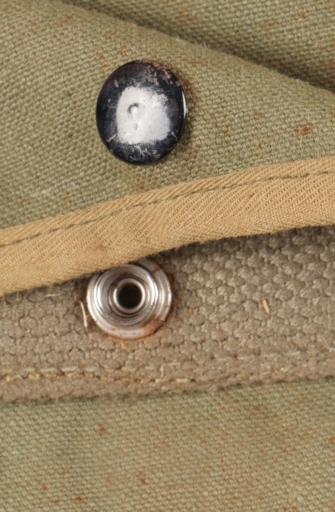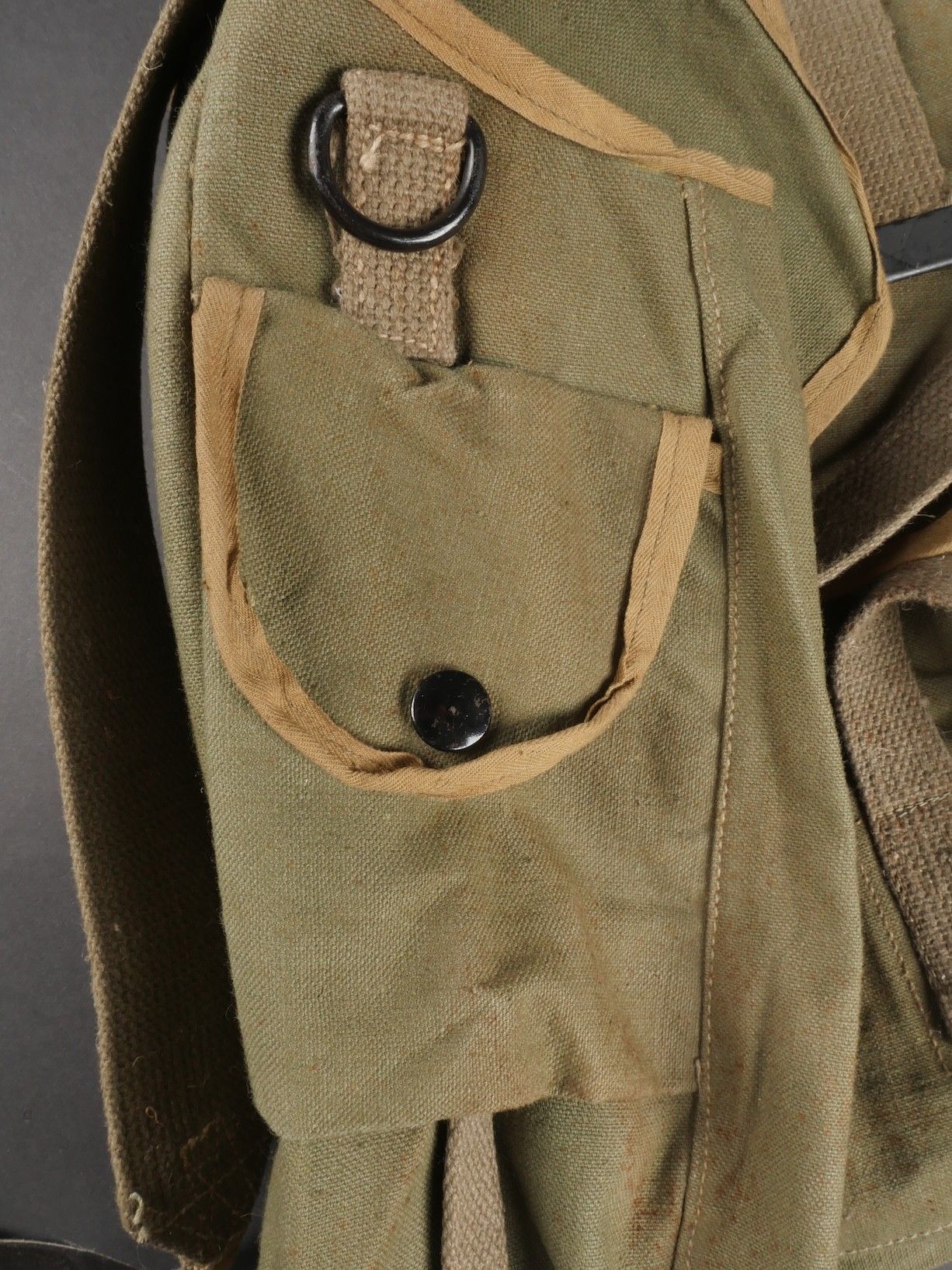 Specific musette for Marine commandos. Identical to the TAP 50 musette but with much narrower snap hooks and two additional canvas loops holding buckles. Snap closing the small side pocket, in original paint and functional. Rear snap, also functional and in original paint. Stamp on the inside of the flap from a Parisian manufacturer. Like new from stock, with only minor signs of storage. Commando Marine specific haversack. Identical to the TAP 50 model but fitted with narrower carabiners and two extra web loops securing buckles. Snap fasteners on side and rear pockets functional with original paint. Parisian maker's stamp under flap. Unissued stock condition with only slight storage traces.