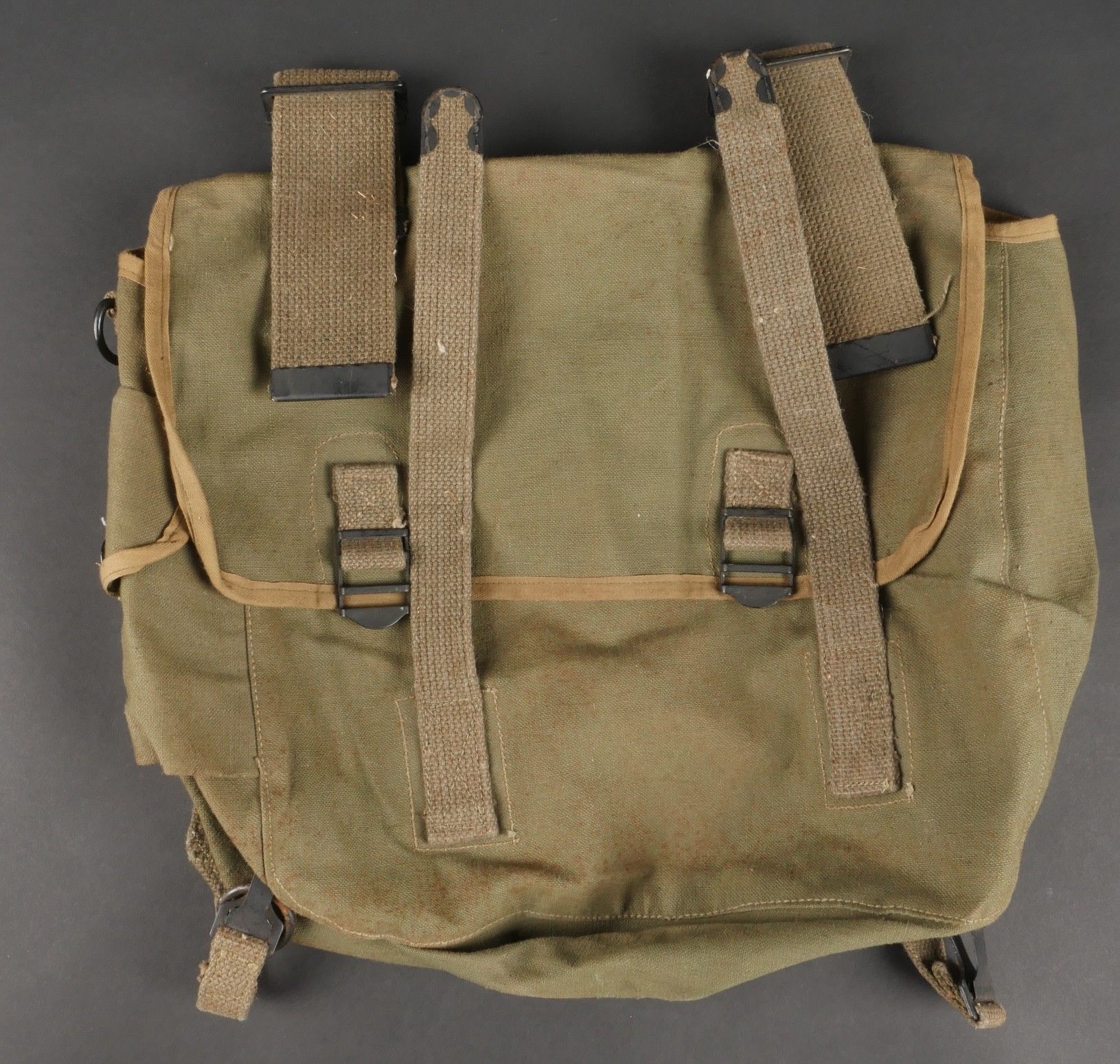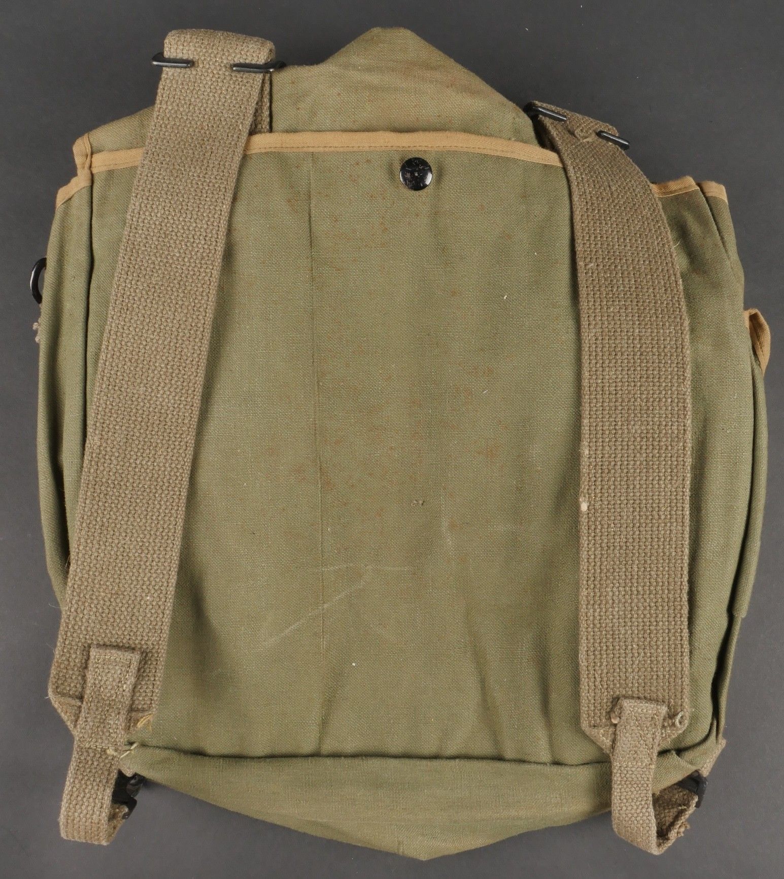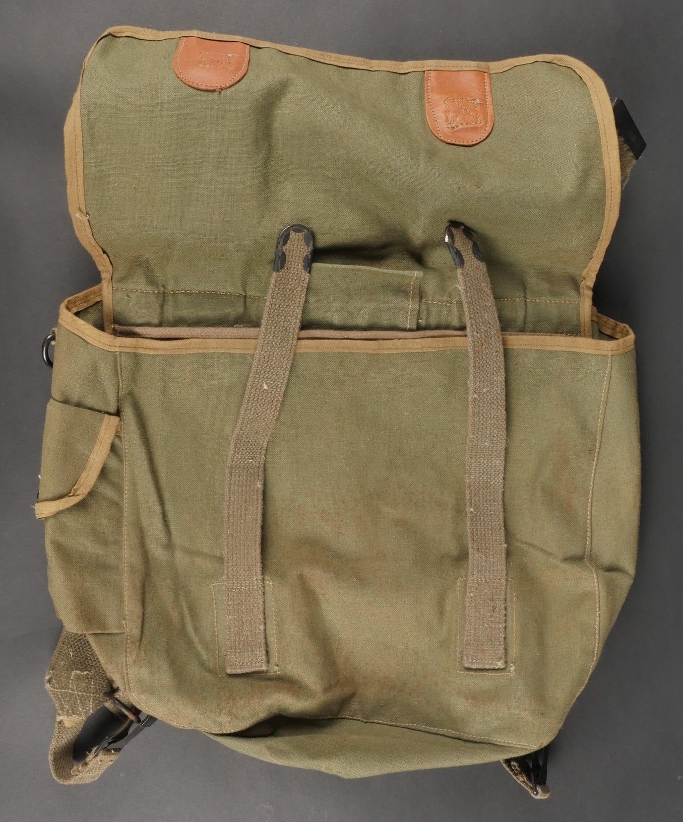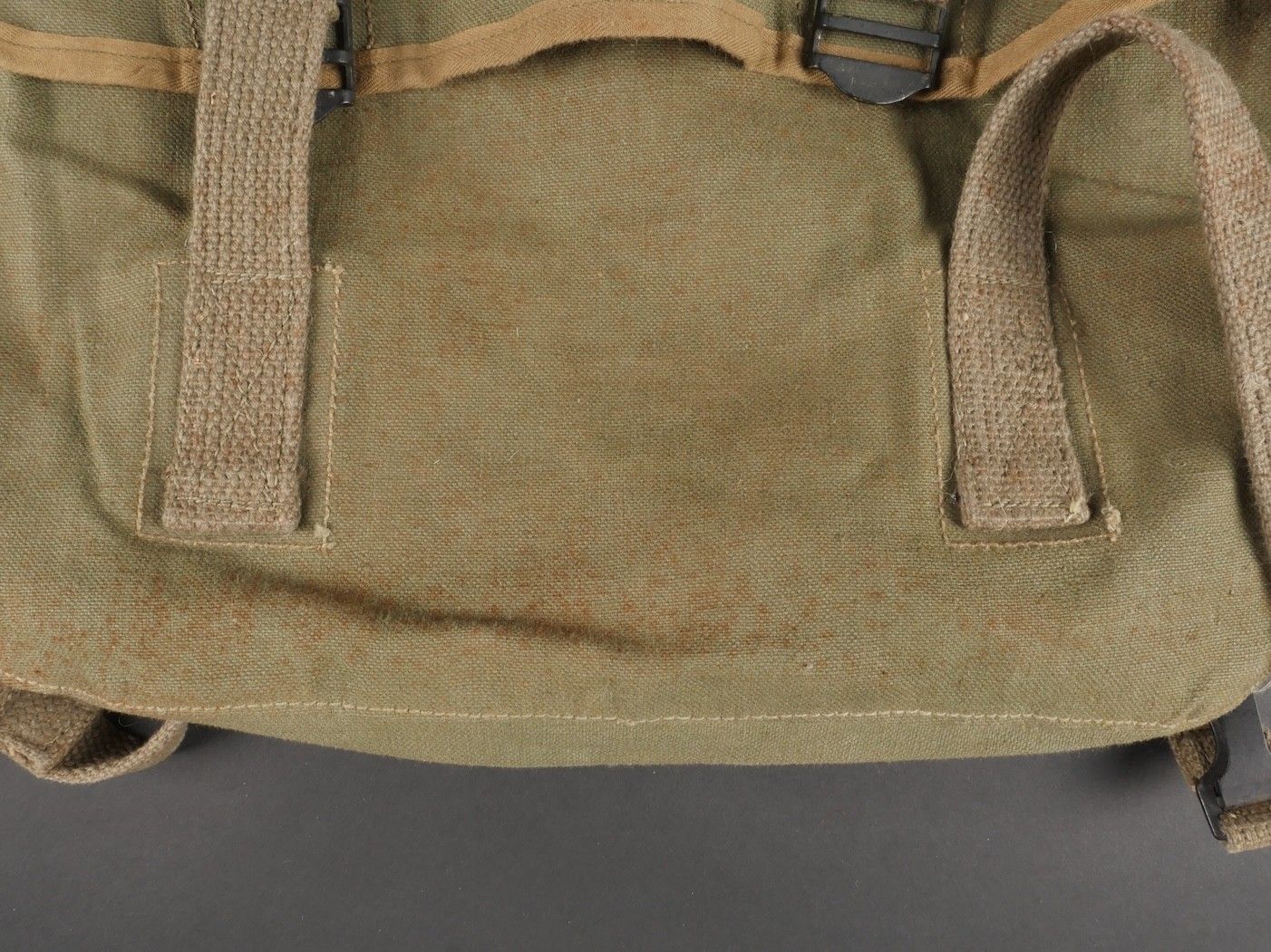 Specific musette for Marine commandos. Identical to the TAP 50 musette but with much narrower snap hooks and two additional canvas loops holding buckles. Snap closing the small side pocket, in original paint and functional. Rear snap, also functional and in original paint. Stamp on the inside of the flap from a Parisian manufacturer. Like new from stock, with only minor signs of storage. Commando Marine specific haversack. Identical to the TAP 50 model but fitted with narrower carabiners and two extra web loops securing buckles. Snap fasteners on side and rear pockets functional with original paint. Parisian maker's stamp under flap. Unissued stock condition with only slight storage traces.