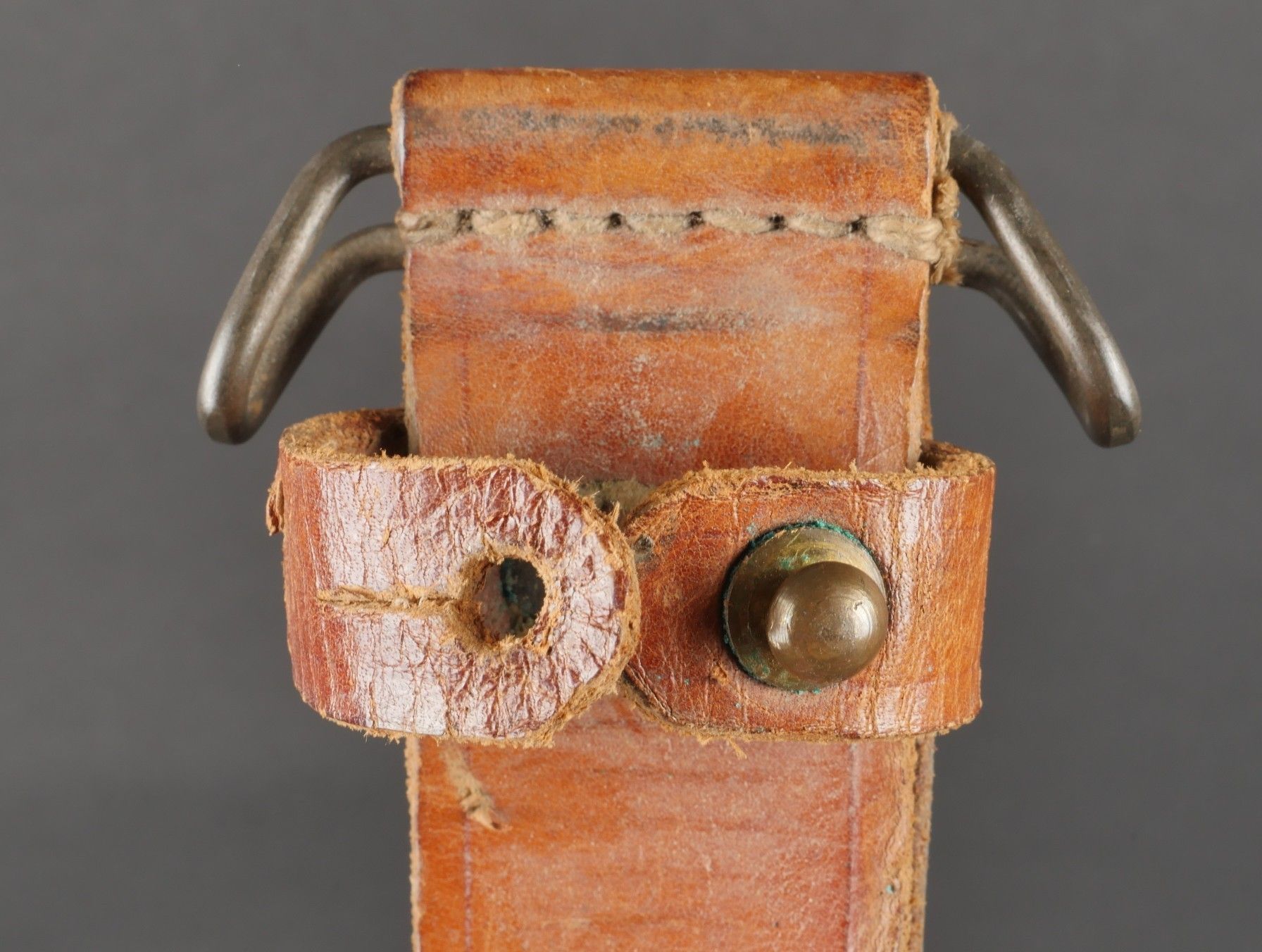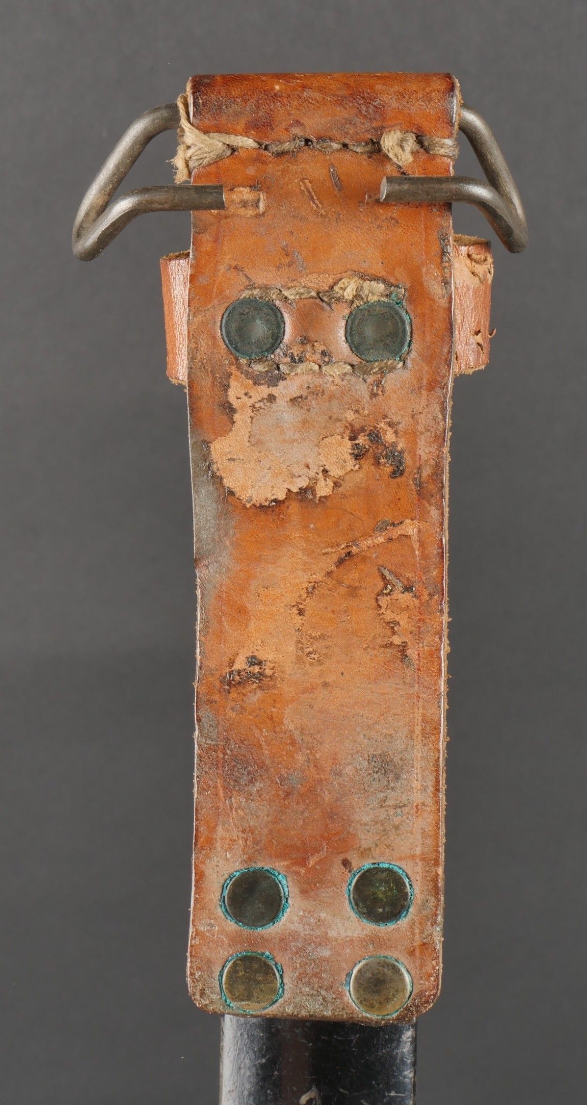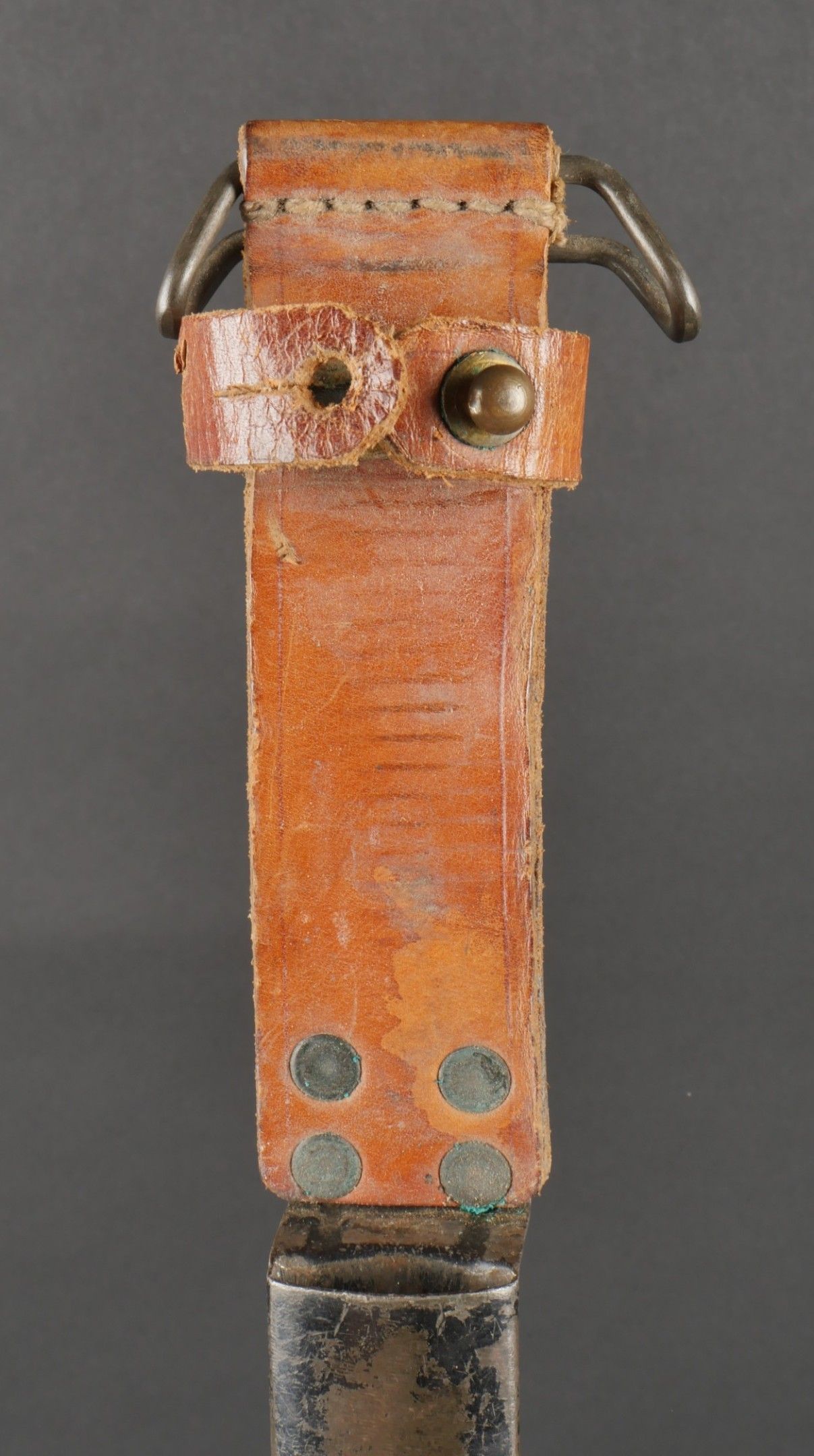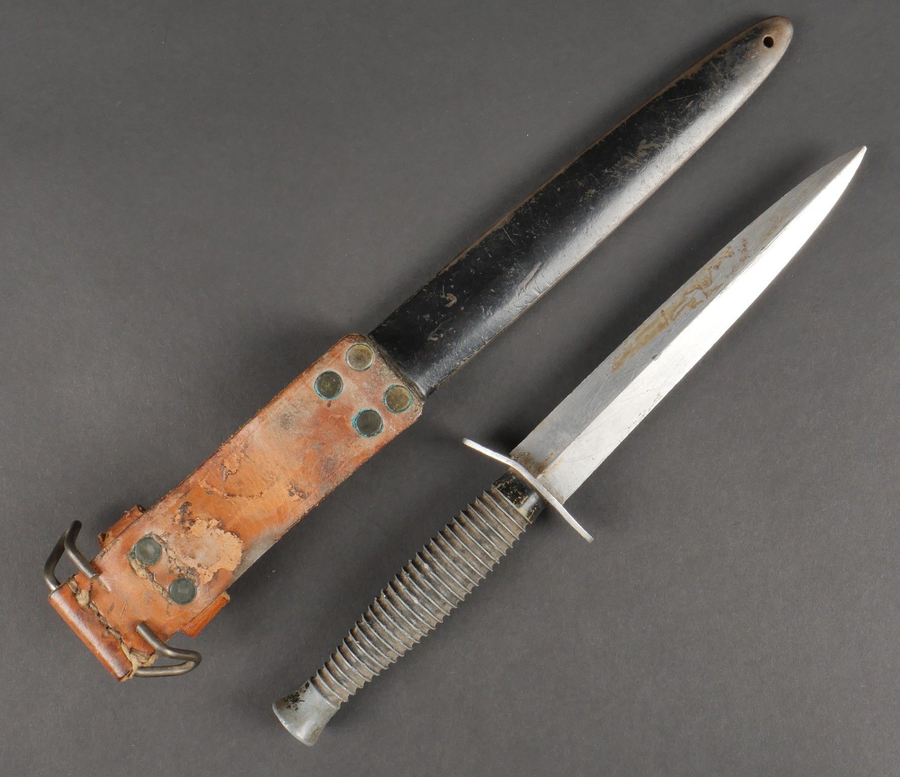 Le Commando FOM dagger. Moulded zamak handle with 26 grooves, in matt black paint. Original hilt with sloping edge, marked FOM for Force OutreMer and the number 1983. Original disassembly screws. Blade in its original length and still sharp. Scabbard specific to this dagger, made of sheet steel covered with black paint, the end of the scabbard pierced to receive a leather lace. Steel blade riveted with 4 brass rivets to reinforce the leather loop. Leather strap and original hook still present. Le Commando" dagger, FOM model. Cast zamak handle with 26 flutes in matte black paint. Original guard with angled flange marked FOM for Forces OutreMer and serial number 1983. Original screw. Blade fulllength and sharp. Blackpainted steel scabbard with pierced tip for leather thong. Steel blade riveted with four brass rivets reinforcing the leather belt loop. Leather retaining strap and original hook intact.