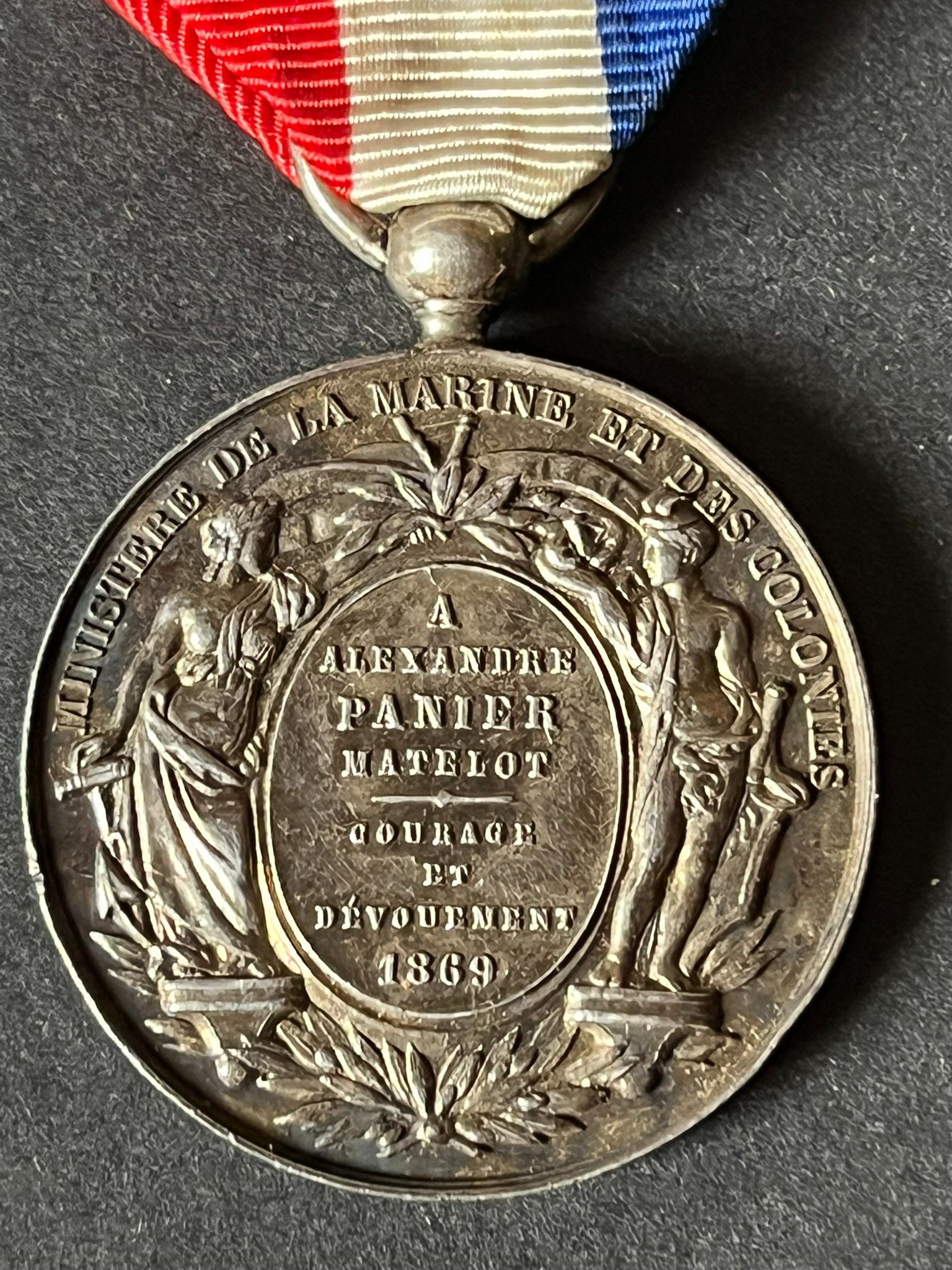 FRANCE 2nd Empire, Courage and Devotion medal, laureate head signed Barre, Ministry of the Navy and Colonies, awarded to a sailor in 1869, 35mm, silver punch on the edge, minor marks. FRANCE Second Empire, Courage and Devotion medal, laureate head signed Barre, Ministry of the Navy and Colonies, awarded to a sailor in 1869, 35mm, silver punch on the edge, minor marks