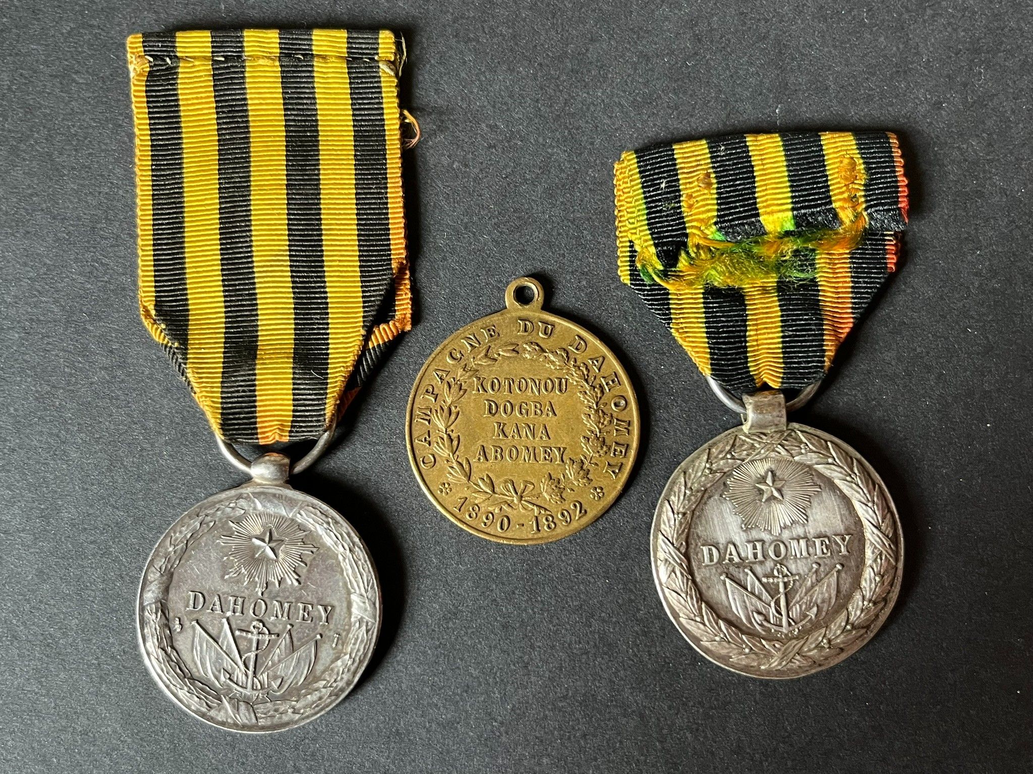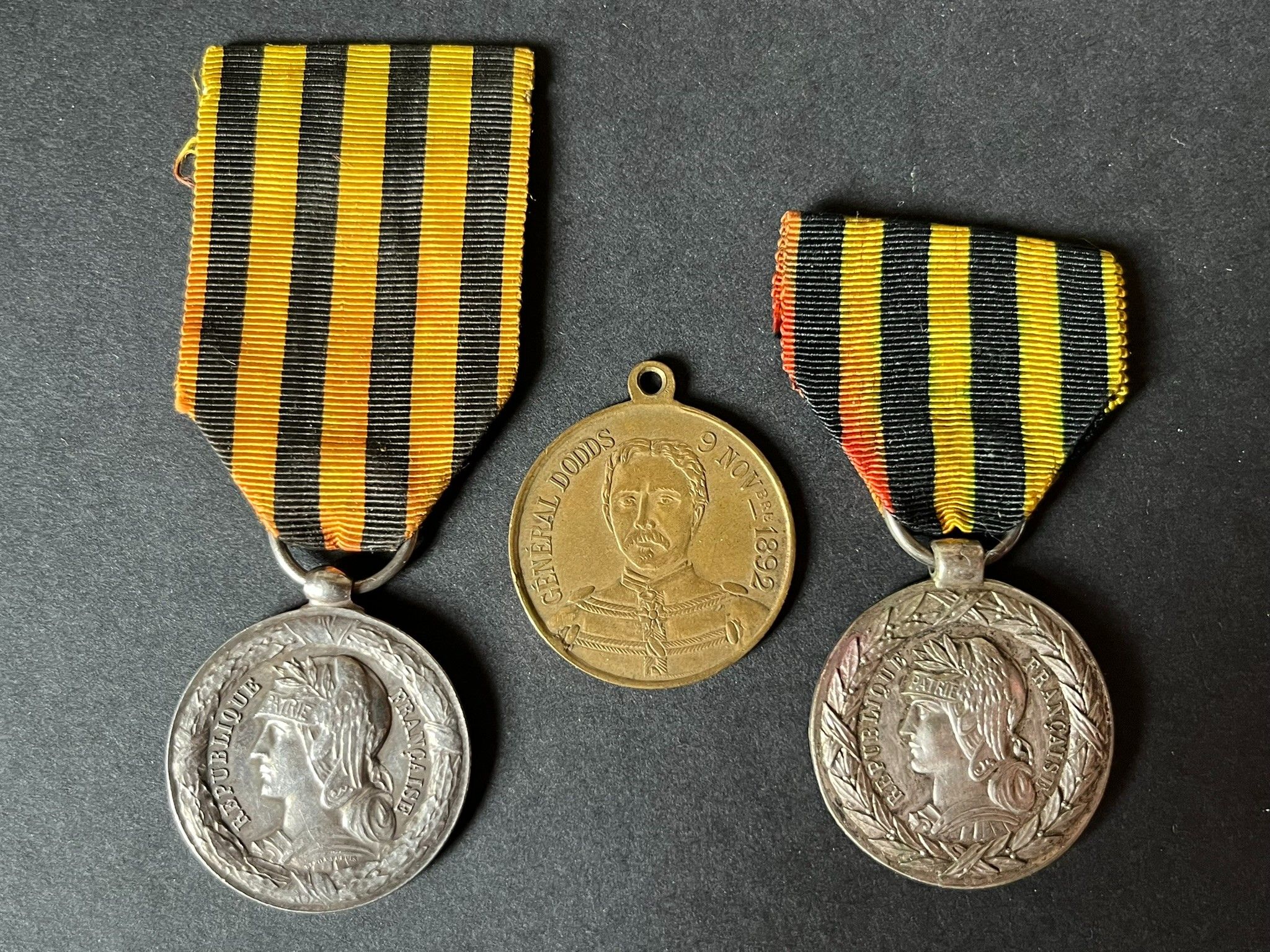FRANCE 3rd Republic, 3 pieces, silver medal of the Dahomey Expedition, period strike from the Paris Mint, 32mm silver variant of private period strike, brass medal of General Dodds. FRANCE Third Republic, 3 pieces, silver medal of the Dahomey Expedition, period strike from the Paris Mint, 32mm silver variant of private period strike, brass medal of General Dodds