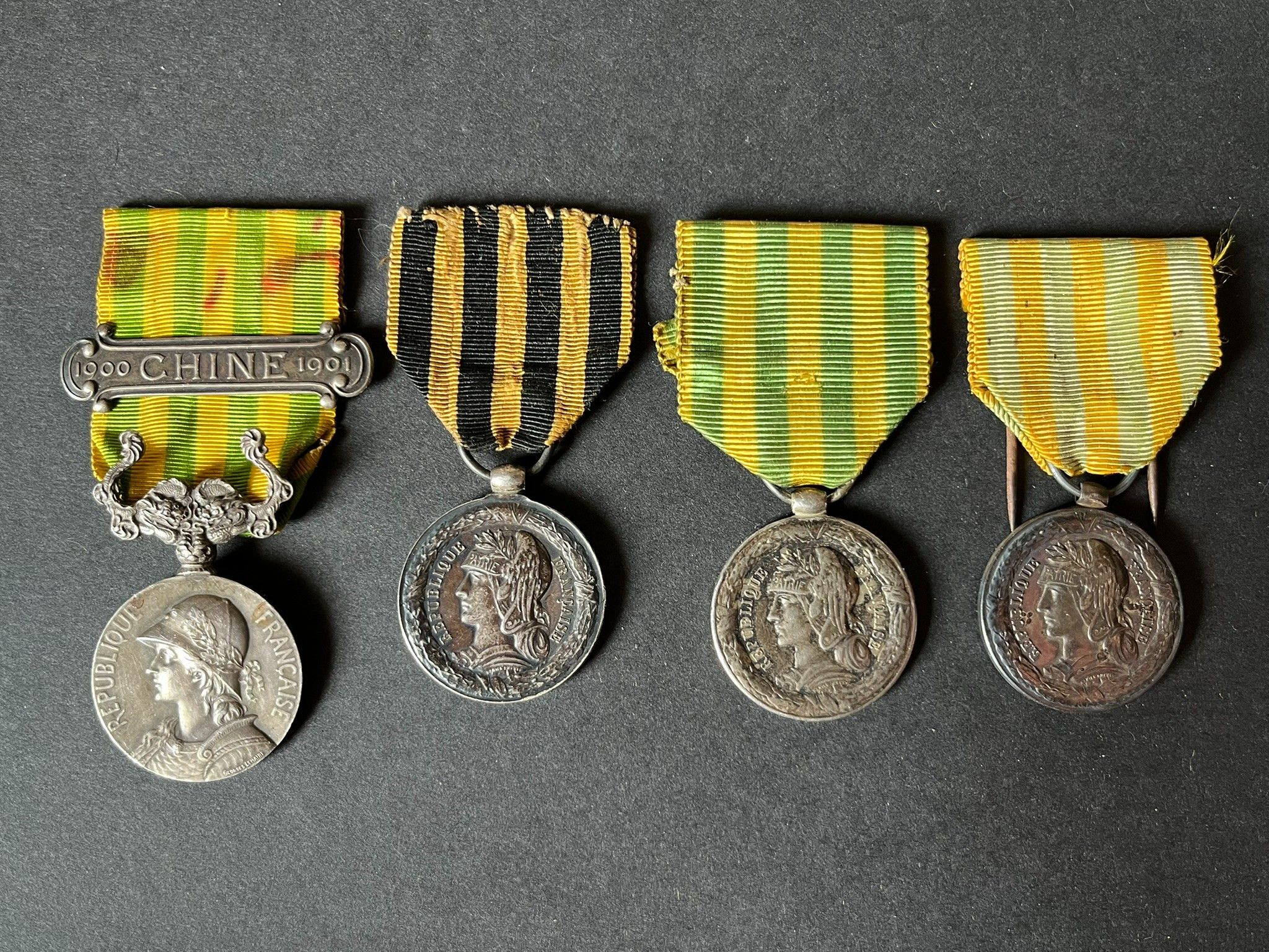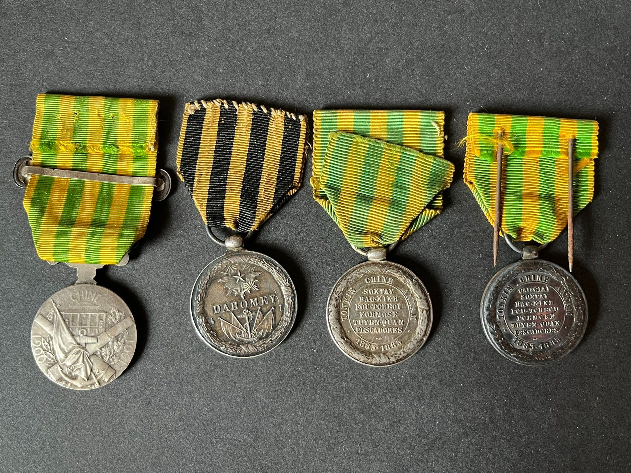 FRANCE 3rd Republic, 4 pieces, silver medal of the Dahomey Expedition, period strike from the Paris Mint, silver medal of the Tonkin Expedition Navy Model with 7 battles, period strike from the Paris Mint, the same version Army with 6 battles, some scratches on the edge, silver medal of the China Expedition 1900 1901 with China clasp in hallmarked silver. FRANCE Third Republic, 4 pieces, silver medal of the Dahomey Expedition, period strike from the Paris Mint, silver medal of the Tonkin Expedition Navy Model with 7 battles, period strike from the Paris Mint, same version Army with 6 battles, a few scratches on the edge, silver medal of the China Expedition 1900 1901 with silver clasp CHINA hallmarked