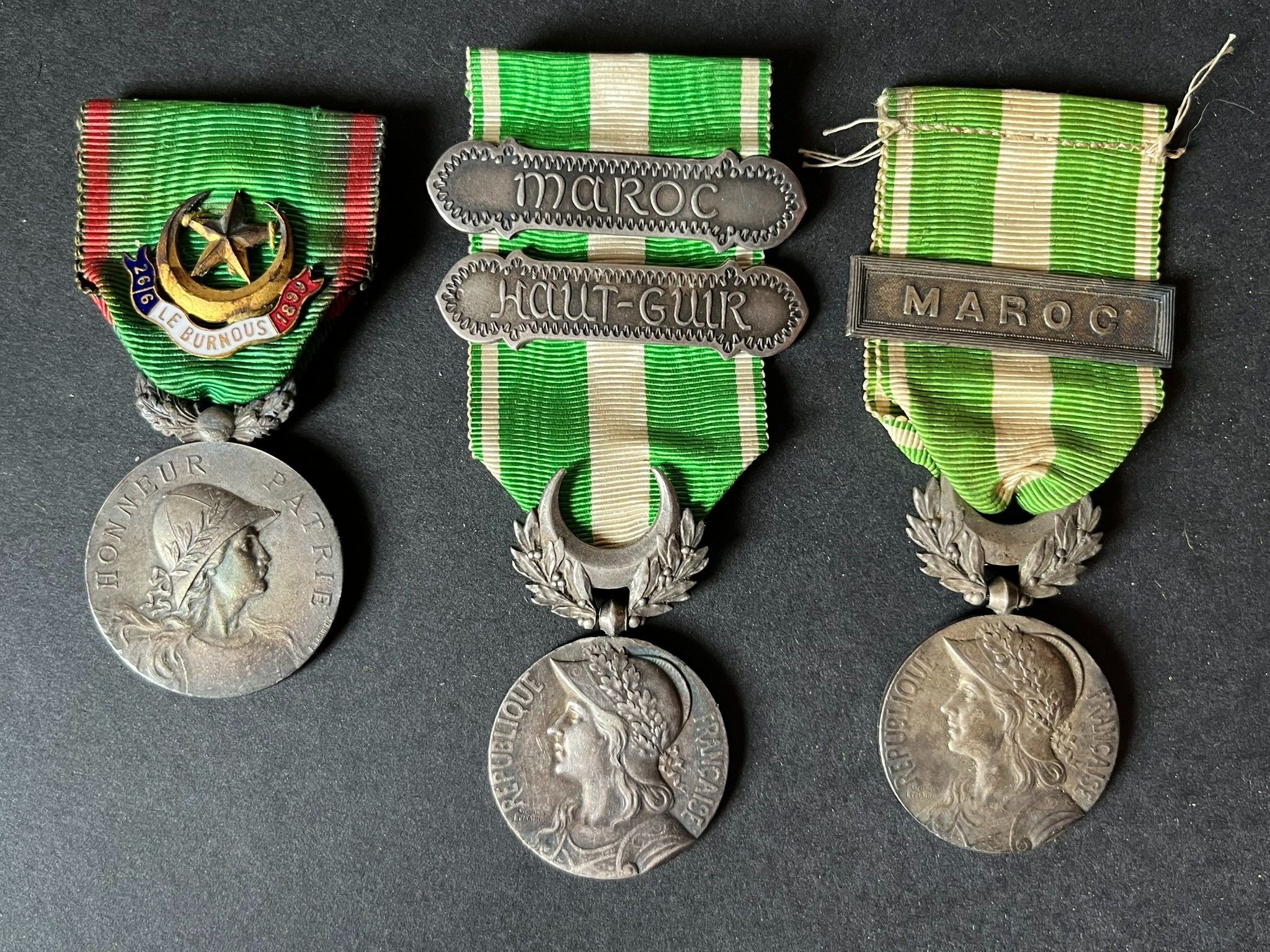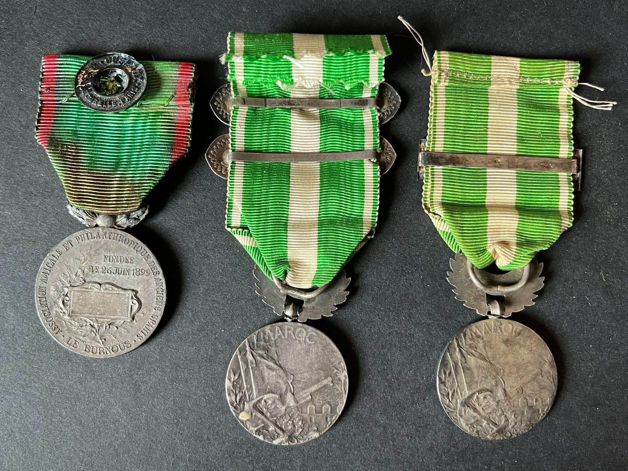 FRANCE 3rd Republic, 3 pieces, silver medal of Morocco 1909 with rectangular silver clasp MAROC hallmarked, another with 2 oriental silver clasps Morocco and Haut Guir, bronze-marked medal on the edge from the association des anciens Spahis Le Burnous with its clasp. FRANCE Third Republic, 3 pieces, silver medal of Morocco 1909 with rectangular silver clasp MAROC hallmarked, another with 2 oriental silver clasps Morocco and Haut Guir, bronze-marked medal on the edge from the Association of Former Spahis Le Burnous with its clasp