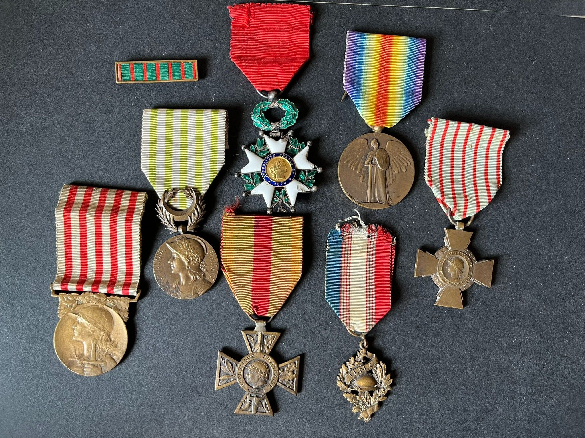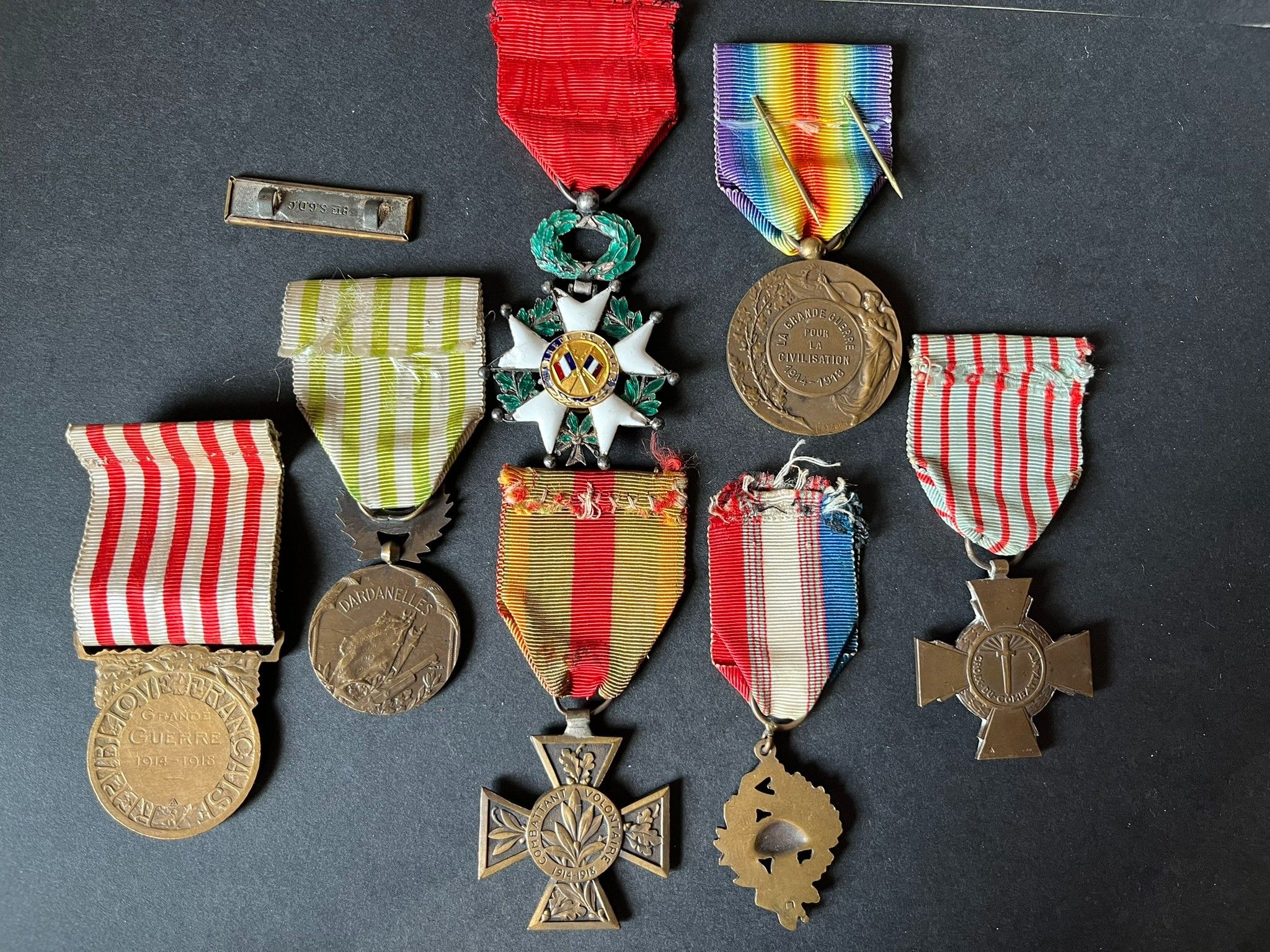 FRANCE 1914 1918, 8 pieces, enameled silver cross with gold centres of a Third Republic Knight of the Legion of Honour, enamel chips, bronze matte Dardanelles Medal, Interallied Victory Medal model Pautot,Mattei, 1914 1918 Commemorative Medal, Combatant Cross, Volunteer Combatant Cross large model, resoldered attachment, UNC medal, Dixmude de la croix de guerre. FRANCE 1914 1918, 8 pieces, enameled silver cross with gold centres of a Third Republic Knight of the Legion of Honour, enamel chips, bronze matte Dardanelles Medal, Interallied Victory Medal model Pautot Mattei, 1914 1918 Commemorative Medal, Combatant's Cross, large model Volunteer Combatant's Cross with repaired suspension, UNC Medal, Dixmude of the War Cross