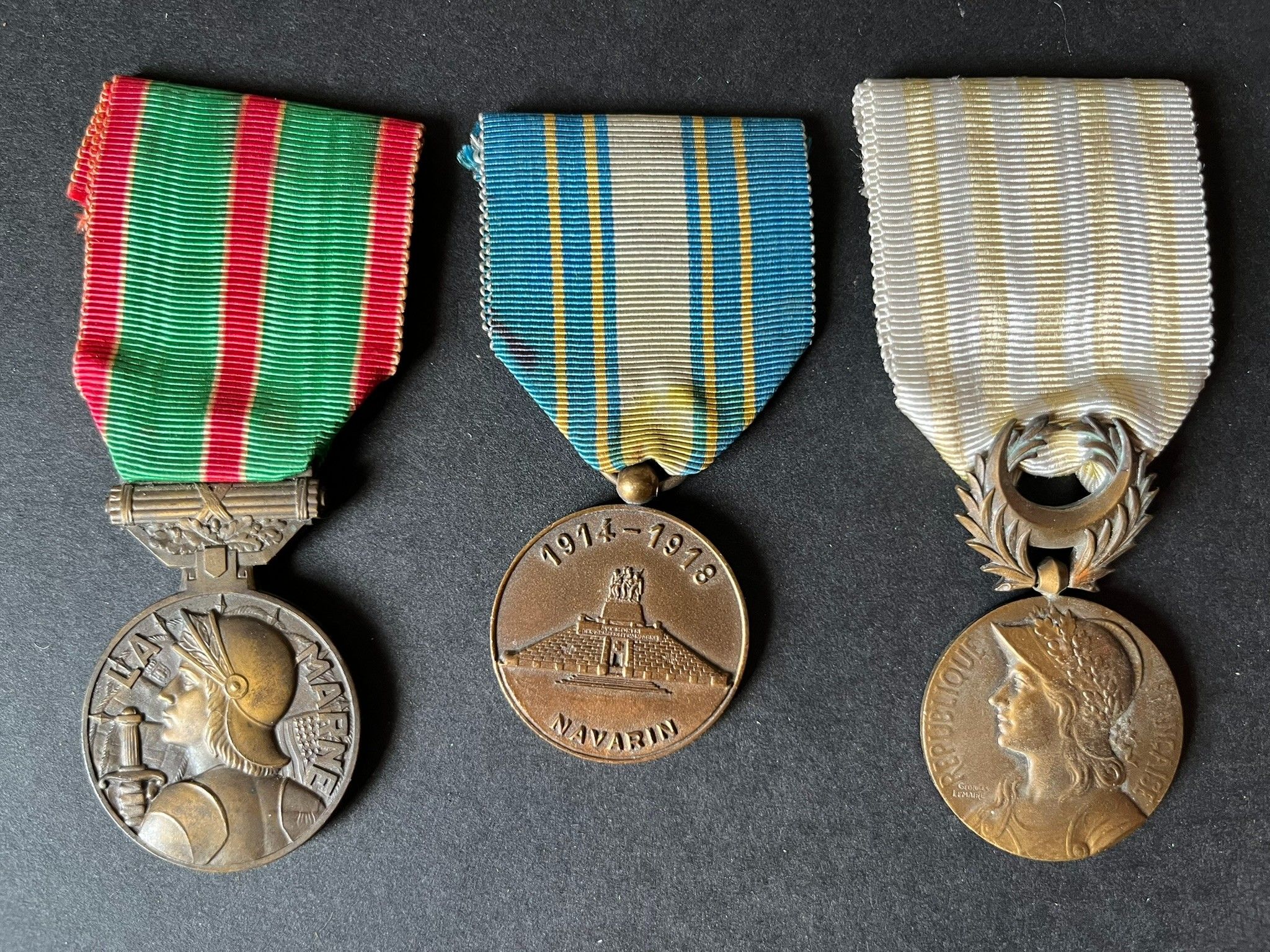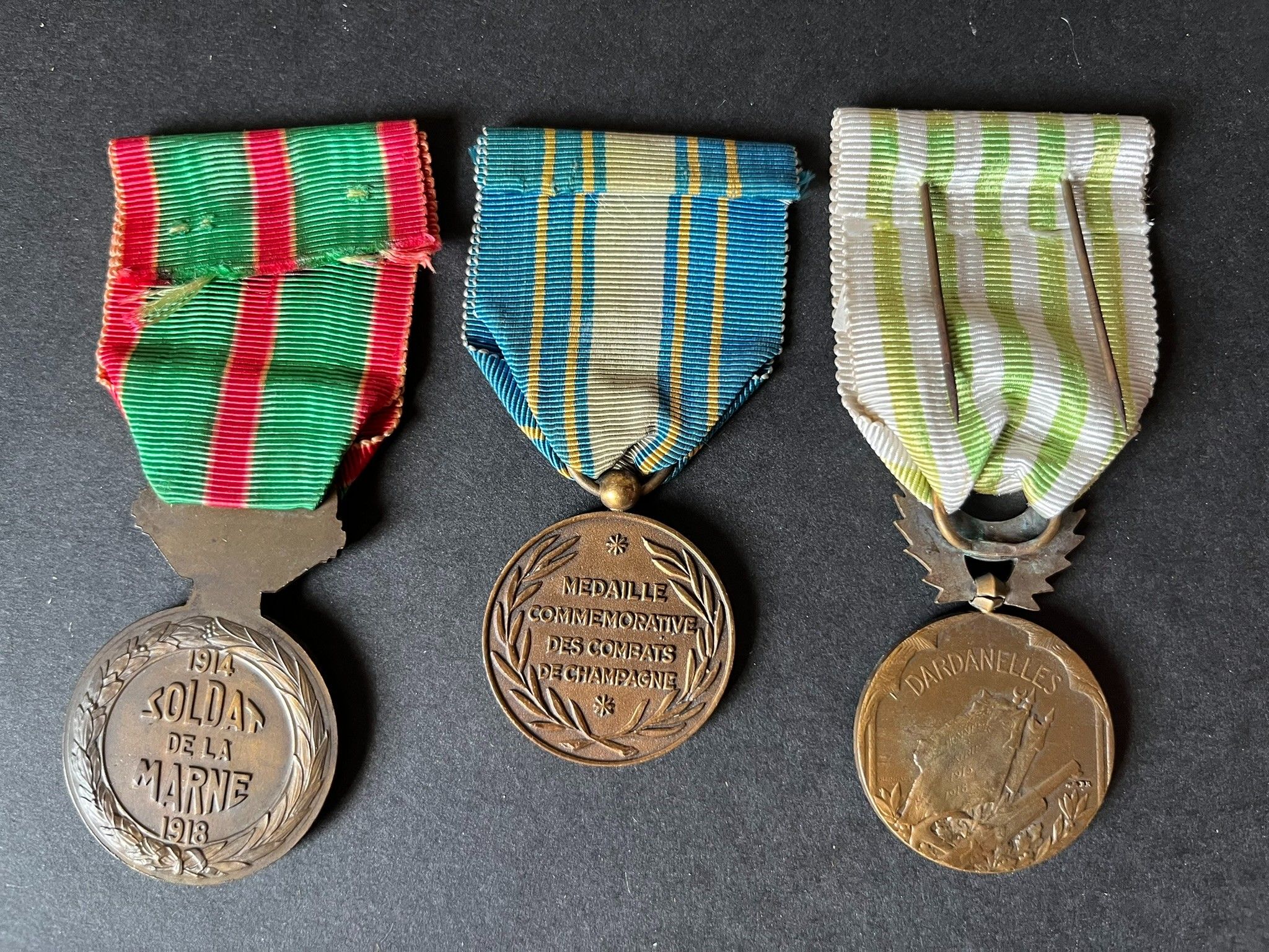 FRANCE 1914 1918, 3 pieces, Commemorative Medal of the Champagne battles known as Navarin, Marne Medal, bronze matte Dardanelles Medal. FRANCE 1914 1918, 3 pieces, Commemorative Medal of the Champagne battles known as Navarin, Marne Medal, bronze matte Dardanelles Medal