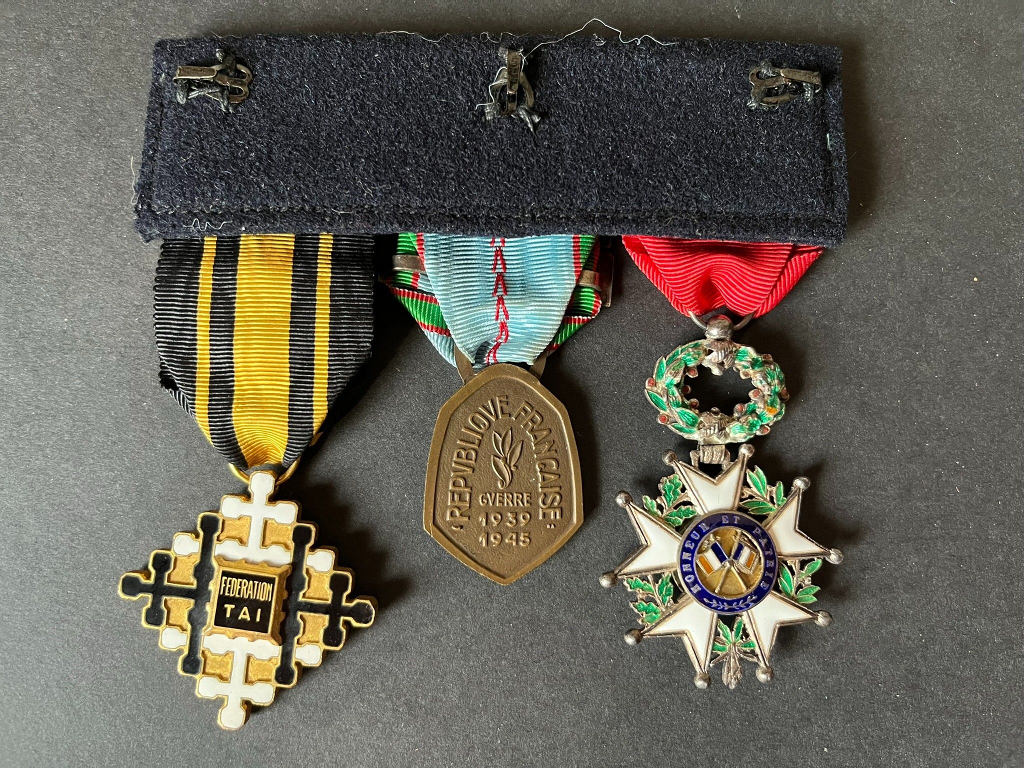 FRANCE Indochine, 3 pieces, officer's medal bar from the Indochina War with Knight's Cross of the Legion of Honour deluxe model with applied fillets and branches, silver hallmarked, 1939 1945 commemorative medal with clasps France and Africa, officer's cross of the Order of Merit of the Thai Federation, enamelled gilt bronze. FRANCE Indochina, 3 pieces, officer's medal bar from the Indochina War with Knight's Cross of the Legion of Honour deluxe model with applied fillets and branches, hallmarked silver, 1939 1945 Commemorative Medal with France and Africa clasps, Officer's Cross of the Order of Merit of the Thai Federation, gilt and enameled bronze