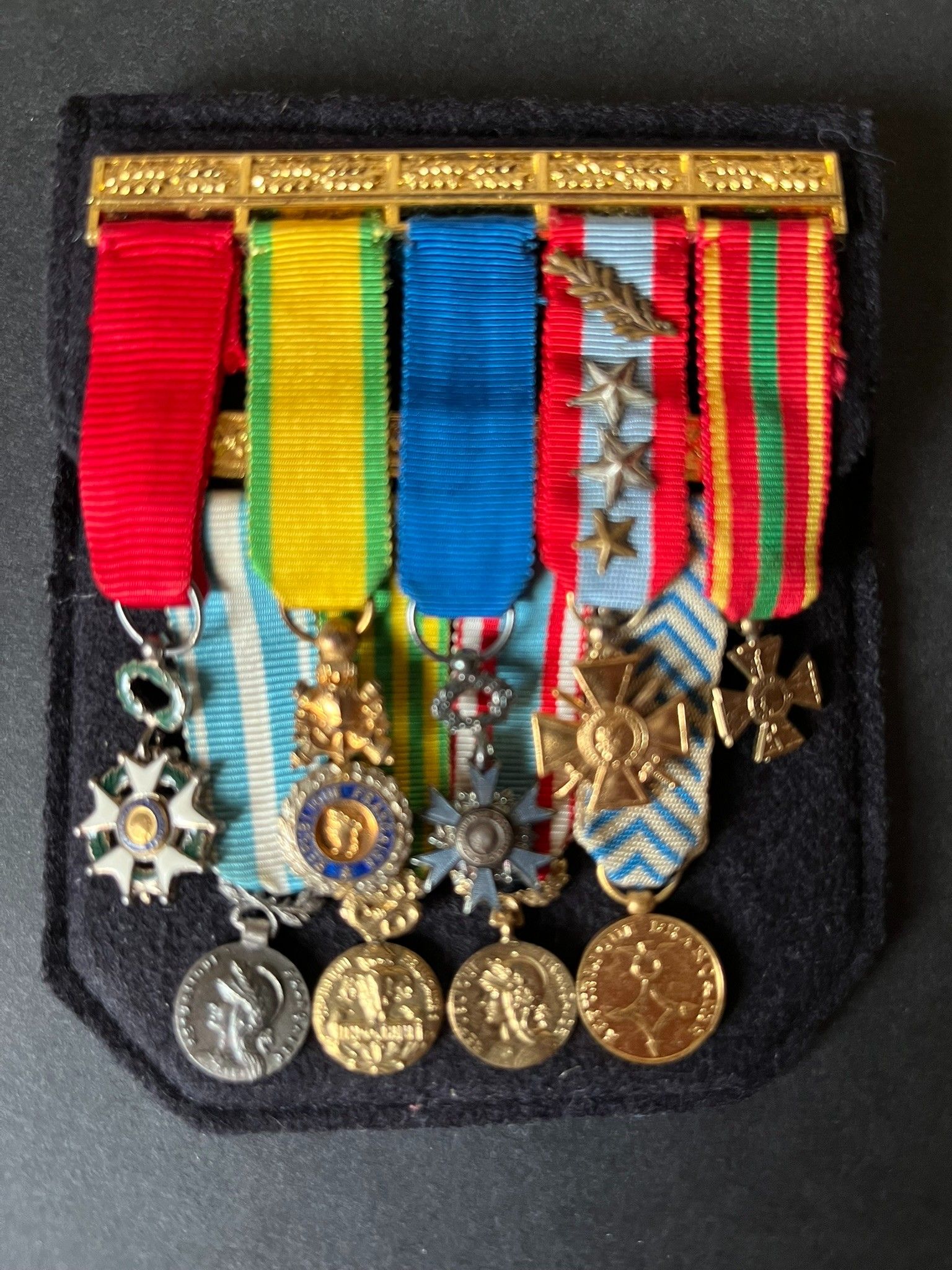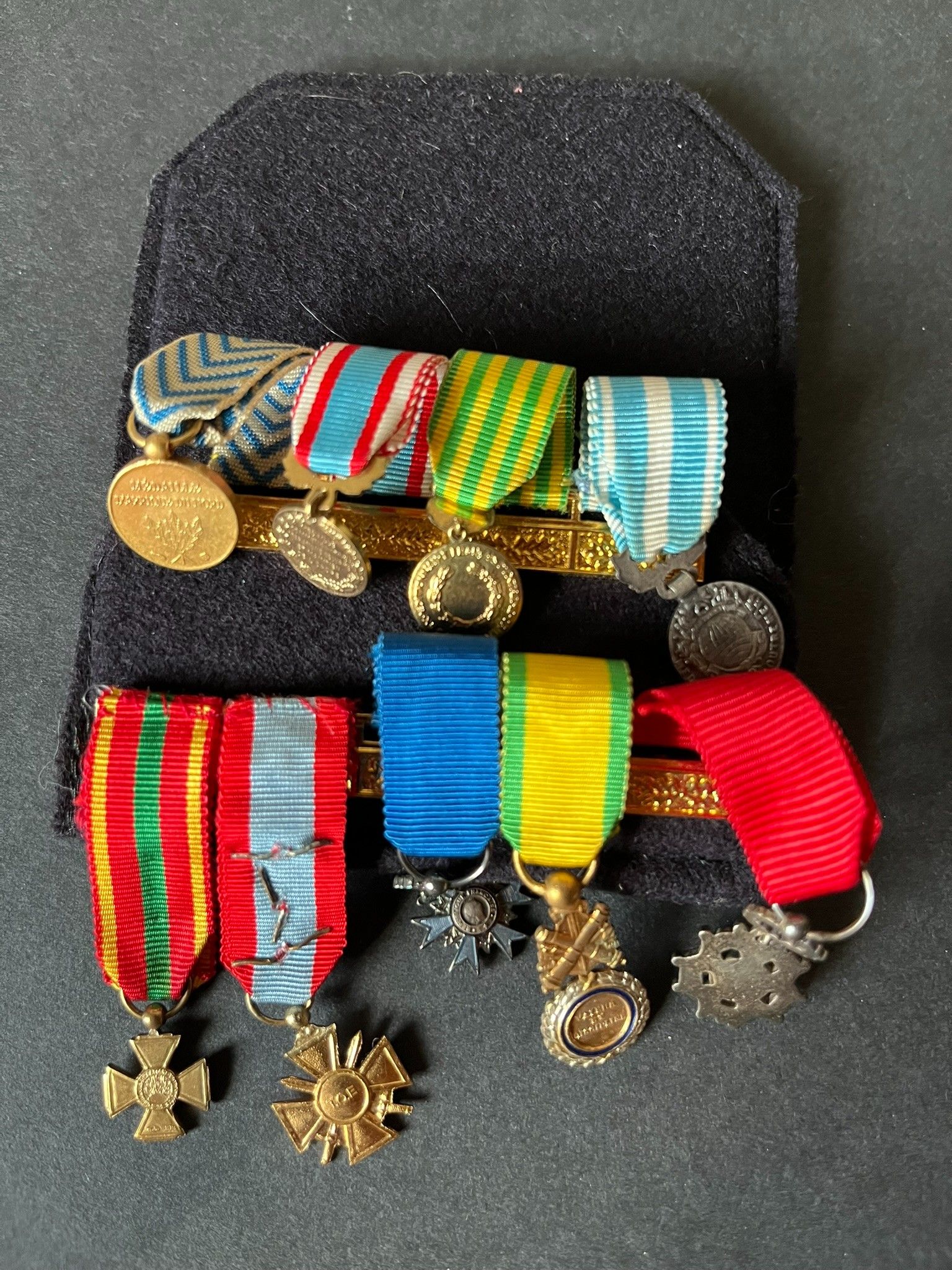 FRANCE Indochine Algerie , 9 pieces, group of miniatures of a veteran of Indochina and Algeria, fine mounting for a blazer pocket. FRANCE Indochina Algeria, 9 pieces, group of miniatures of a veteran of Indochina and Algeria, fine mounting for a blazer pocket