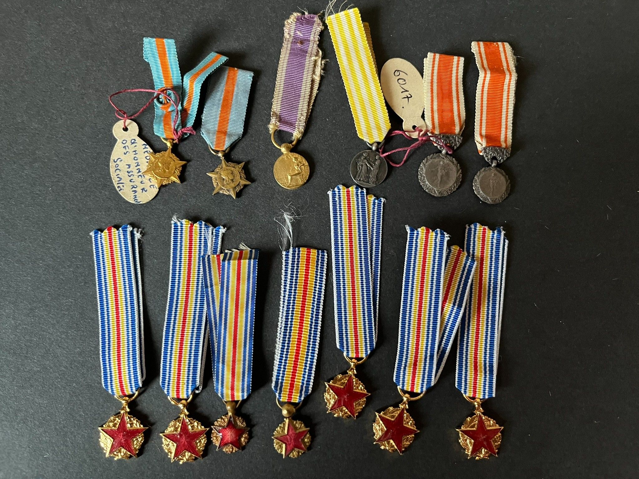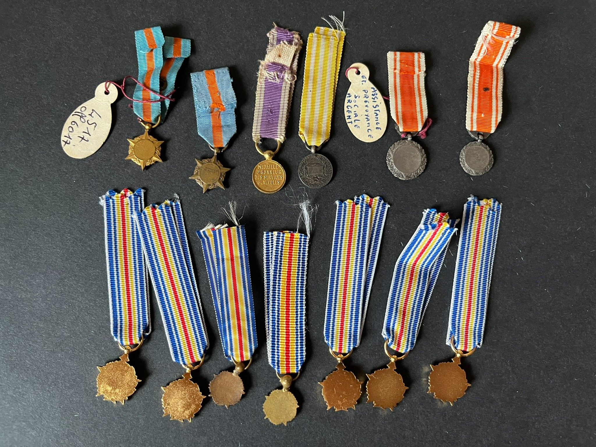 FRANCE , 13 pieces, set of 7 miniatures of the Wounded Insignia, one with enamel chips, and set of 7 miniatures of civil medals. FRANCE, 13 pieces, set of 7 miniatures of the Wounded Insignia, one with enamel chips, and set of 7 miniatures of civil medals