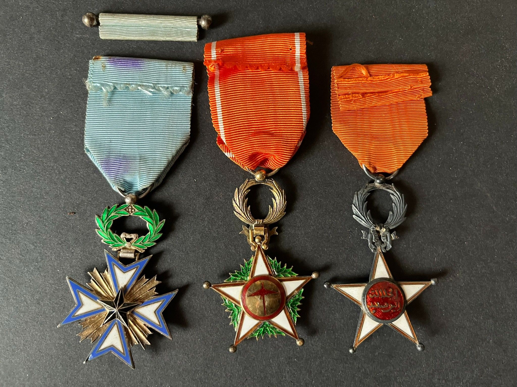 FRANCE Colonies , 3 pieces, Knight of the Order of the Black Star of Benin in silver with its Dixmude clasp, Knight of the Order of Ouissam Alaouite in silver with orange ribbon pre-1934, Officer of the Order of Ouissam Alaouite in silver with orange ribbon pre-1934. FRANCE Colonies, 3 pieces, Knight of the Order of the Black Star of Benin in silver with its Dixmude clasp, Knight of the Order of Ouissam Alaouite in silver with orange ribbon pre-1934, Officer of the Order of Ouissam Alaouite in silver with 1934 ribbon
