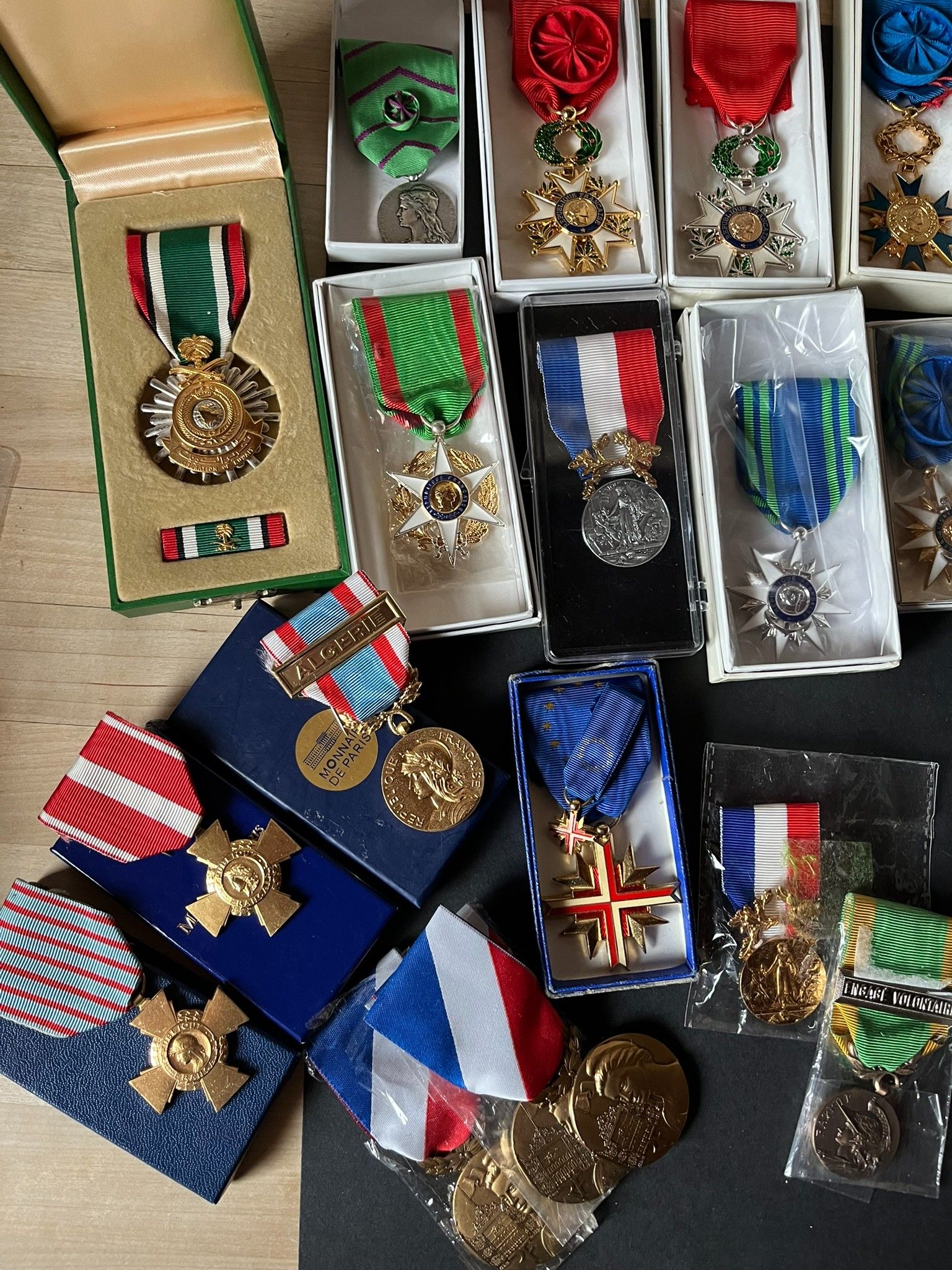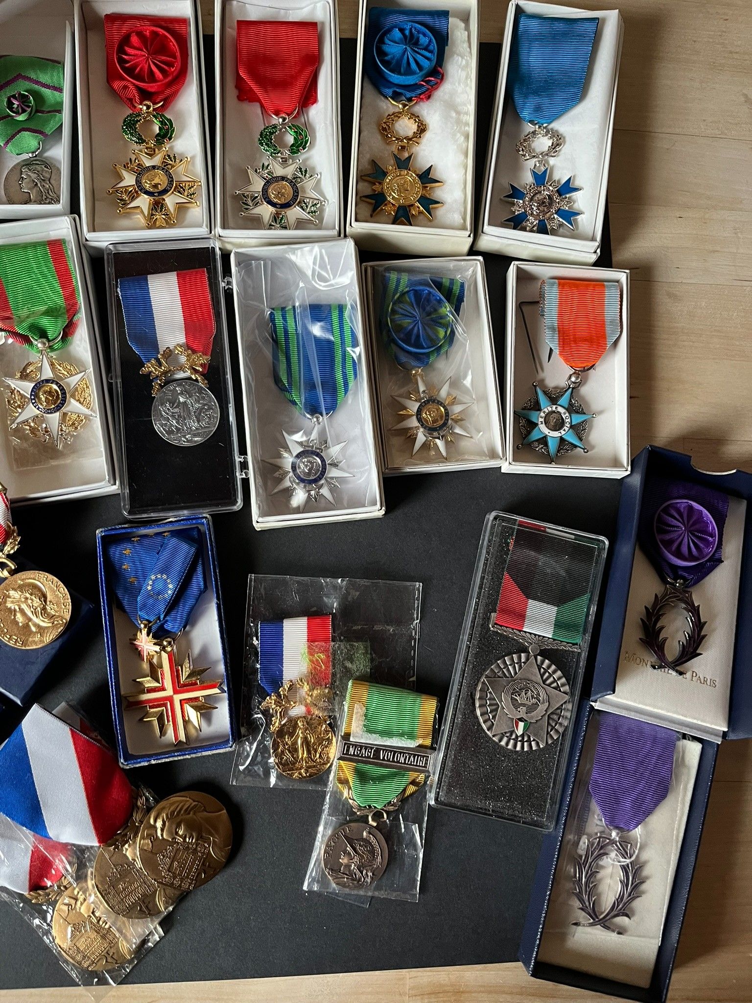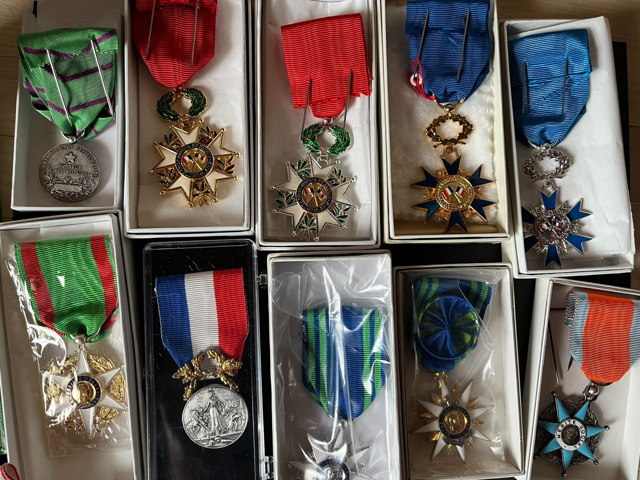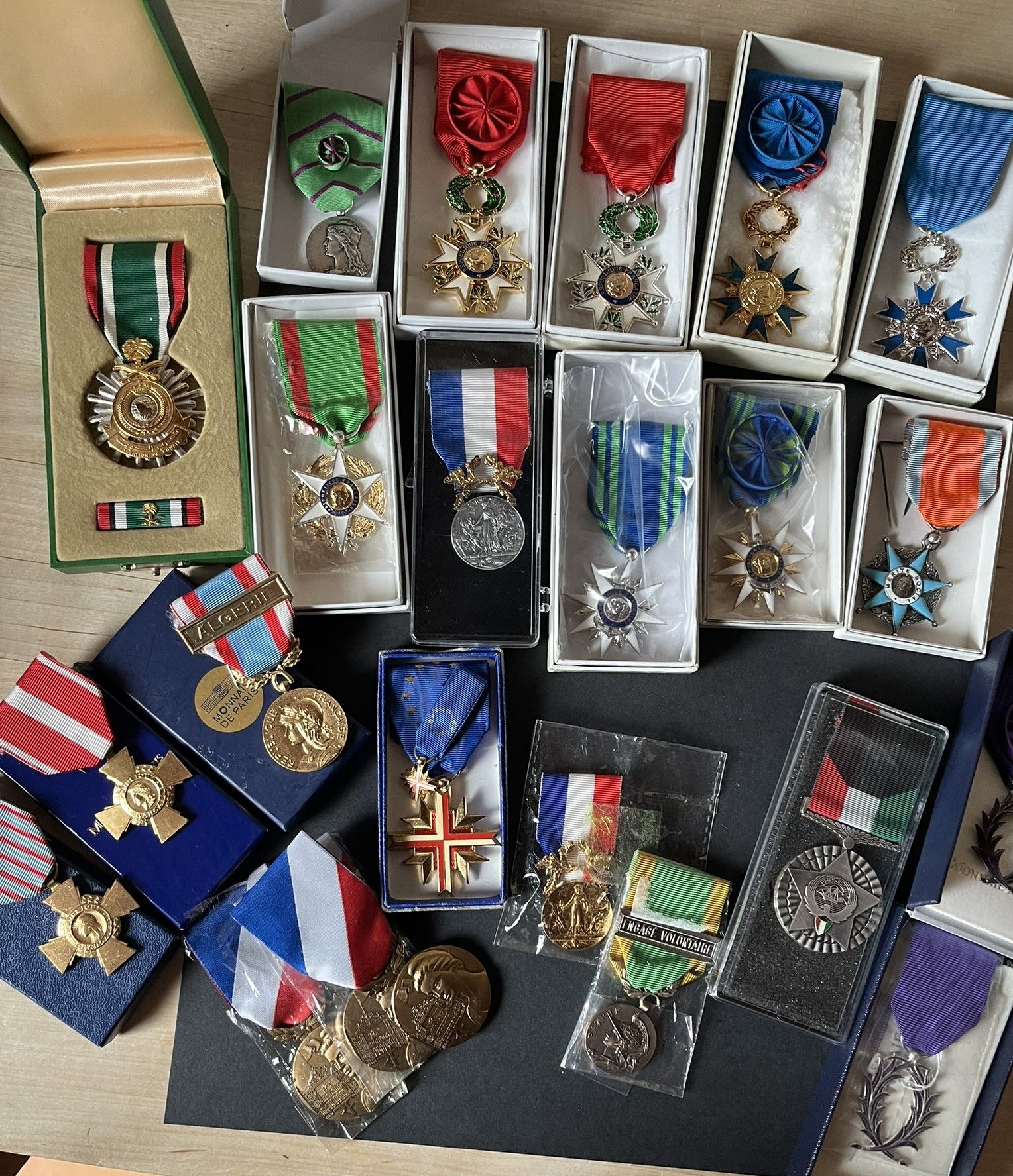 FRANCE , coins , large lot of new medals mostly in Monnaie de Paris and Maison Bacqueville boxes including , chevalier et officier de l'ordre de la Légion d'Honneur V République, chevalier et officier de l'ONM, chevalier Mérite Social, chevalier Mérite Agricole, chevalier et officier du Mérite Maritime, chevalier et officier des Palmes Académiques, médaille Pénitenciaire, 3 médailles en bronze de la Sécurité intérieure, , croix et médailles diverses, médaille saoudienne de la Libération du Koweit dans son coffret et médaille Koweiti. FRANCE, large set of mostly new medals in original boxes from the Paris Mint and Maison Bacqueville including knight and officer of the Legion of Honour Fifth Republic, knight and officer of the National Order of Merit, knight of the Social Merit, knight of the Agricultural Merit, knight and officer of the Maritime Merit, knight and officer of the Academic Palms, Penitentiary Medal, three bronze medals of Internal Security, various crosses and medals, Saudi Medal of the Liberation of Kuwait in its case and Kuwaiti Medal