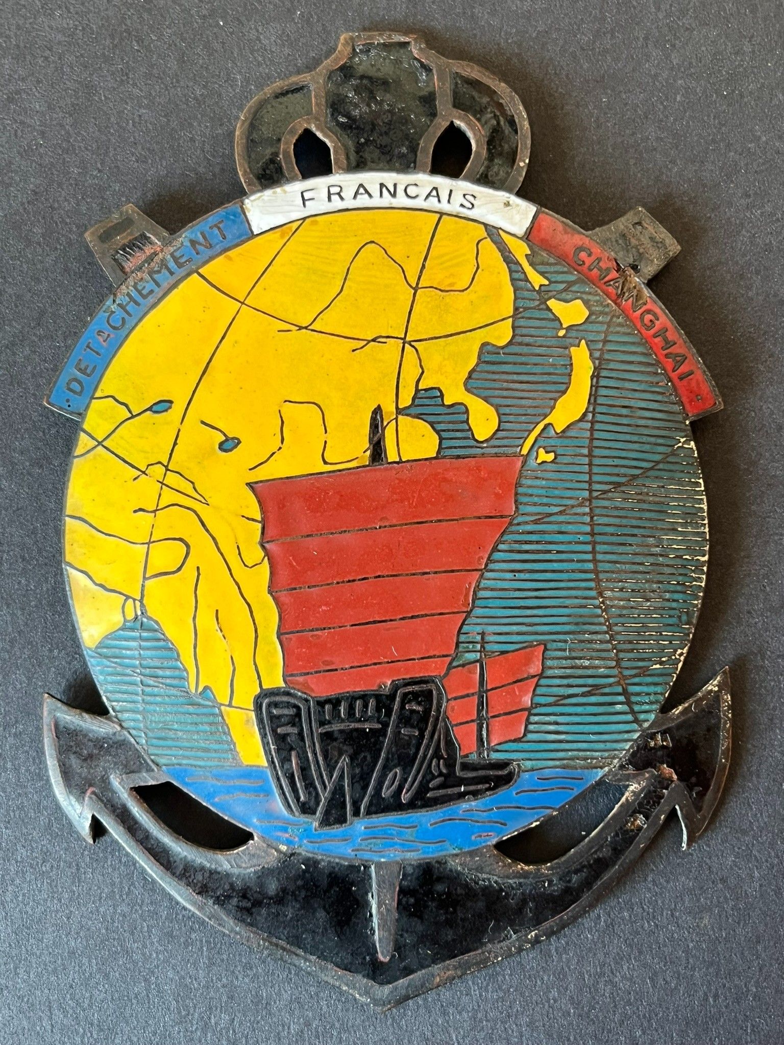 Large domed enameled office badge of the French Detachment of Shanghai DFC Chinese manufacture 117 x 80mm missing wooden display support and mounting. Large domed enameled office badge of the French Detachment of Shanghai DFC Chinese manufacture 117 x 80mm missing wooden display support and mounting