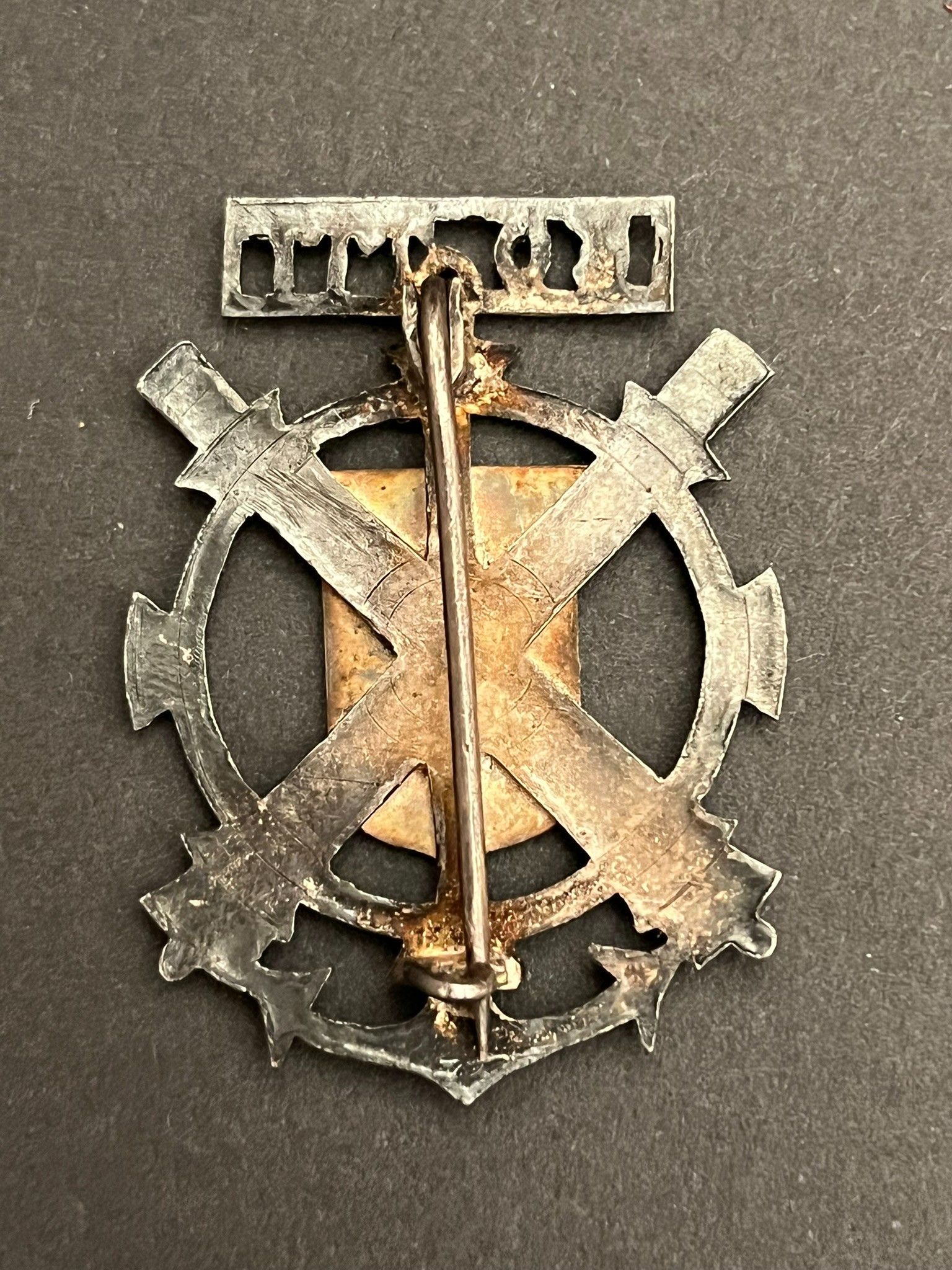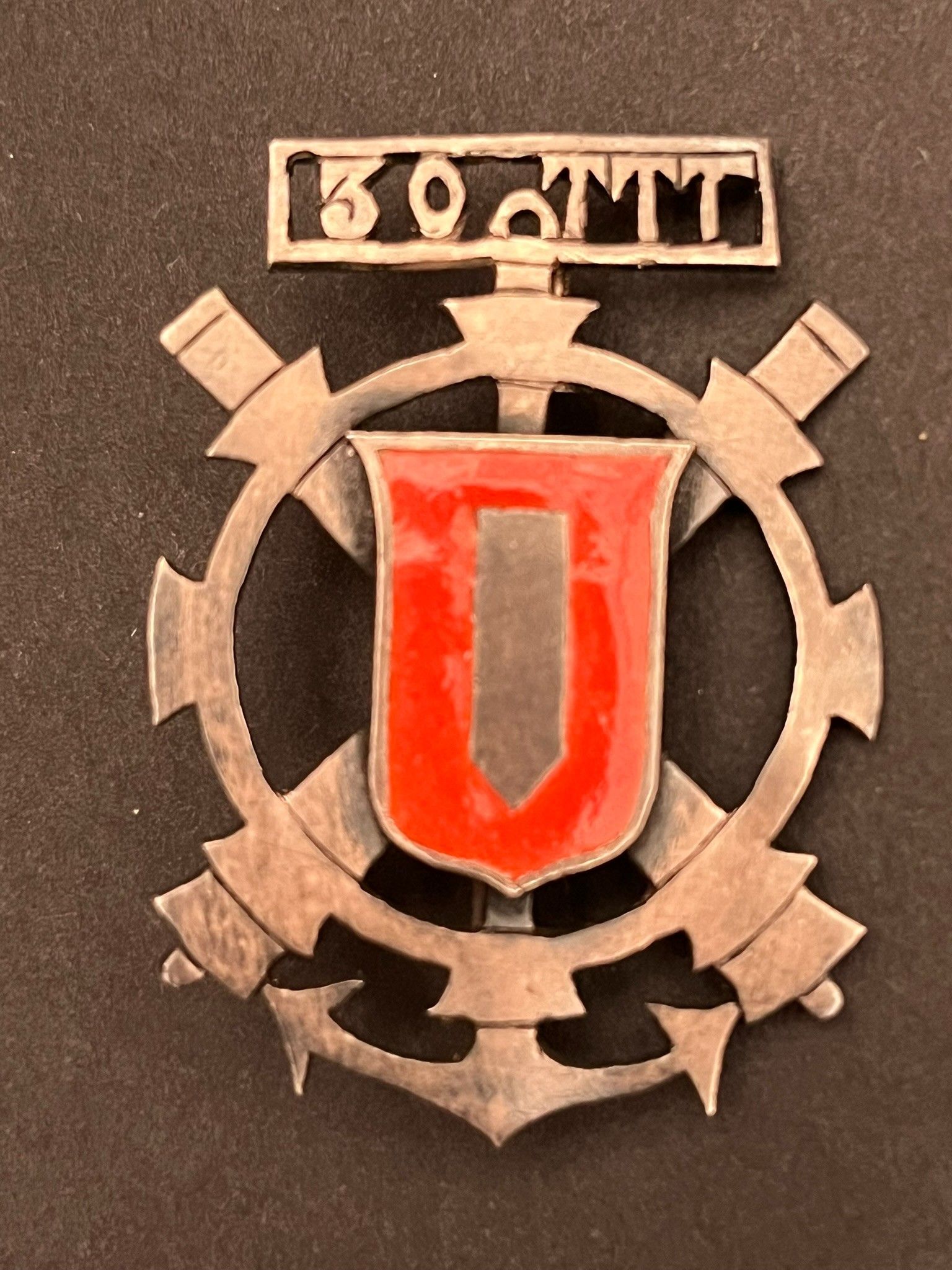Badge of the 30th All-Terrain Tractor Battery cut-out metal with applied enameled centre and hinged pin local manufacture 48 x 32mm. Badge of the 30th All-Terrain Tractor Battery cut-out metal with applied enameled centre and hinged pin local manufacture 48 x 32mm