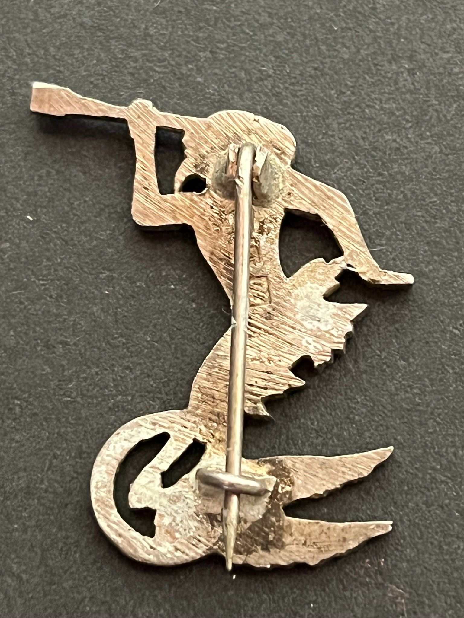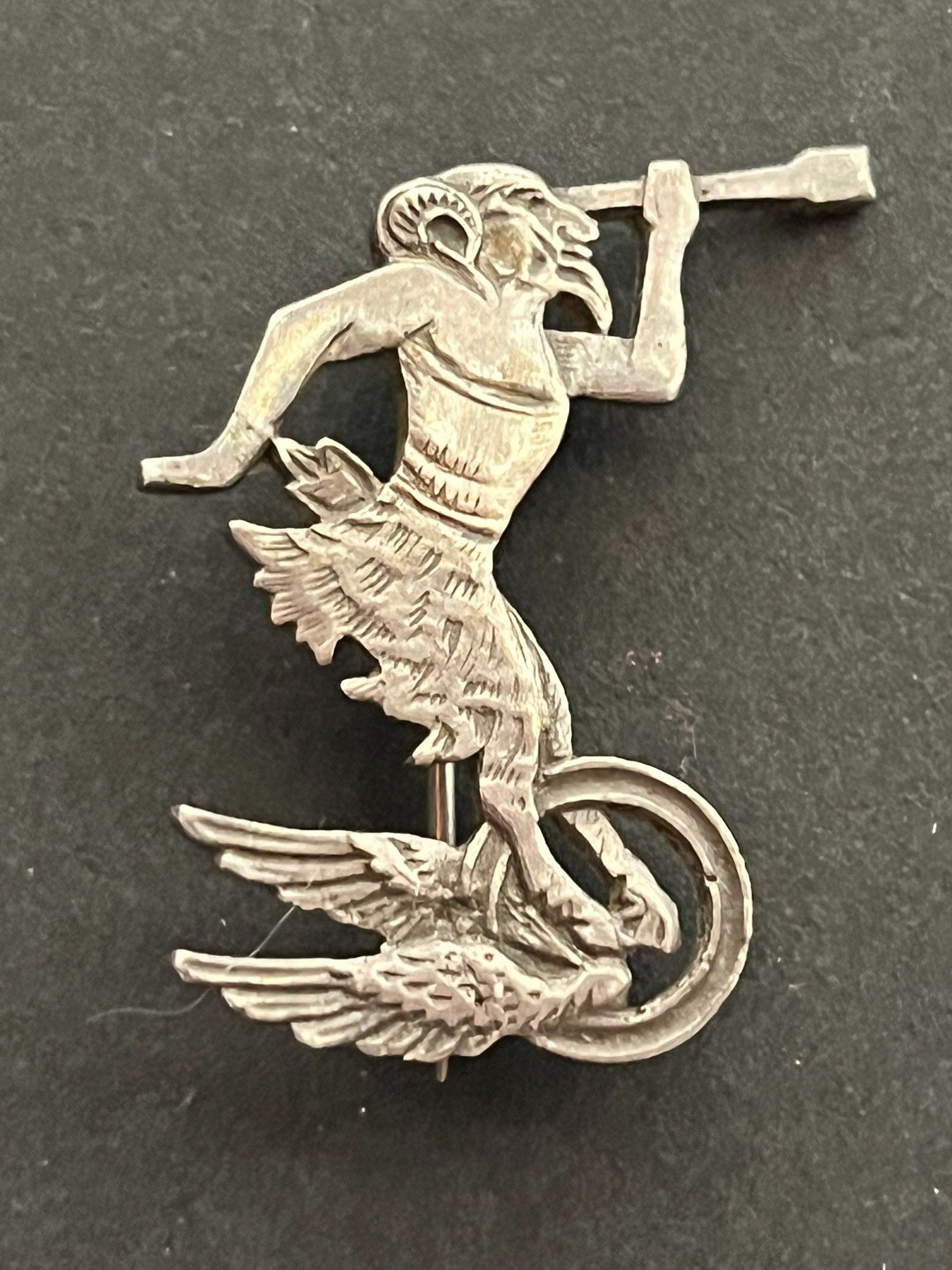 Satyr with telescope badge 2nd squadron GR I/55 local silver manufacture hallmarked 860 and DG (ex SAL 263). Badge Satyr with telescope 2nd Squadron GR I/55 local manufacture silver hallmarked 860 and DG (ex SAL 263)