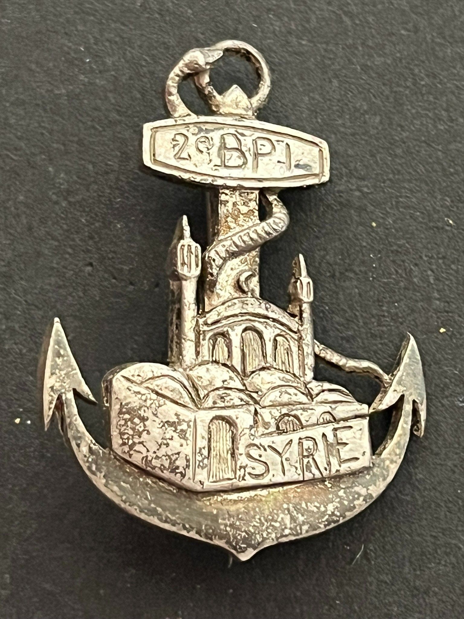 Badge 2nd BPL Pioneers Battalion of the Levant locally made in Syria silver 41 x 31mm. Badge 2nd BPL Pioneers Battalion of the Levant locally made in Syria silver 41 x 31mm