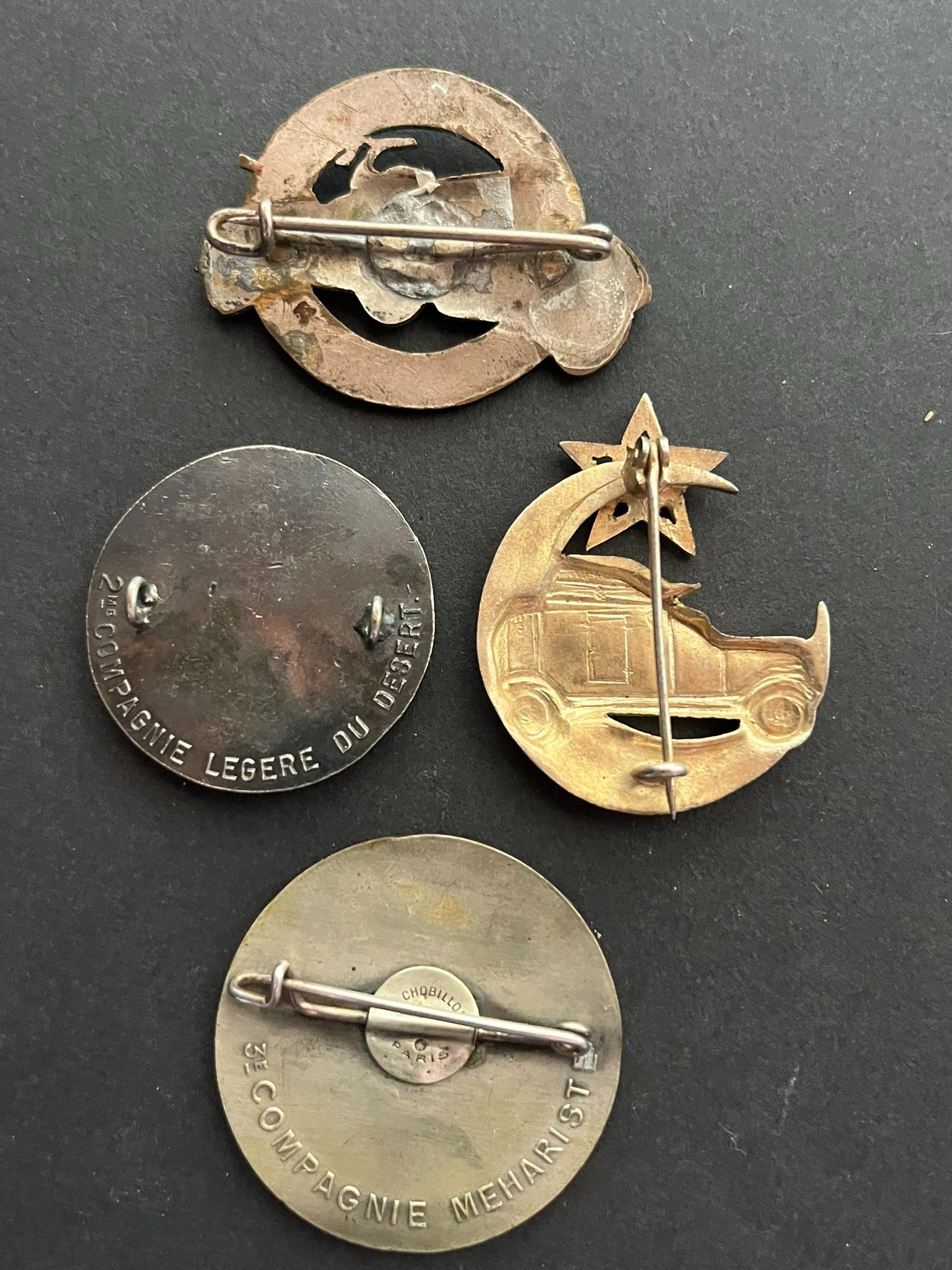 Lot of 4 pieces, badge Auto Mitrailleuses Légères du Désert large model without mark, Auto Mitrailleuses du Levant silvered metal without mark, 2nd Light Company of the Desert without mark (Delande), 3rd Méhariste Company of the Desert enamelled (Chobillon). Lot of 4 pieces, badge Light Armored Car Company of the Desert large model without mark, Levant Armored Car Company silvered metal without mark, 2nd Light Company of the Desert (Delande) without mark, 3rd Méhariste Company of the Levant enameled (Chobillon)