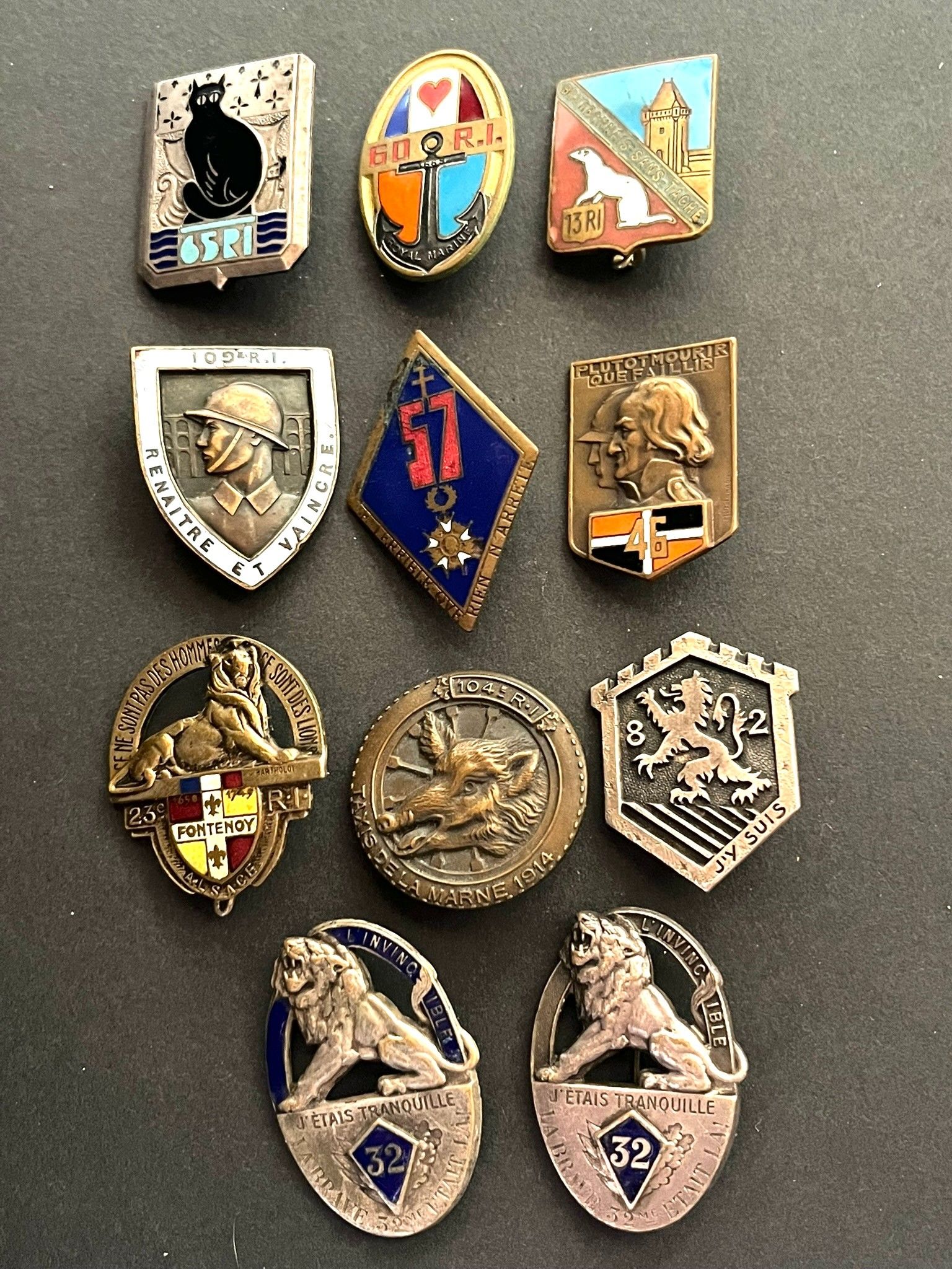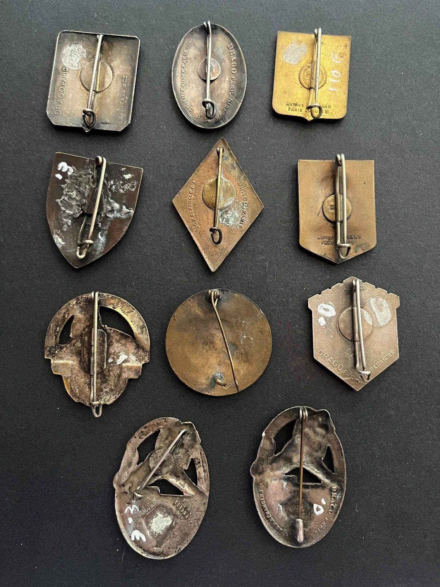 Lot of 11 pieces, 13 RI AB filed, 23 RI without, 32 RI Drago Ber, 32 RI variant, 46 RI AB filed, 57 RI Drago Ber, 60 RI Drago Ber, 65 RI Drago Ber, 82 RI Drago Ber, 109 RI without welded attachment, 104 RI without. Lot of 11 pieces, 13th Infantry Regiment AB marked, 23rd without mark, 32nd Infantry Regiment Drago Béranger, 32nd Infantry Regiment variant, 46th Infantry Regiment AB marked, 57th Infantry Regiment Drago Béranger, 60th Infantry Regiment Drago Béranger, 65th Infantry Regiment Drago Béranger, 82nd Infantry Regiment Drago Béranger, 109th Infantry Regiment without mark repaired attachment, 104th Infantry Regiment without mark