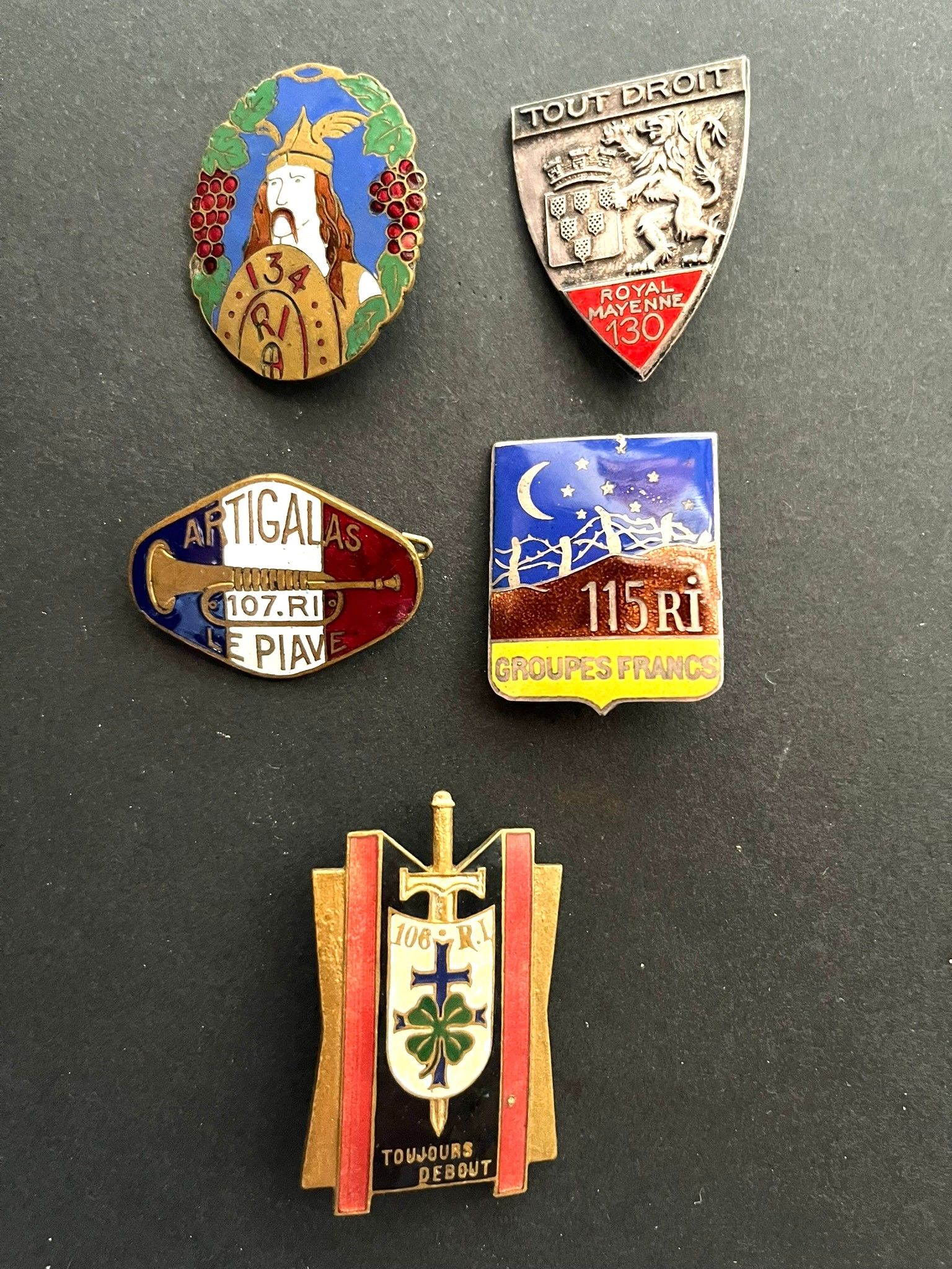 Lot of 5 pieces, 106th Infantry Regiment without mark, 107th Infantry Regiment AB marked, 115th Infantry Regiment Franc Group Chobillon, 130th Infantry Regiment without mark, 134th Infantry Regiment Franc Group Chobillon. Lot of 5 pieces, 106th Infantry Regiment without mark, 107th Infantry Regiment AB marked, 115th Infantry Regiment Franc Group Chobillon, 130th Infantry Regiment without mark, 134th Infantry Regiment Chobillon