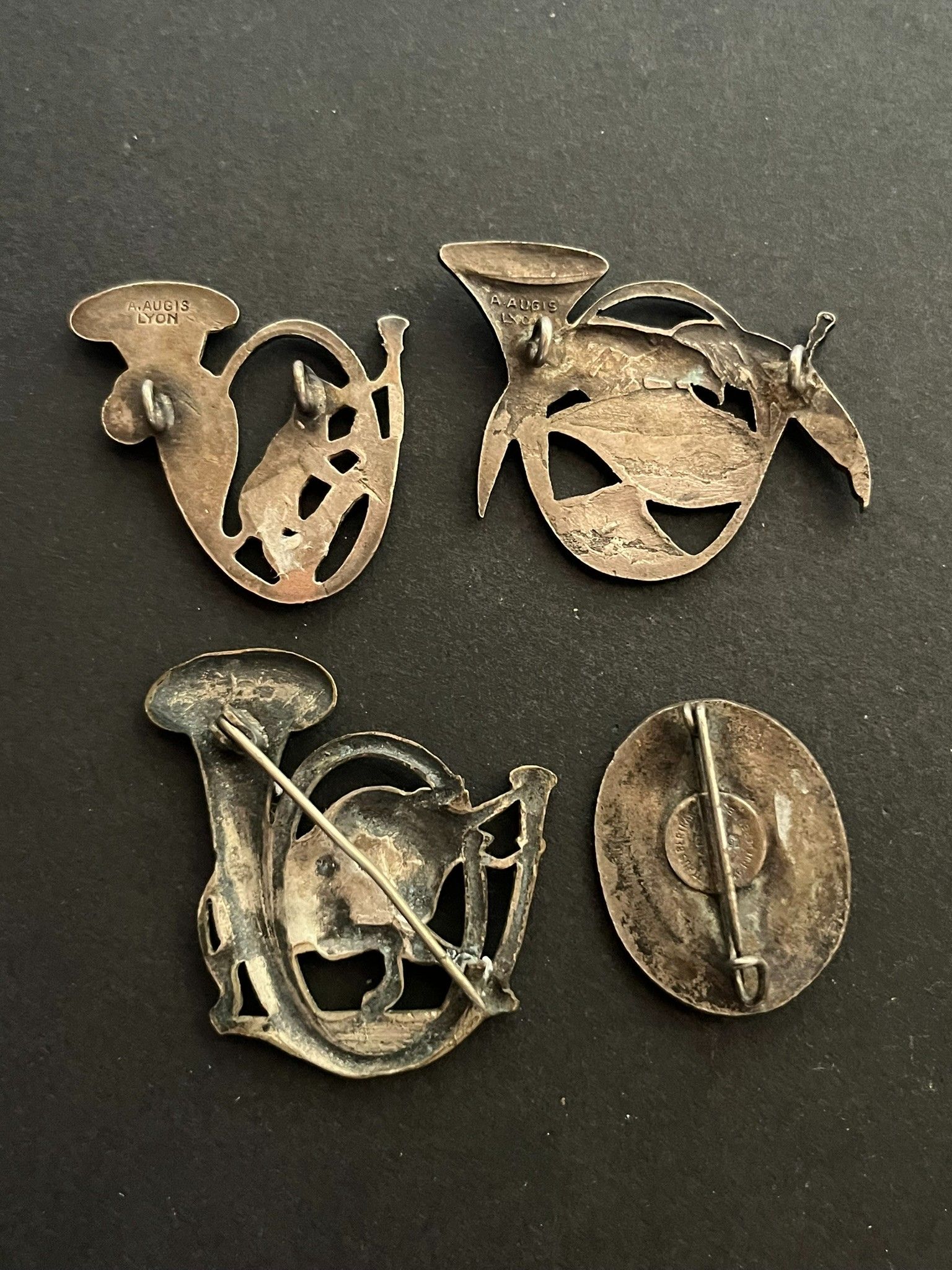 Lot 4 pieces, 24 BCA enamelled AB hallmark and address on pastille, 93 BCP A.Augis, 95 BCP A. Augis full, 105 BCA without, hook incomplete. Lot of 4 pieces, 24th Alpine Chasseurs Battalion enameled AB punched and address on backplate, 93rd Light Infantry Battalion A. Augis, 95th Light Infantry Battalion A. Augis solid, 105th Alpine Chasseurs Battalion without mark incomplete hook