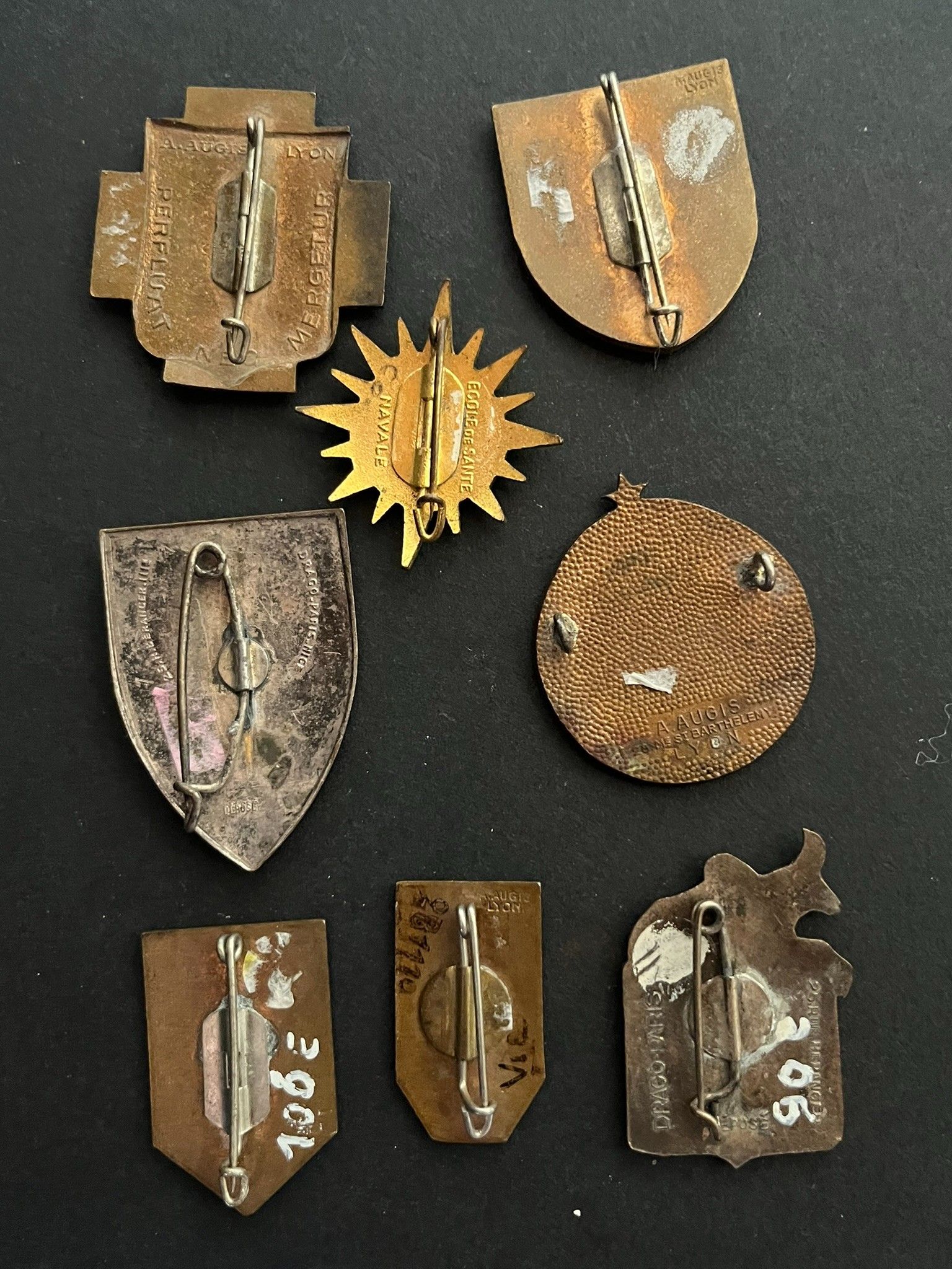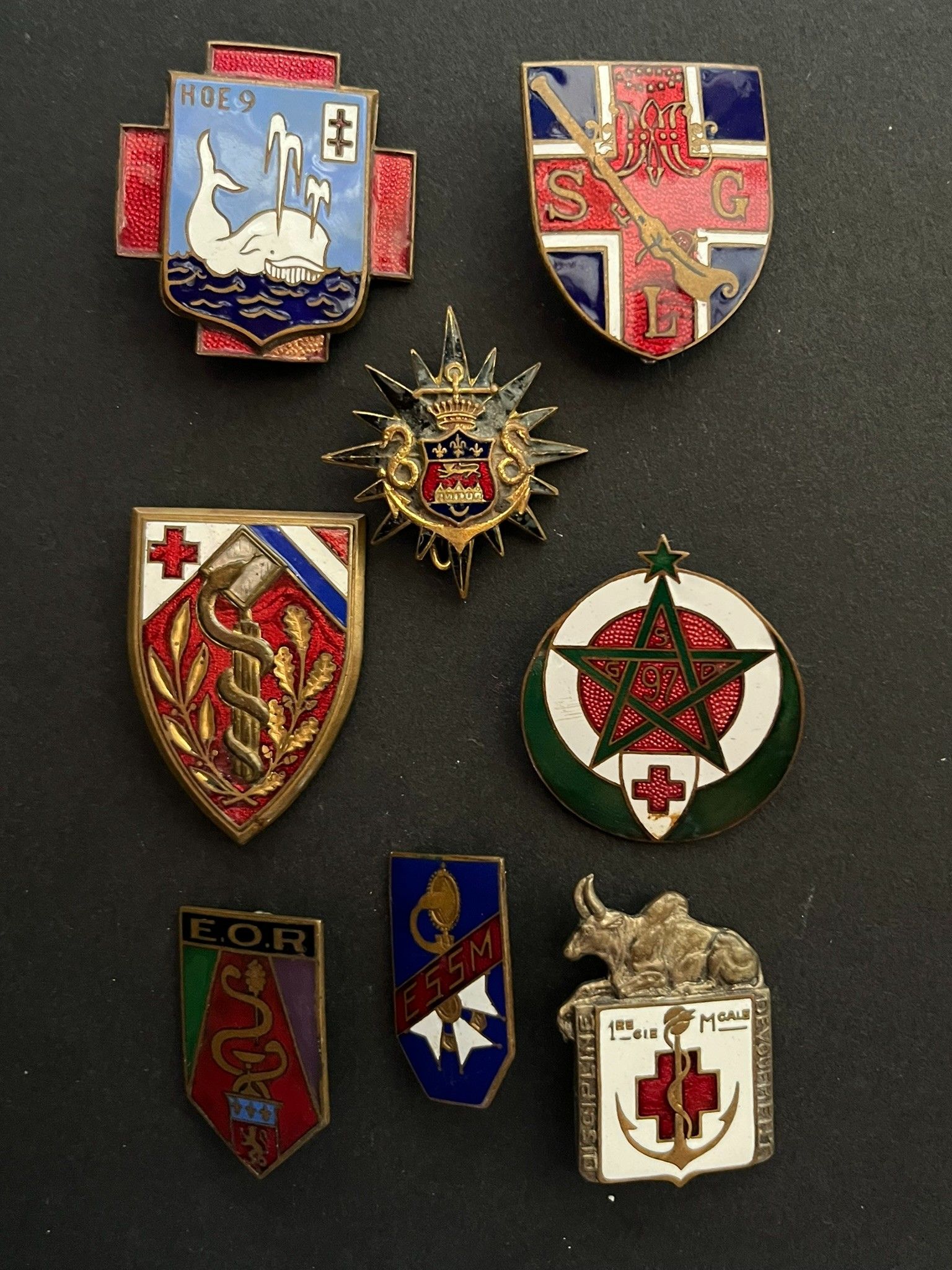 Lot of 8 pieces, ESSM without mark, EOR without mark, Naval Medical School without mark, Sidi Abdallah Hospital Caen Augis, Hôpital St Genis Laval Augis, Santé Maginot Drago Ber, GSD 97 Augis , éclats, Santé Madagascar Drago Ber. Lot of 8 pieces, ESSM without mark, EOR without mark, Naval Medical School without mark, Sidi Abdallah Hospital Caen Augis, St Genis Laval Hospital Augis, Maginot Health Service Drago Béranger, GSD 97 Augis with chips, Madagascar Health Service Drago Béranger