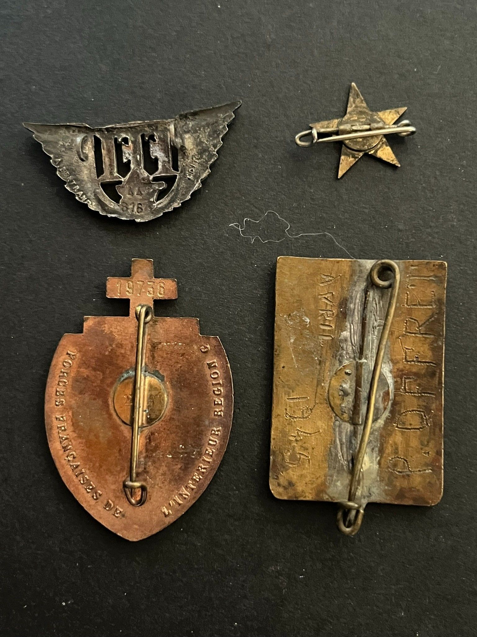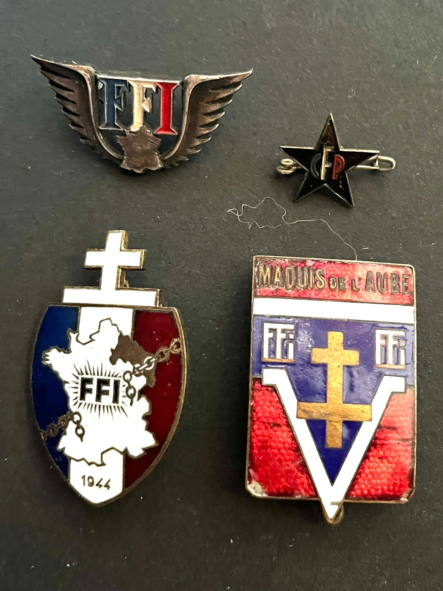 Lot of 4 pieces, large model Maquis de l'AUBE enameled engraved P. Offret April 1945 repaired pin, Paul Gabriel Offret born 1927 in Troyes recognized as FFI with file in SHAT, FFI painted numbered 44616 AB, FFI Region C enameled numbered 19736 punch AB, miniature Corps Francs Pommiès painted. Lot of 4 pieces, large model Maquis de l'Aube enameled engraved P. Offret April 1945 repaired pin, Paul Gabriel Offret born 1927 in Troyes recognized as FFI with file in SHAT, FFI painted numbered 44616 AB, FFI Region C enameled numbered 19736 AB punch, miniature Corps Francs Pommiès painted