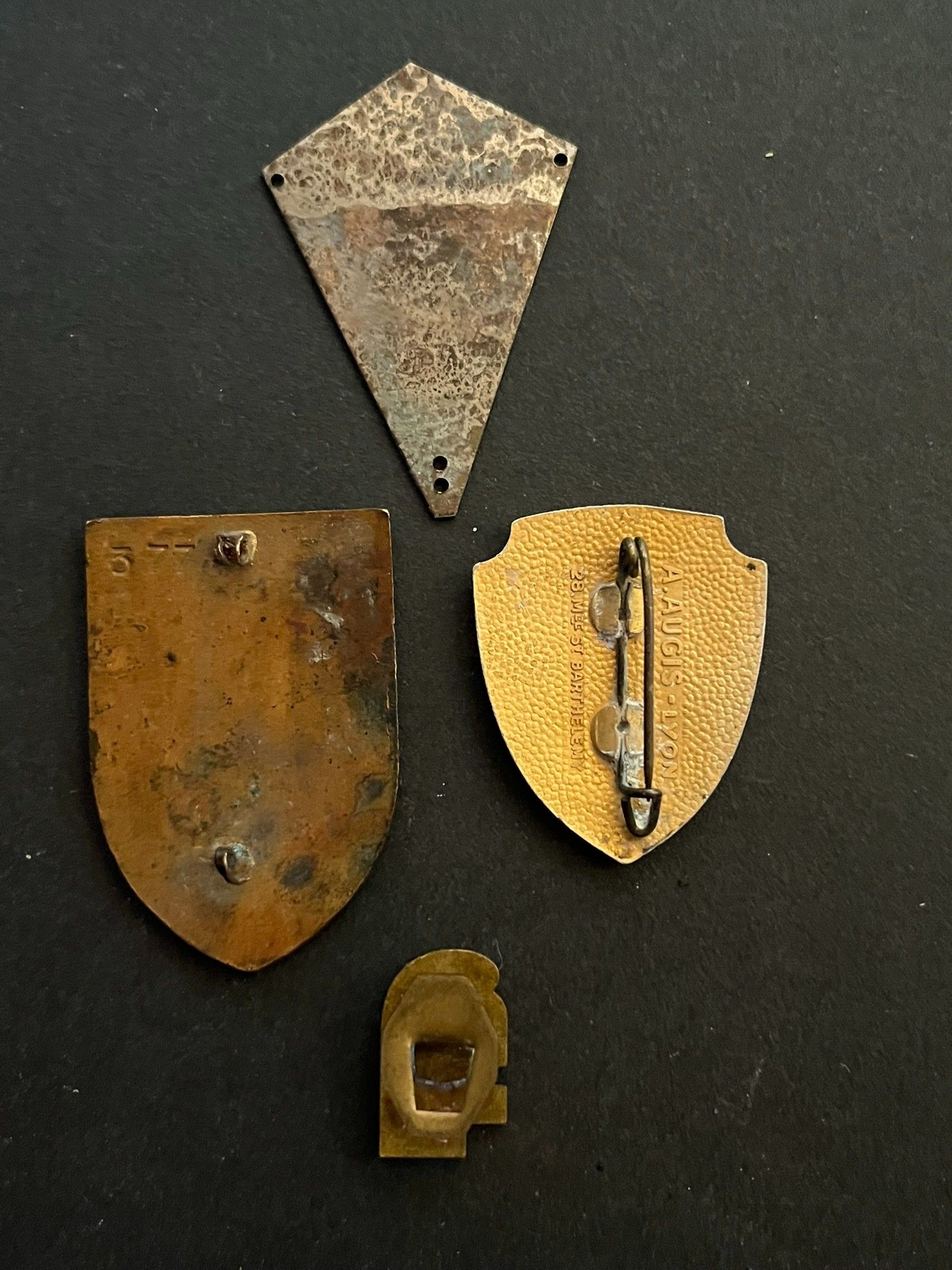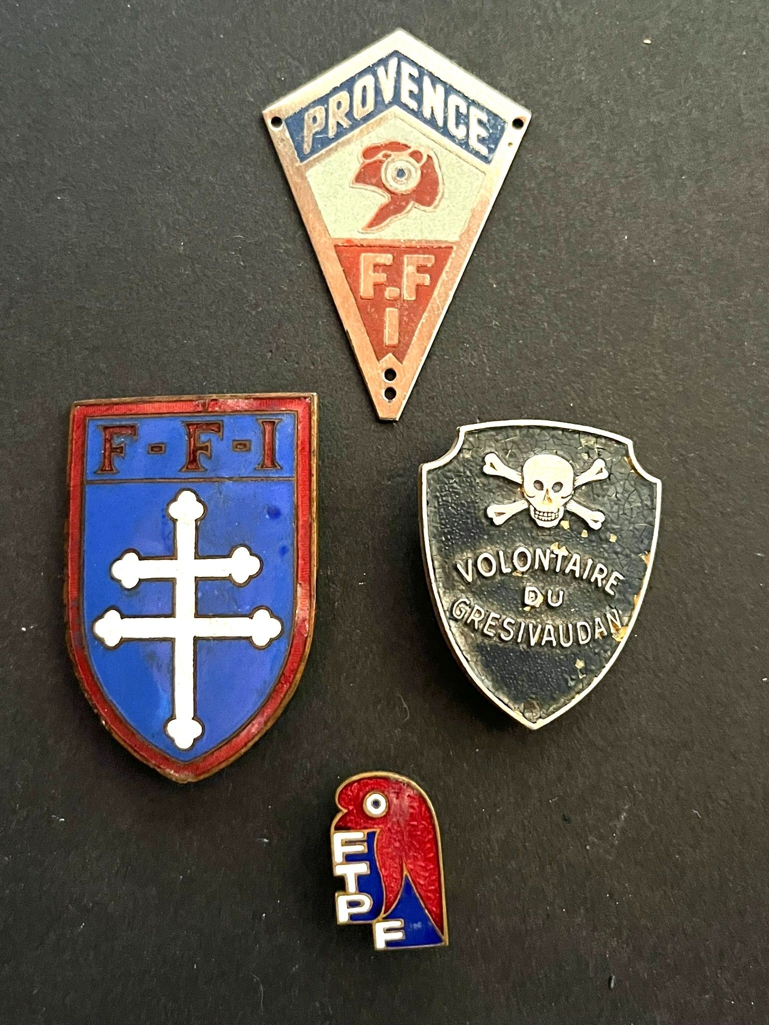 Lot 4 pieces, FFI PROVENCE painted chromed metal to sew, FFI Bouches du Rhône numbered 377, pin missing, Volontaires du Grésivaudan (Isère) 2nd edition painted gilded aluminium A. Augis, enamelled buttonhole FTPF. Lot of 4 pieces, FFI Provence chromed painted metal to sew, FFI Bouches-du-Rhône numbered 377 missing pin, Volunteers of Grésivaudan (Isère) second edition gilded aluminium painted A. Augis, enameled FTPF lapel pin