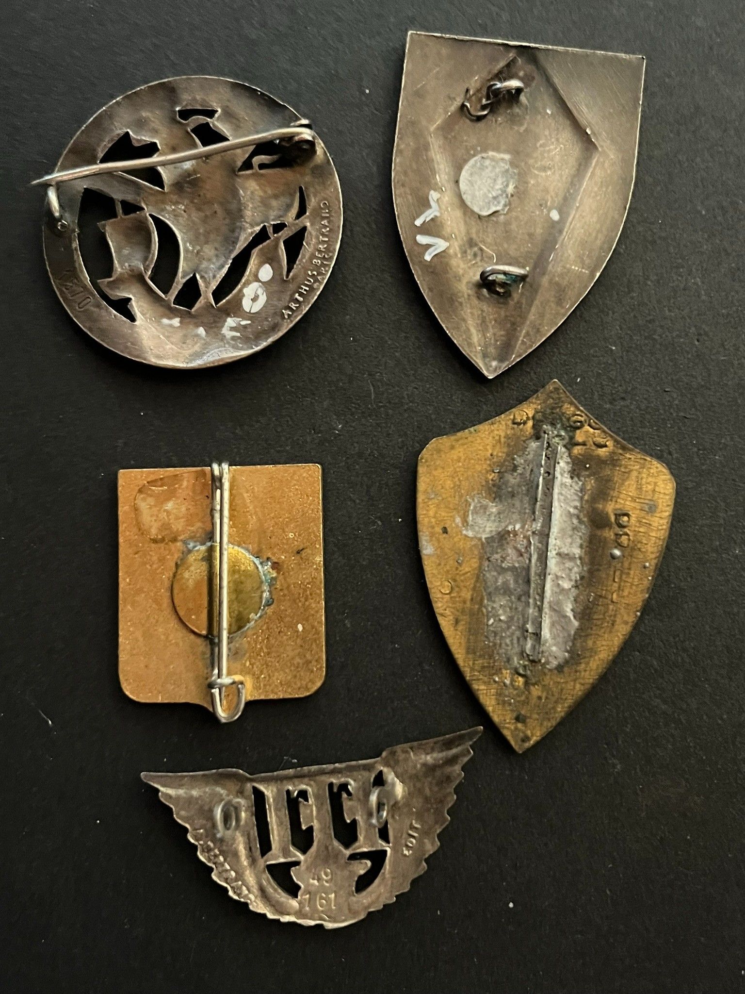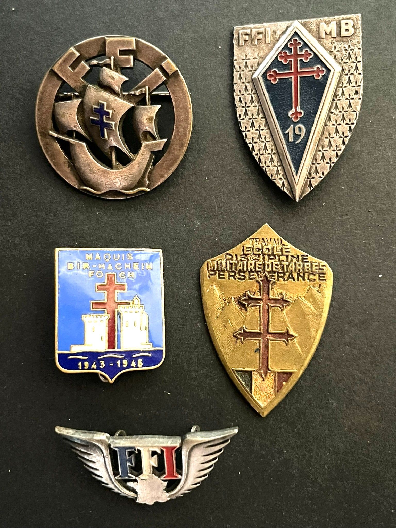 Lot of 5 pieces, Maquis Bir,Hakeim and Foch enameled without mark, FFI Cadre School of Tarbes painted missing clasp, FFI painted numbered 49161 AB, FFI Paris Regiment enameled numbered 1570 AB, FFI MB de la 19 DI painted missing clasp. Lot of 5 pieces, Maquis Bir Hakeim and Foch enameled without mark, FFI Cadre School of Tarbes painted missing clasp, FFI painted numbered 49161 AB, FFI Paris Regiment enameled numbered 1570 AB, FFI MB of the 19th Infantry Division painted without mark