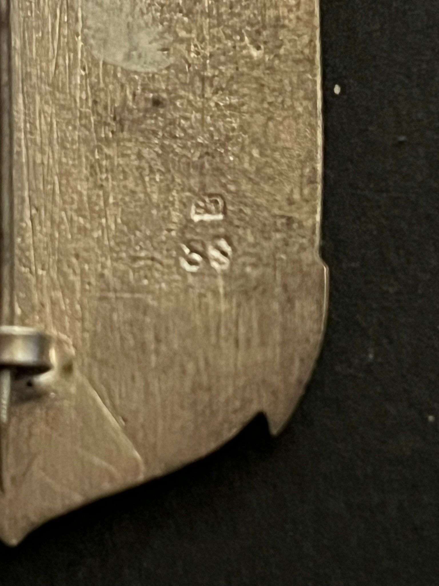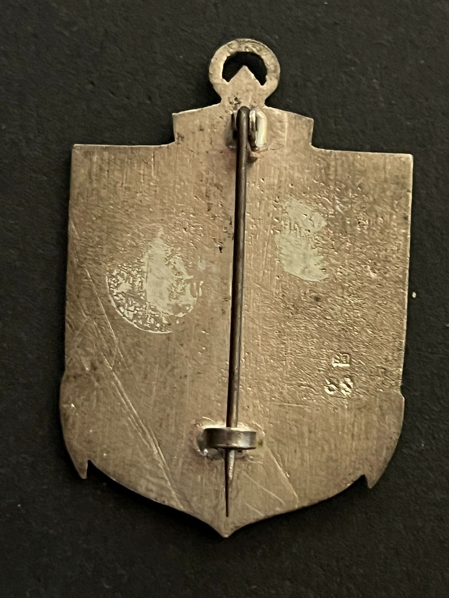 Insigne du Bataillon du Pacifique argent plat avec épingle à bascule fabrication du Levant numéroté 83 et poinçonné 90 Badge of the Pacific Battalion flat silver with hinged pin Levant manufacture numbered 83 and punched 90
