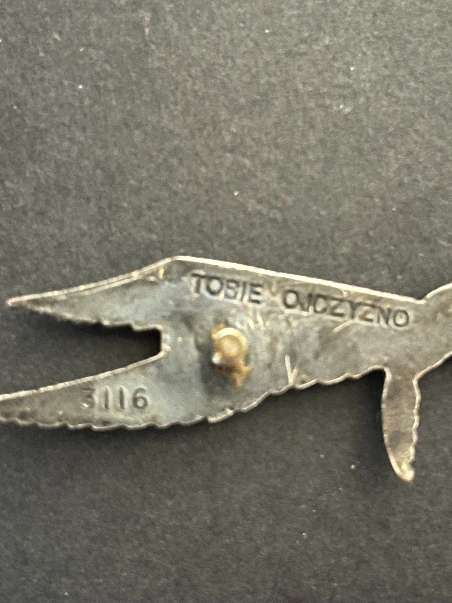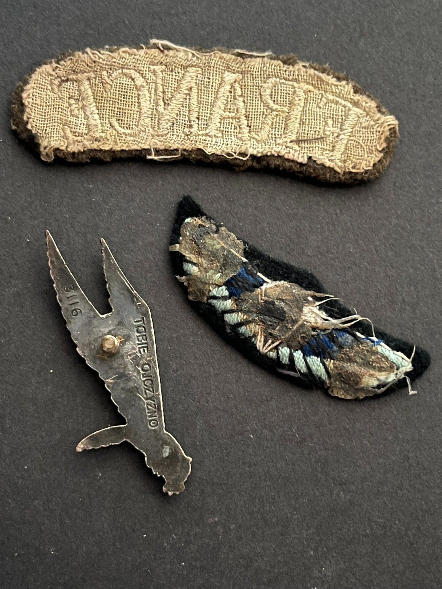Lot 3 pieces of British manufacture, title FRANCE fil blanc sur kaki grand modèle porté, brevet de parachutiste SAS porté , brevet de parachutiste Polonais numéroté 3116 , molette absente. Probably from a French member of the 4th SAS. Lot of 3 British-made pieces, title FRANCE white thread on khaki large worn model, SAS Parachutist brevet worn, Polish Parachutist brevet numbered 3116 with missing wheel, likely from a French member of the 4th SAS