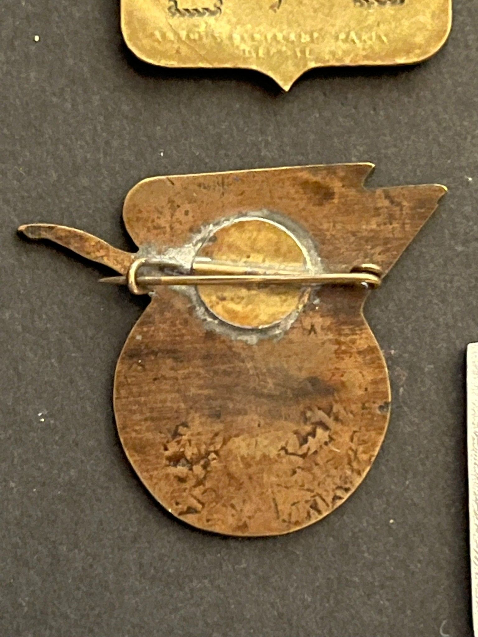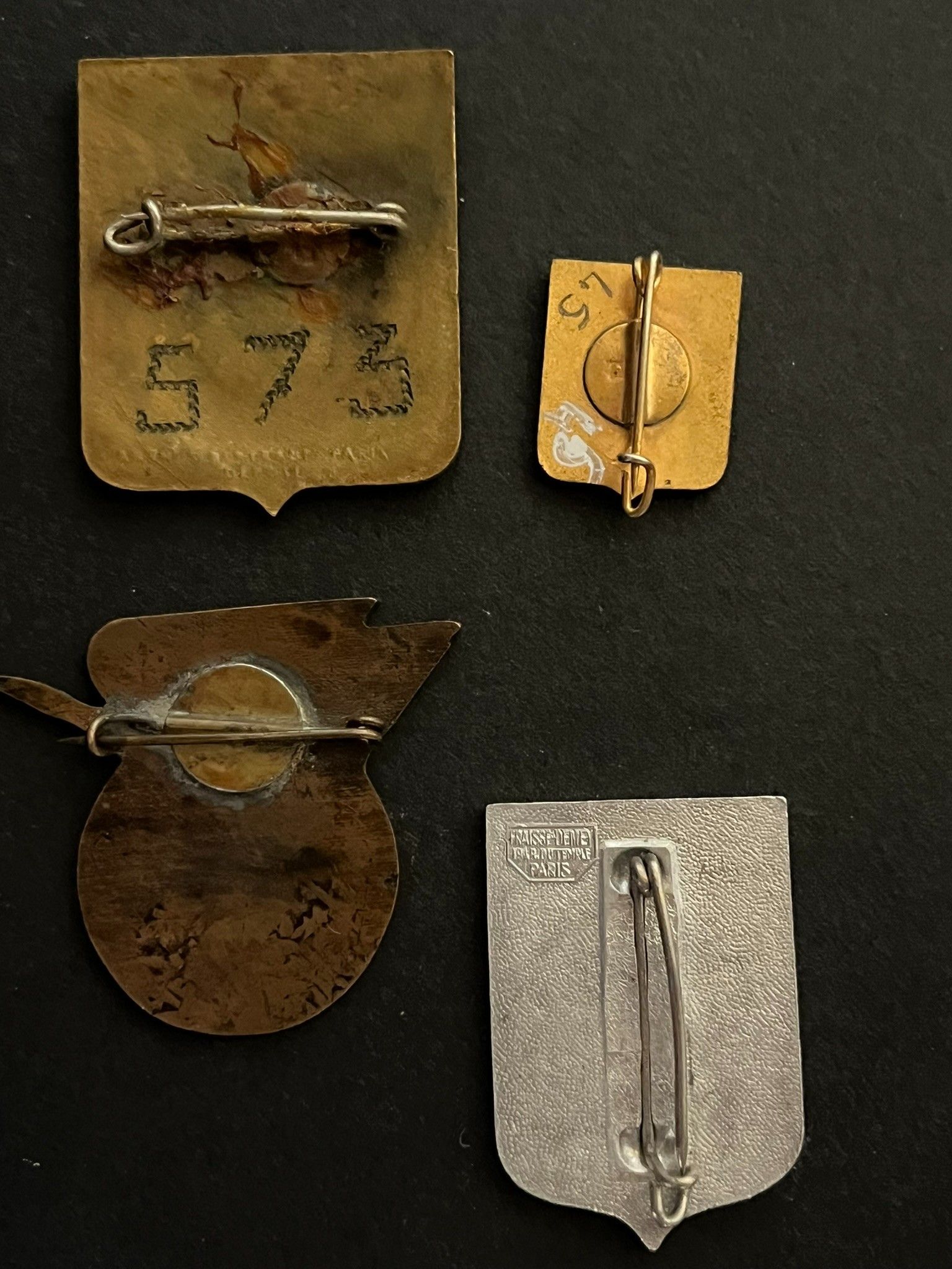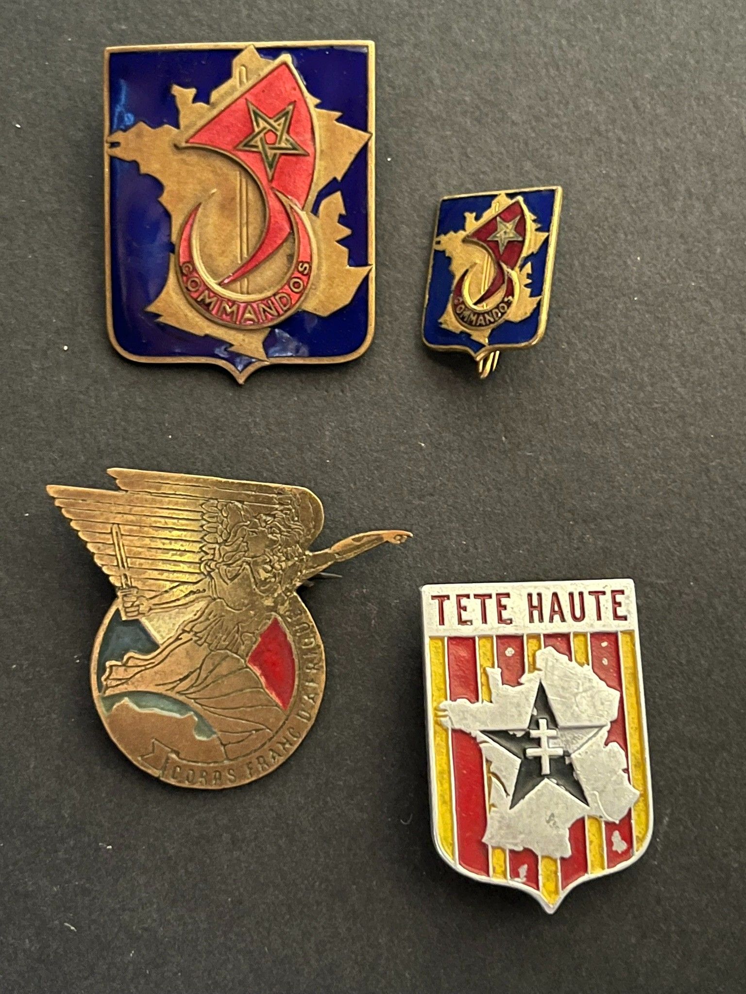 Lot of 4 pieces, Commandos d'Afrique TETE HAUTE (ex FFI Provence) painted aluminium Fraisse Demey, large enameled Commandos d'Afrique badge numbered 573 AB marked, original pin repaired, enameled buttonhole hallmarked AB, Corps Franc d'Afrique painted metal 38mm (Grazziani). Lot of 4 pieces, Commandos d'Afrique "Tête Haute" (ex FFI Provence) painted aluminium Fraisse Demey, large enameled Commandos d'Afrique badge numbered 573 AB marked, original pin repaired, enameled lapel badge AB punch, Corps Franc d'Afrique painted metal 38mm (Grazziani)