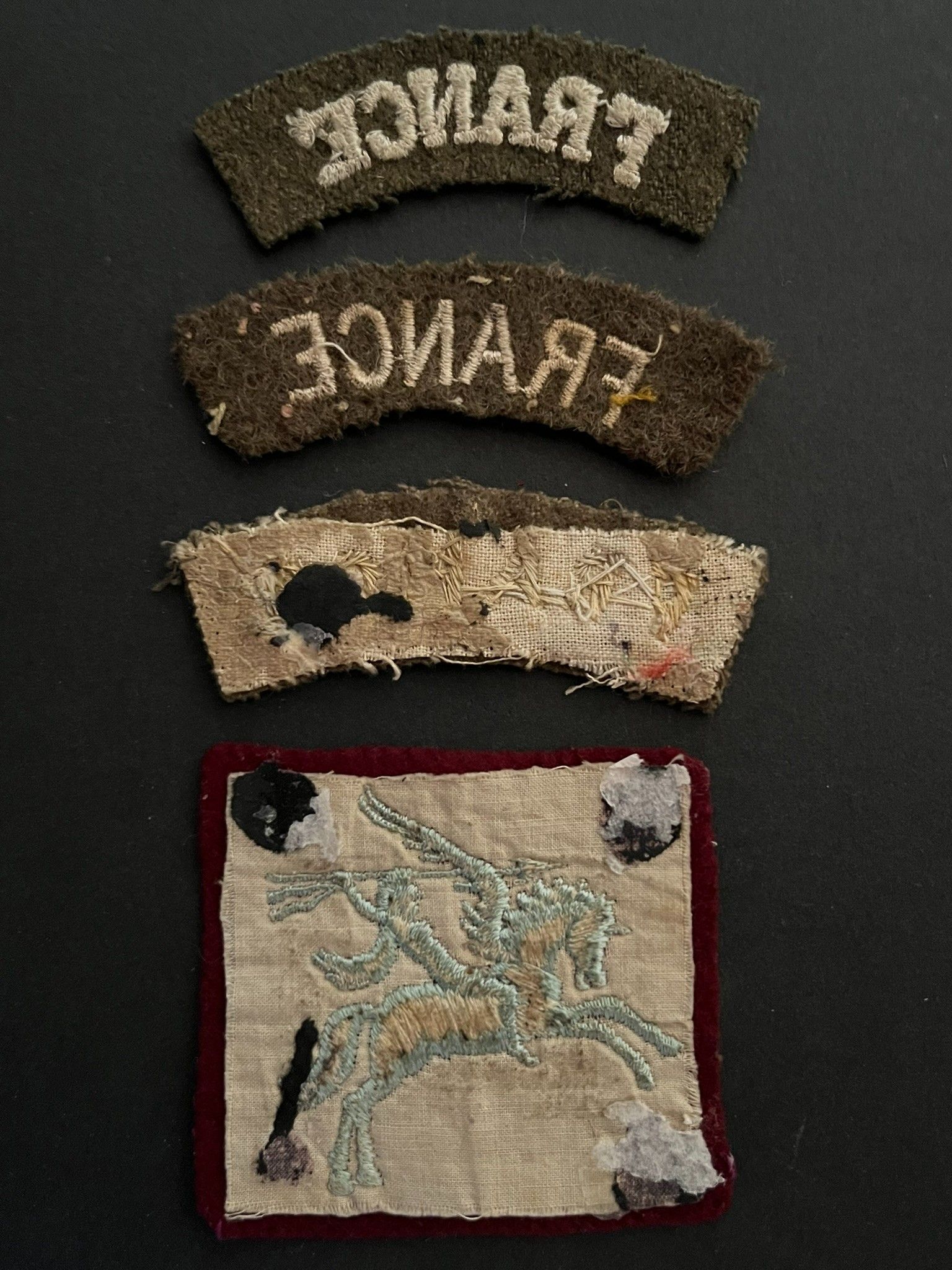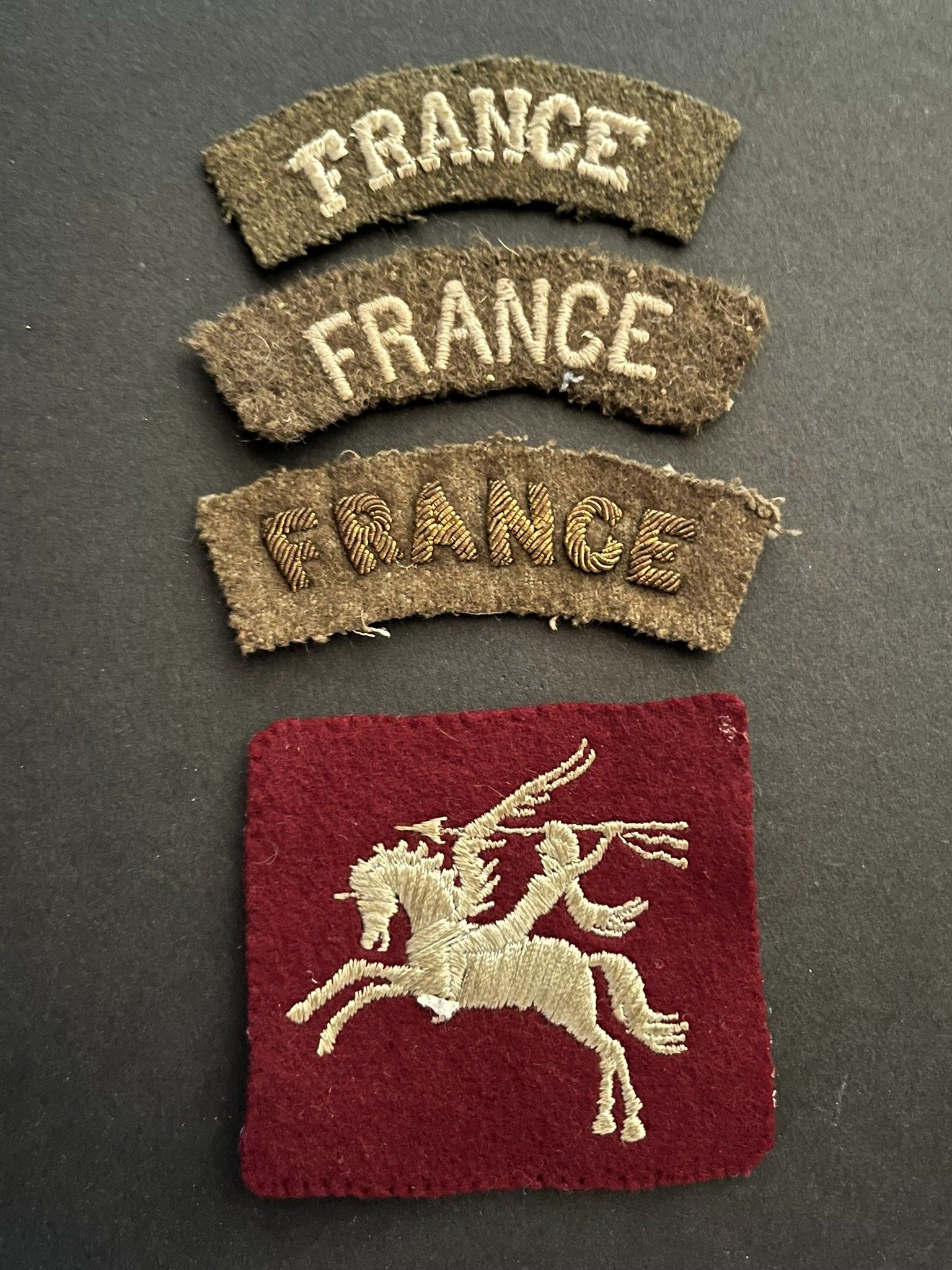 Lot 4 pièces tissu , title FRANCE , 1 canetille doré sur kaki , 1 brodé coton lettres fines sur kaki , 1 brodé coton lettres épaisses sur kaki , 1 Pégase des parachutistes britanniques brodé bleu ciel sur amarante , bras gauche. Lot of 4 fabric pieces, title FRANCE, one gold wire embroidered on khaki, one fine cotton letters on khaki, one thick cotton letters on khaki, one British Parachutists Pegasus blue on maroon left arm