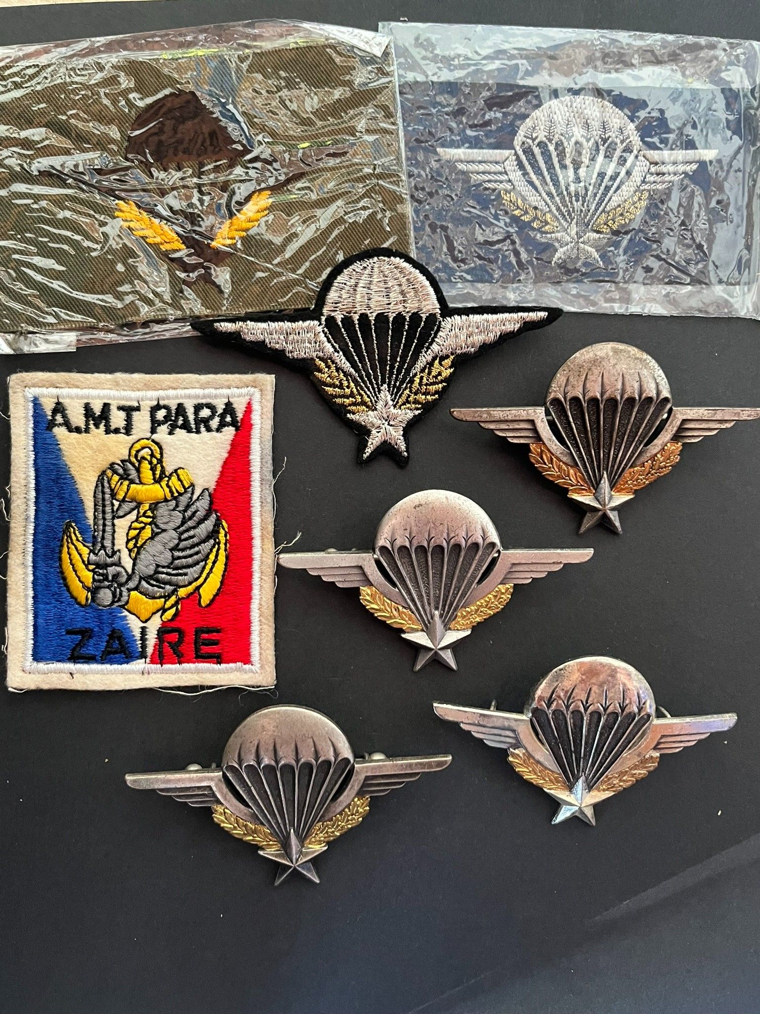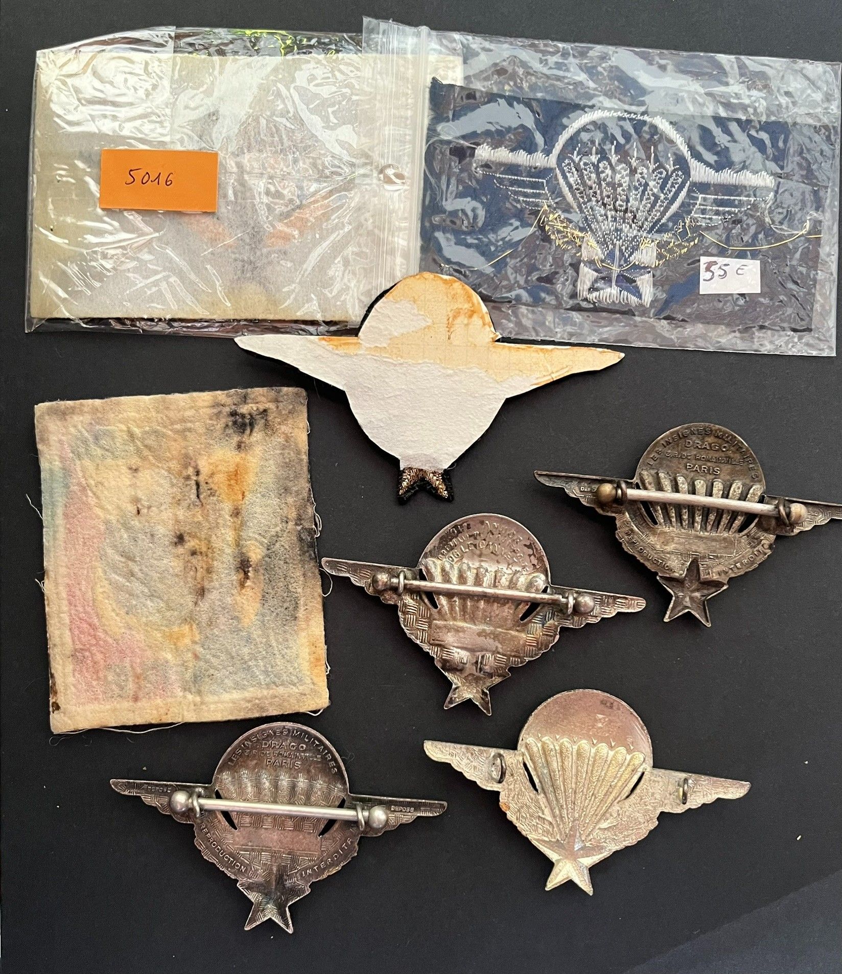 Lot of 8 pieces, Parachutist brevet model 1946 unnumbered without mark, two Parachutist brevets model 1946 unnumbered Drago Rom, Parachutist brevet model 1946 unnumbered Andor, three Parachutist brevets model 1946 in cloth and an A.M.T badge in cloth. Lot of 8 pieces, Parachutist brevet model 1946 unnumbered without mark, two Parachutist brevets model 1946 unnumbered Drago Rome, Parachutist brevet model 1946 unnumbered Andor, three fabric Parachutist brevets model 1946 and one fabric A.M.T badge
