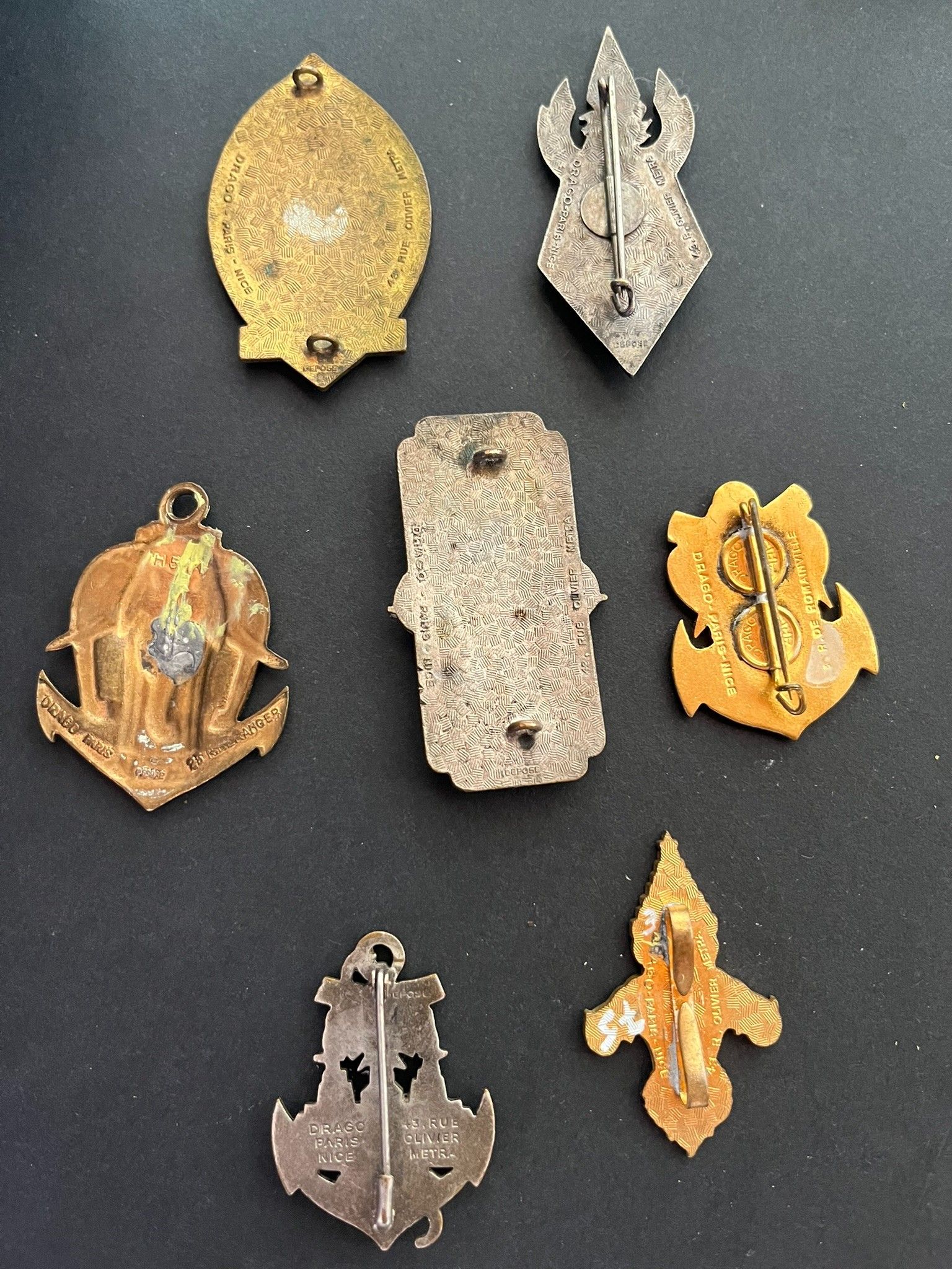 Lot of 7 pieces, Laotian Gendarmerie Drago OM, 2 BIL Drago OM, 3 BIL Drago OM, CCSL Drago Rom, CMILLAT Drago OM,2 GCL Drago Ber , without fastening, Laotian Royal Guard headdress badge with 2 Drago OM fastening tabs. Lot of 7 pieces, Laotian Gendarmerie Drago Overseas, 2nd BIL Drago Overseas, 3rd BIL Drago Overseas, CCSL Drago Rome, CMILLAT Drago Overseas, 2nd GCL Drago Béranger without pin, Royal Laotian Guard cap badge with two fixing lugs Drago Overseas