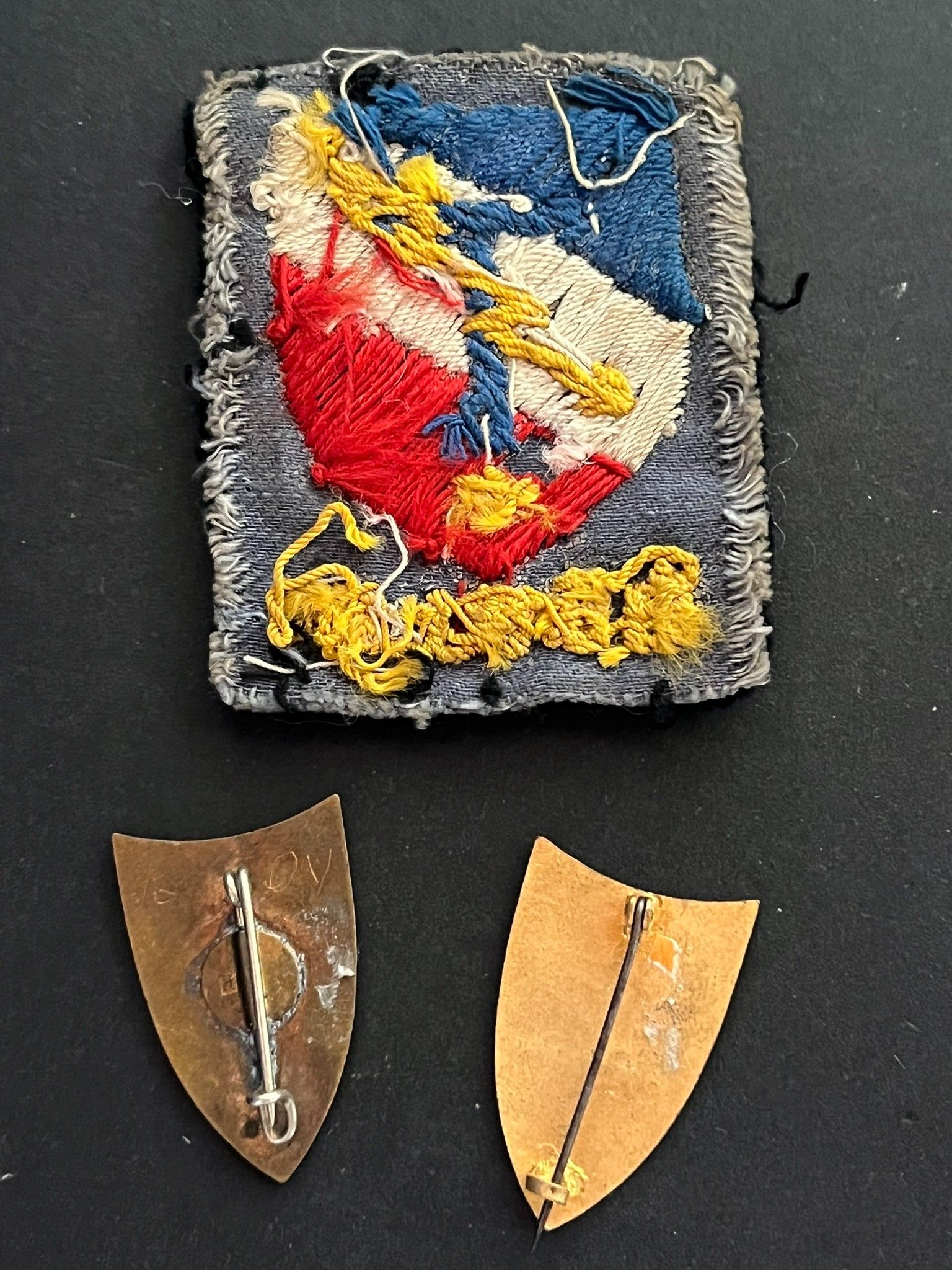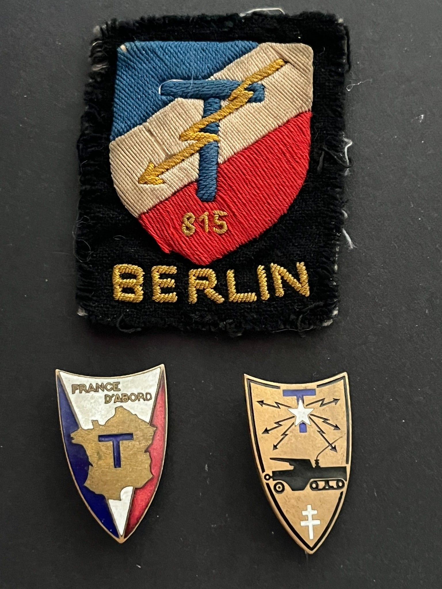 Lot of 3 pieces, 815th CT Berlin embroidered fabric, 96/84 CT 5DB marked AB, CT 2 DB hinged pin without mark. Lot of 3 pieces, 815th CT Berlin embroidered fabric, 96/84 CT 5th Armored Division marked AB, CT 2nd Armored Division hinged pin without mark