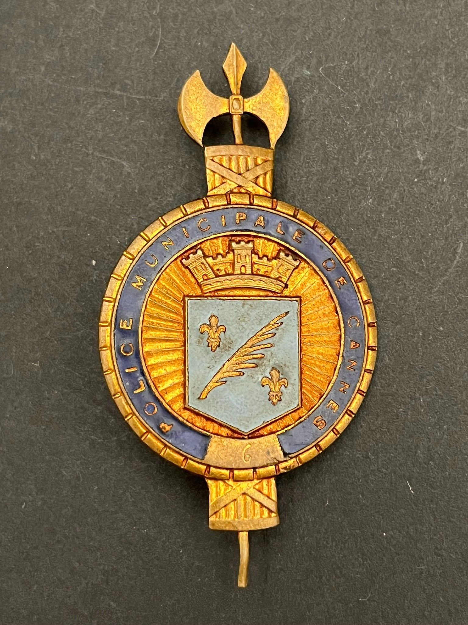 Badge for plainclothes officers Patate of the Municipal Police of Antibes enameled gilt bronze numbered 6 on obverse. Badge for plainclothes officers Patate of the Municipal Police of Antibes enameled gilt bronze numbered 6 on obverse