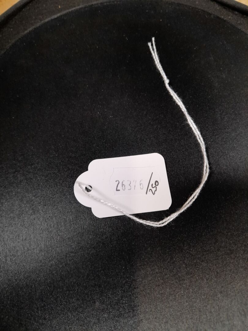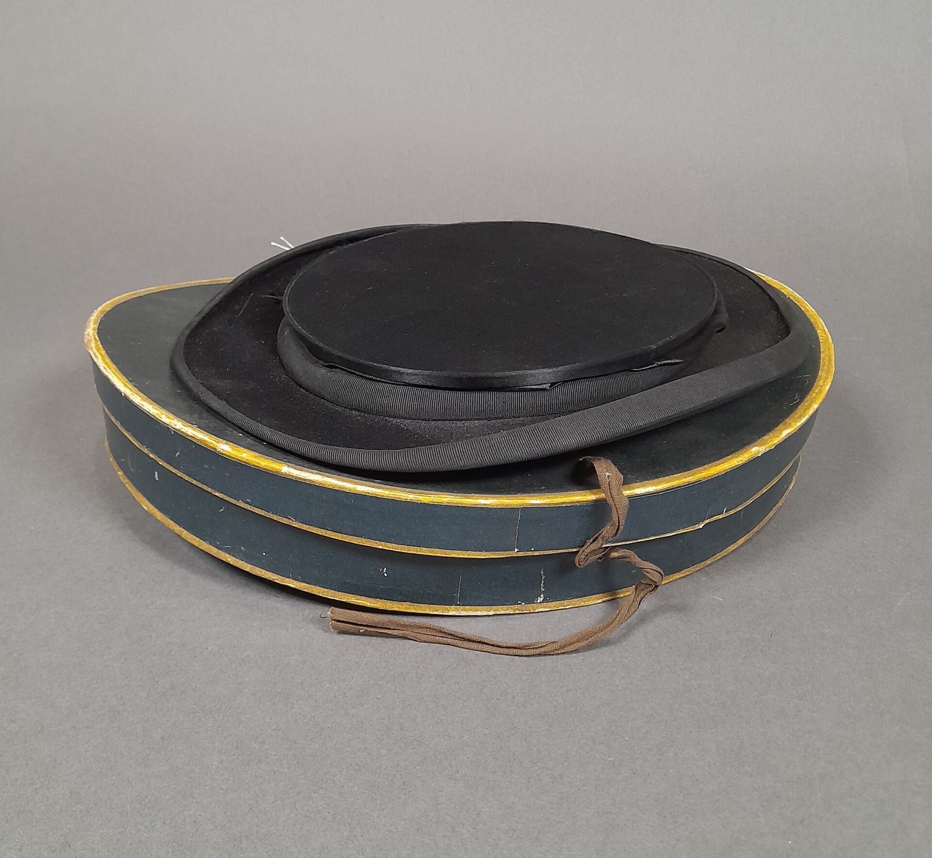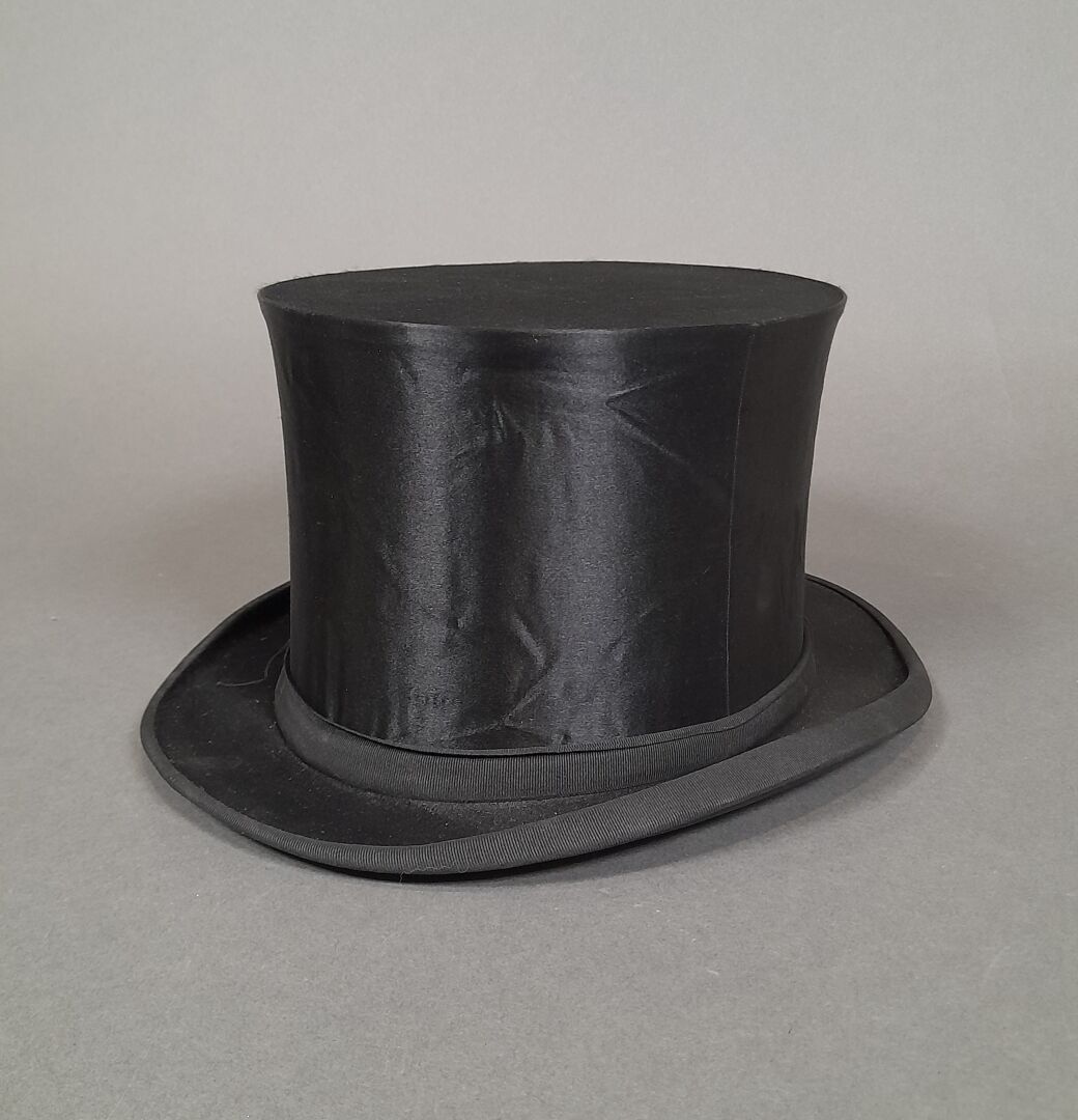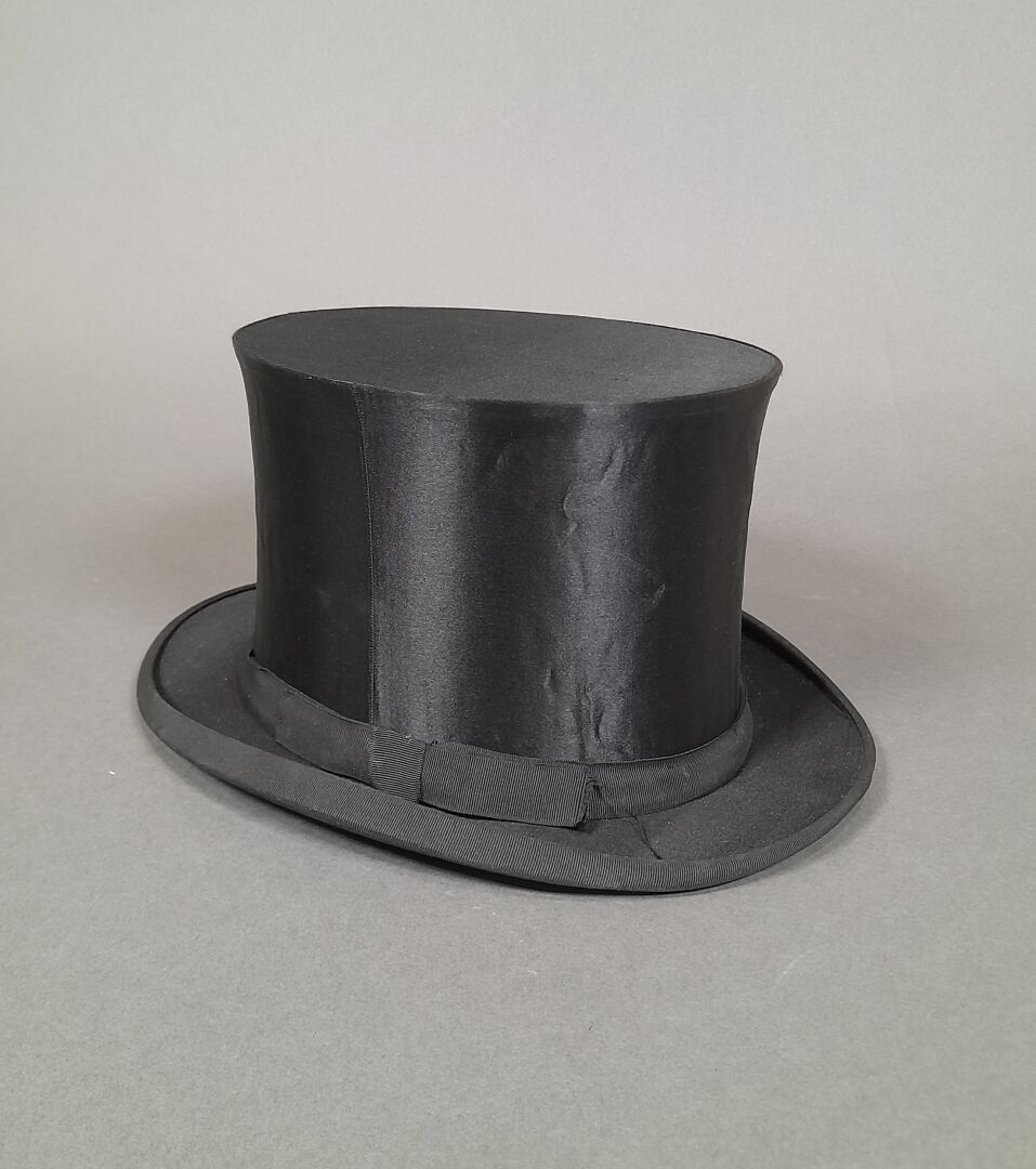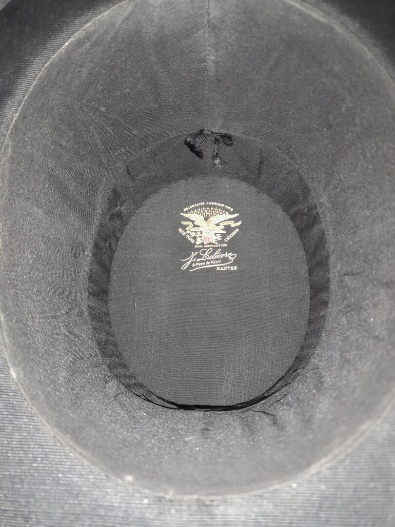 Black satin hat adorned with matching grosgrain ribbon, the inside stamped in gold.