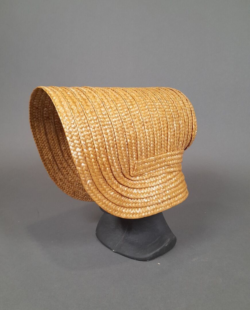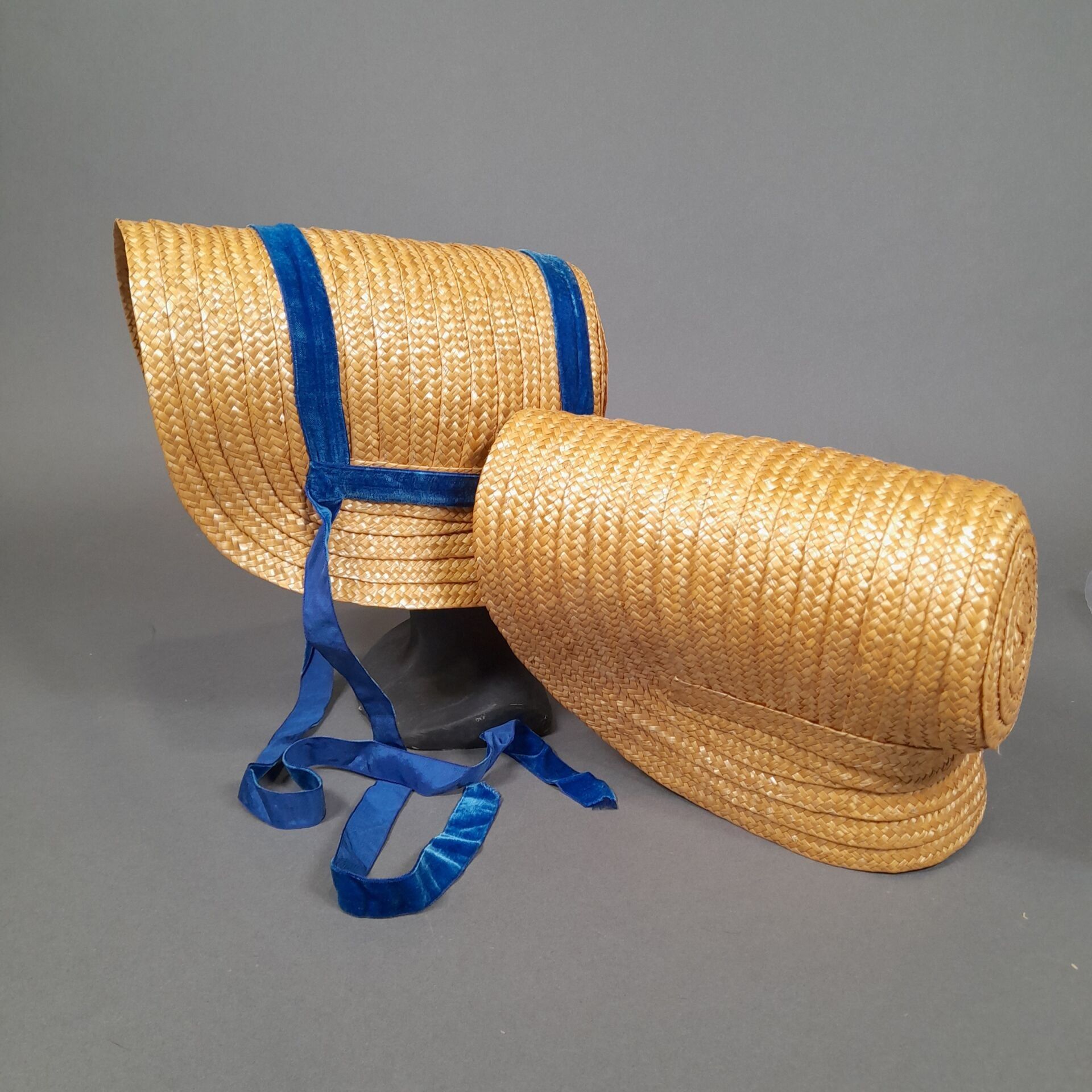 Two sewn straw capotes, one adorned with blue velvet ribbon.