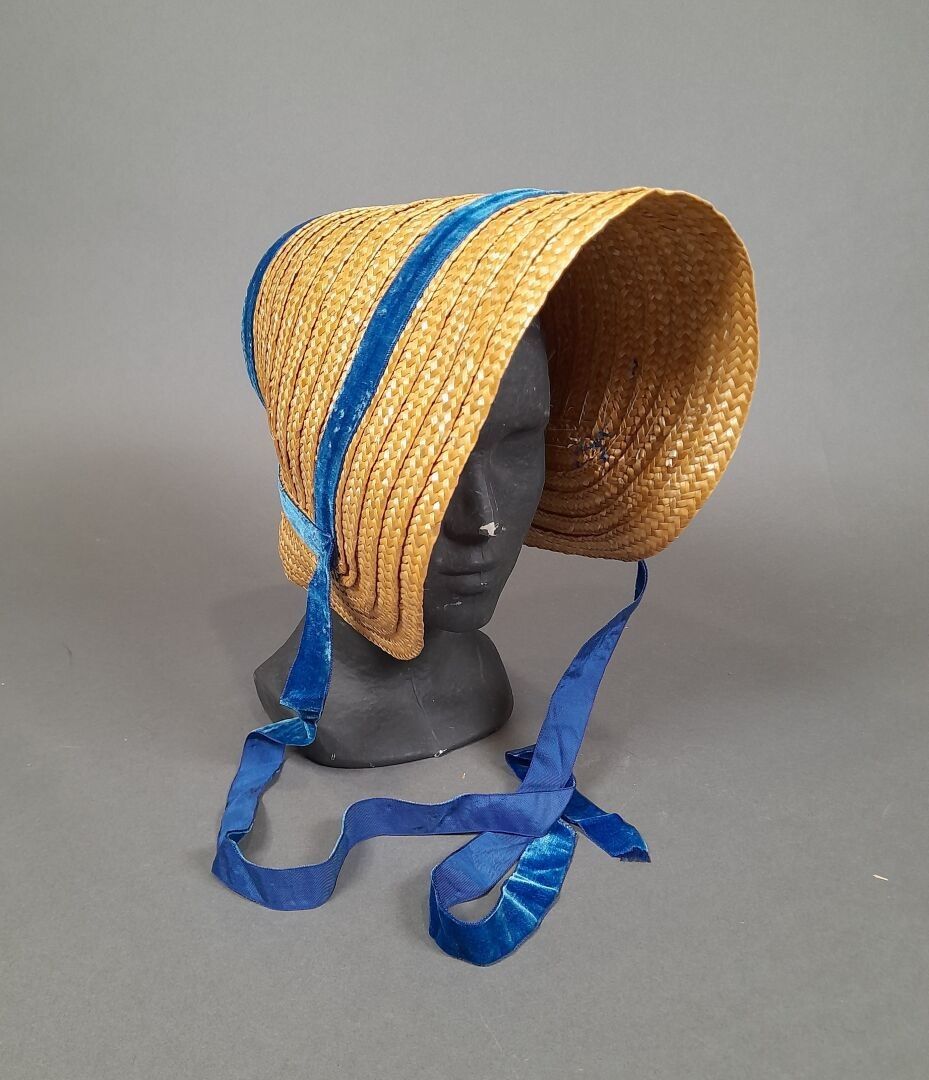 Two sewn straw capotes, one adorned with blue velvet ribbon. (good condition).