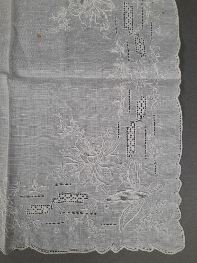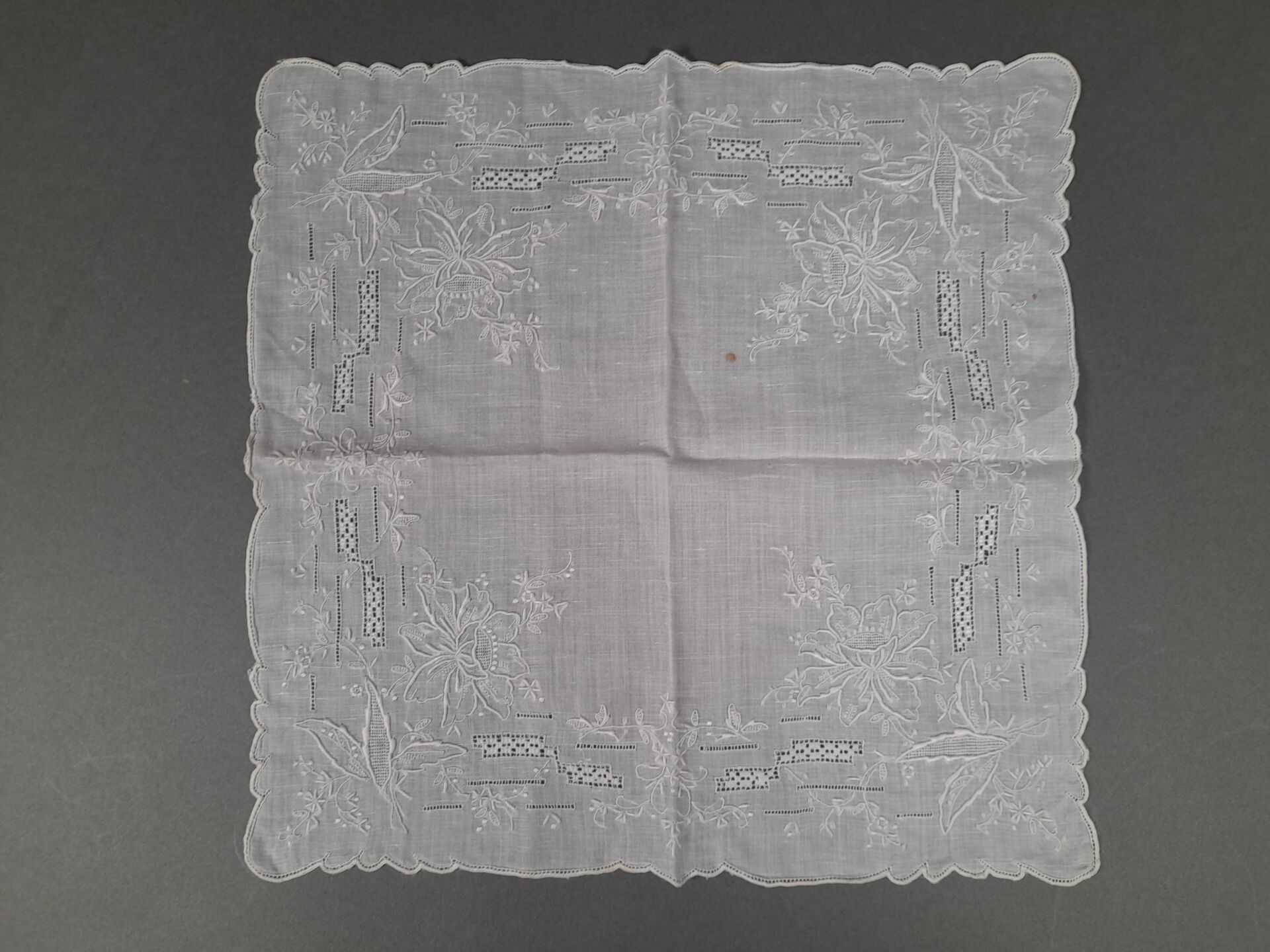 White cotton baptiste handkerchief with embroidered and openwork decoration of flowers and foliage, scalloped border.