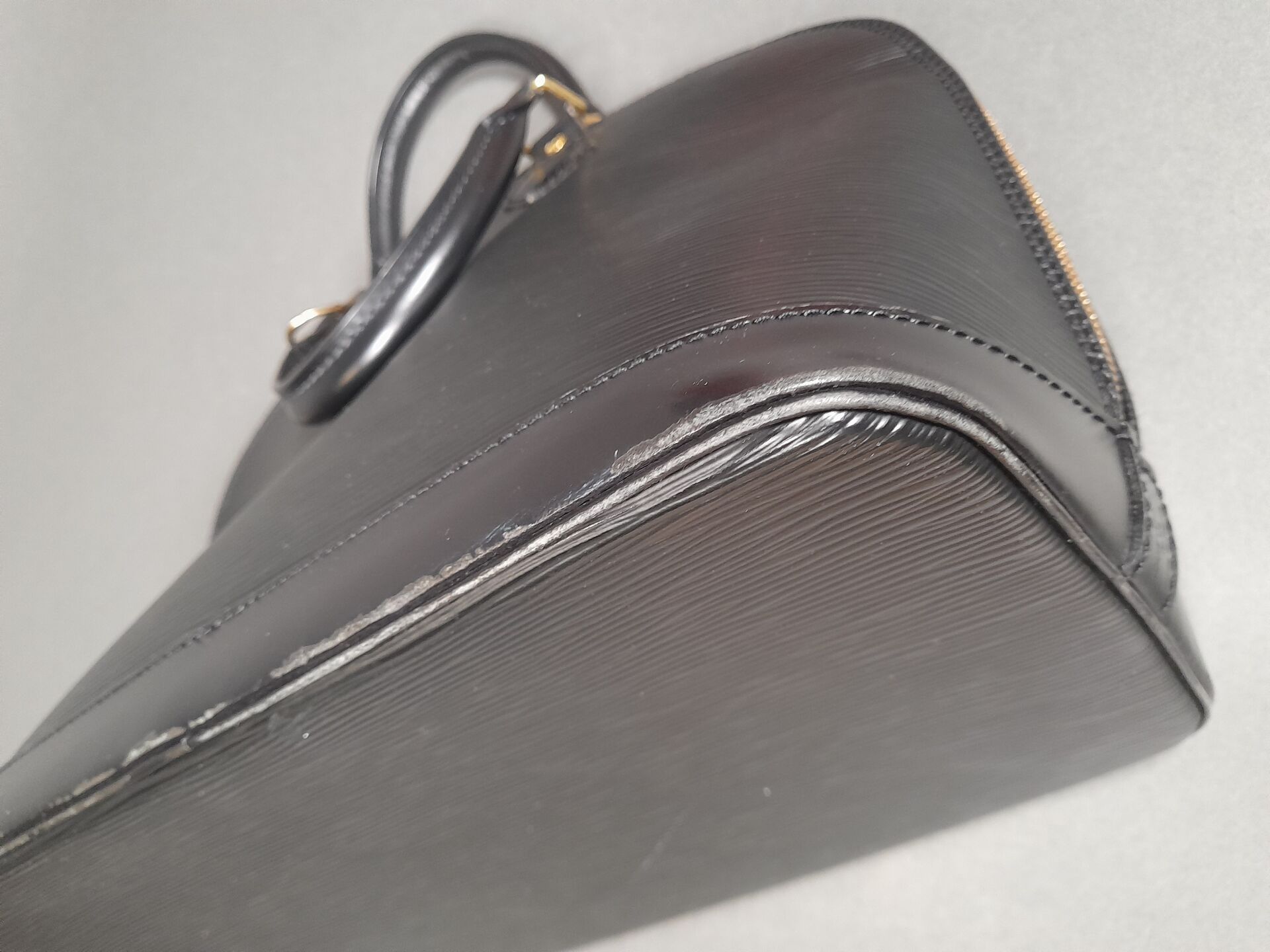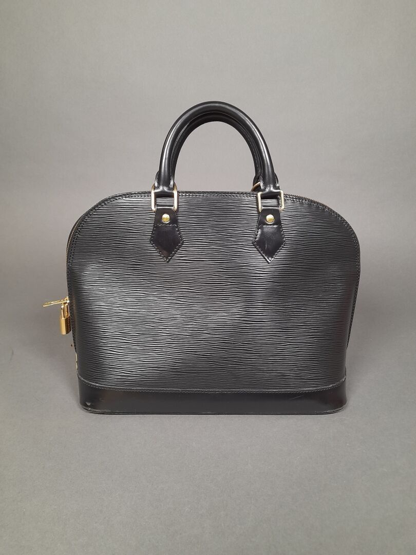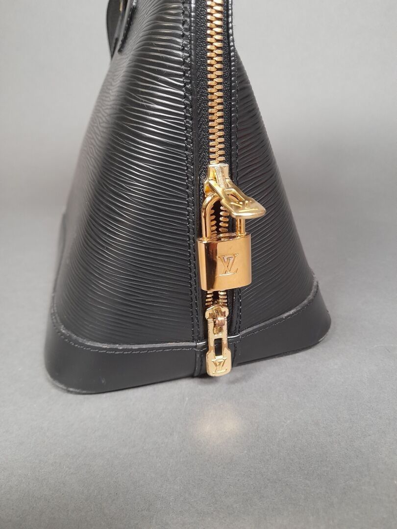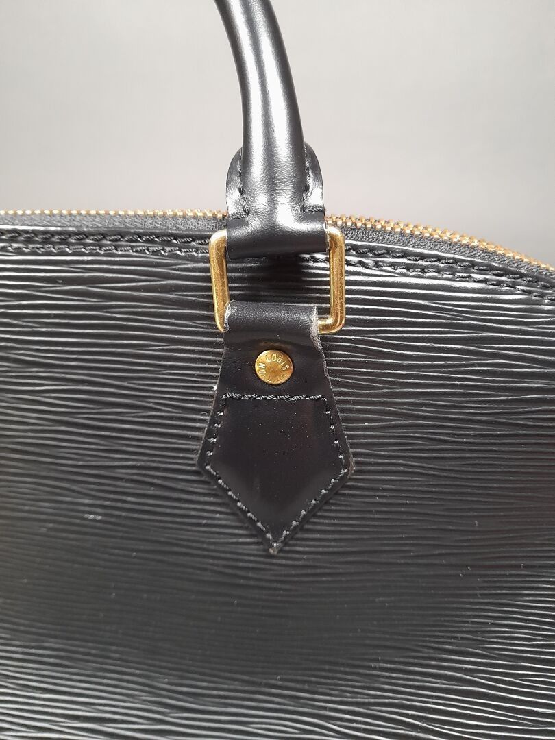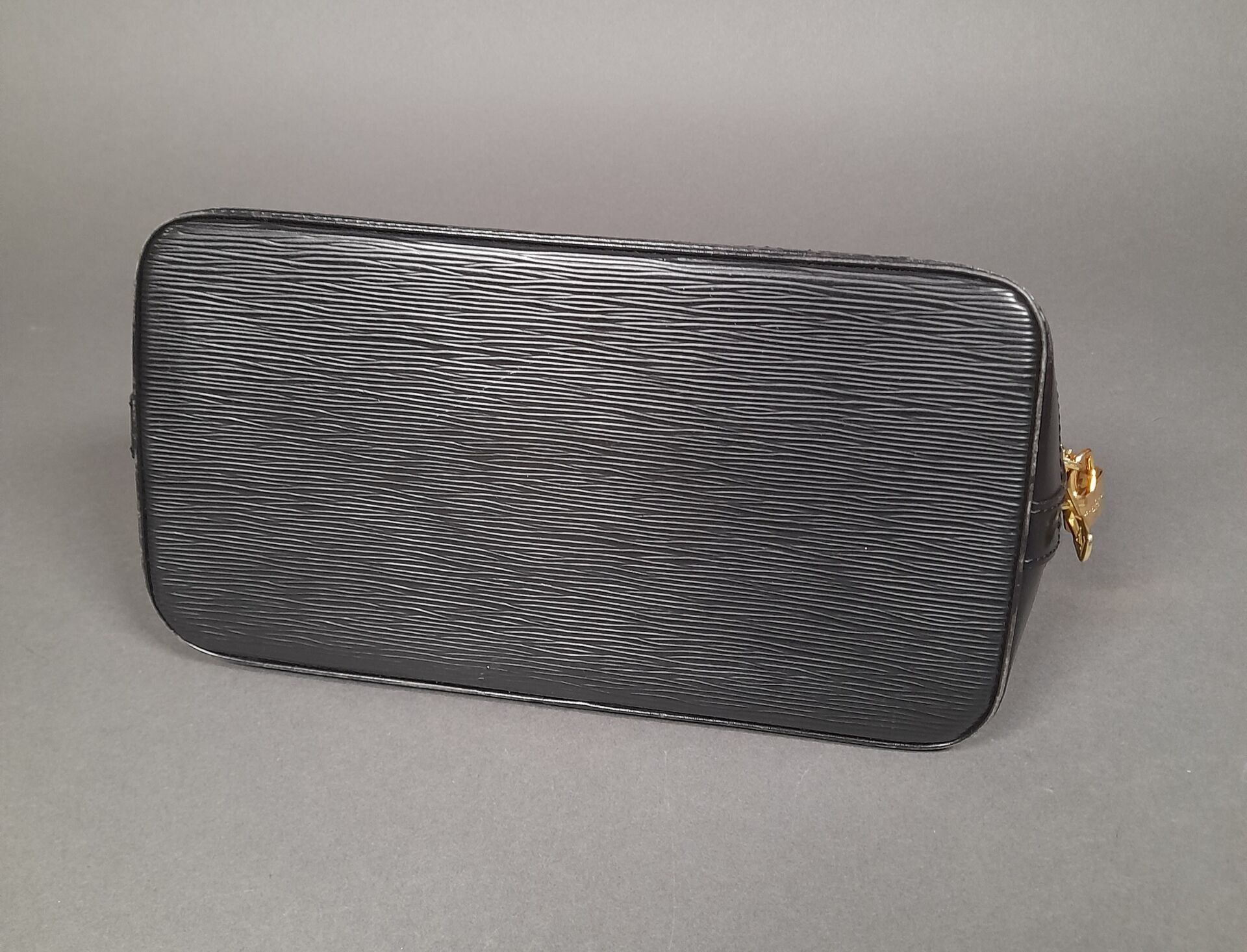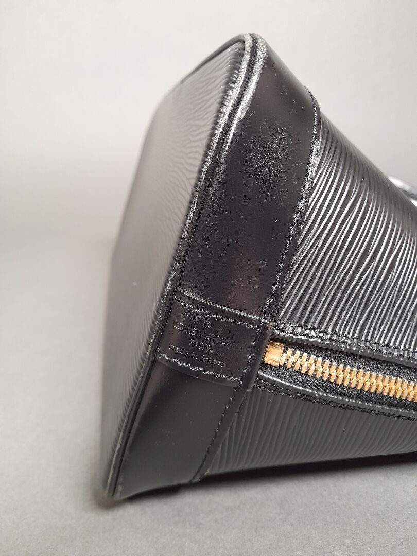 Handbag with two handles in black epi leather, gold-tone metal trim and top zip fastening. Grey suede interior with a large compartment and a flat pocket.