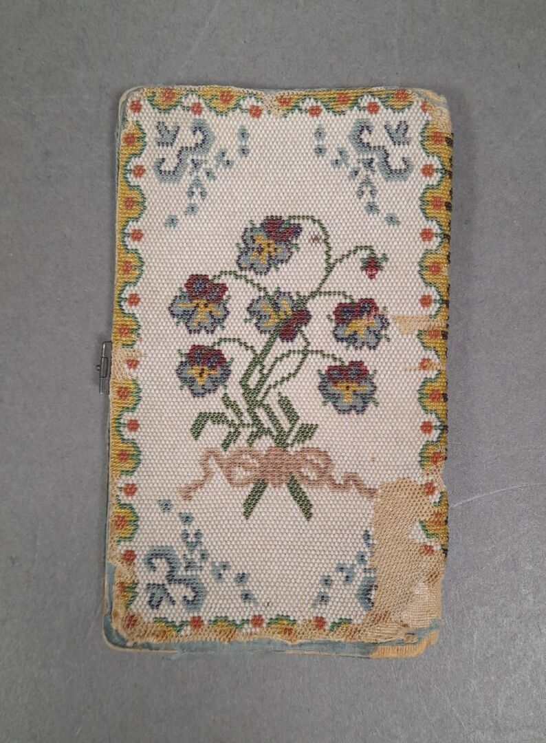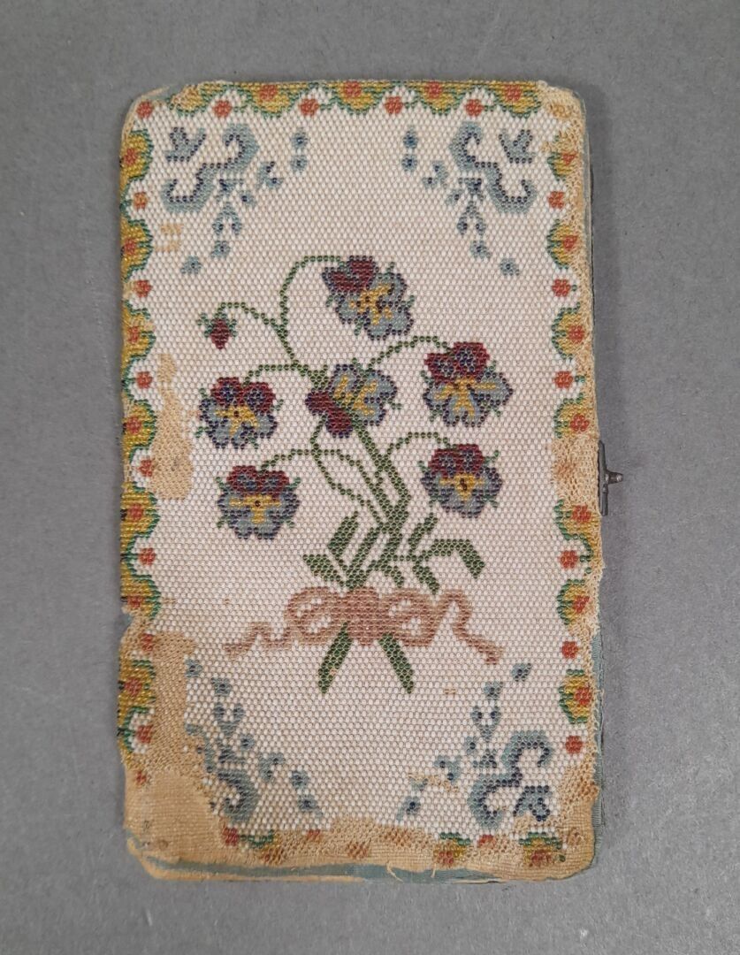 Notebook decorated with polychrome micro-pearl sandblasted pansies on a white background, inside in blue silk.