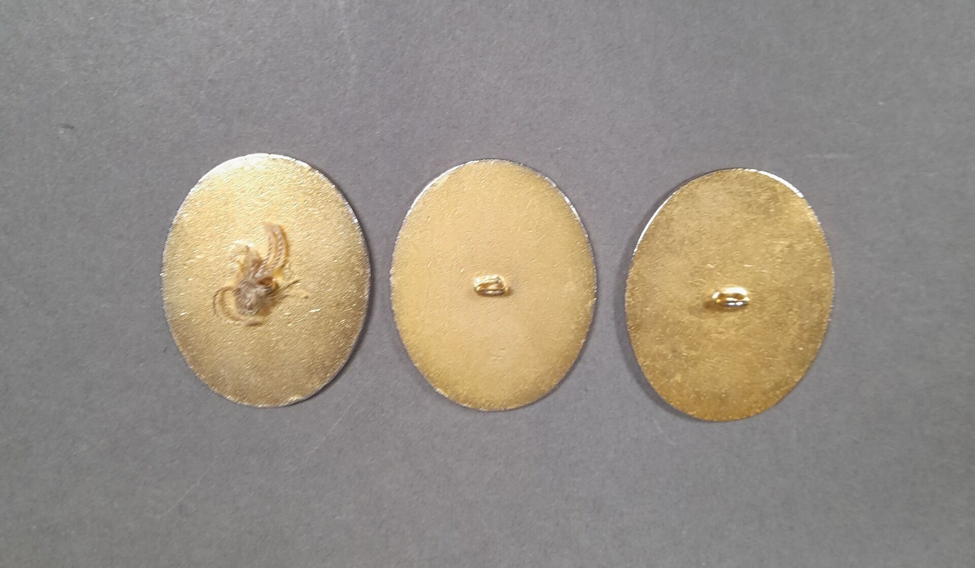 CHRISTIAN DIOR, PARIS. Three gilded metal buttons in the sha…