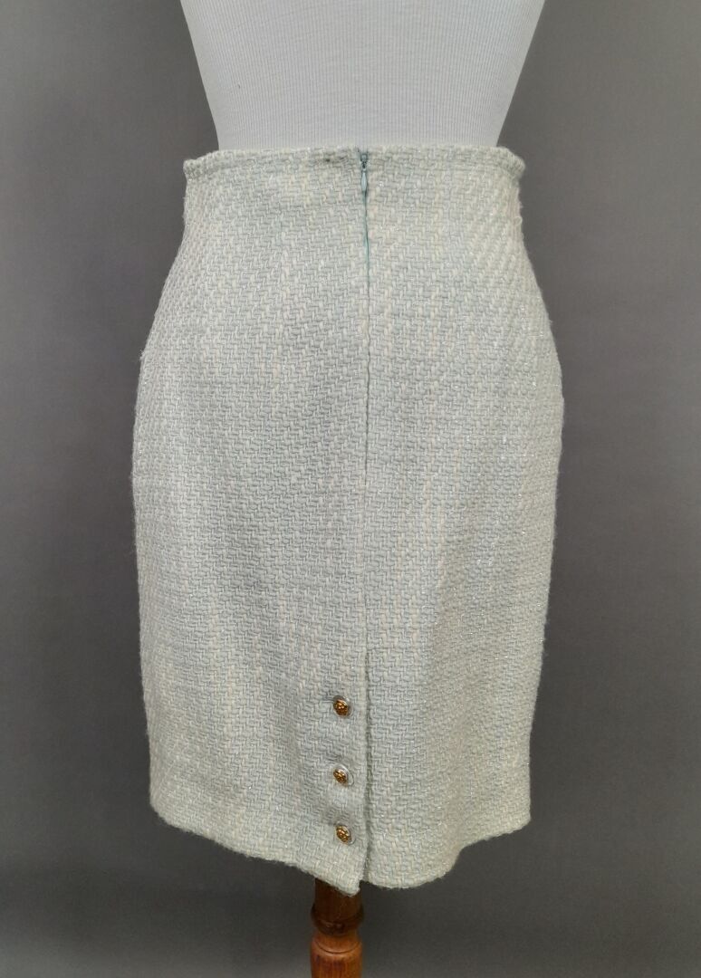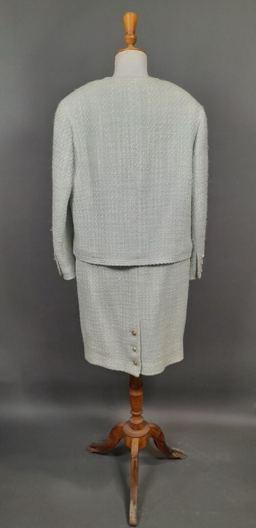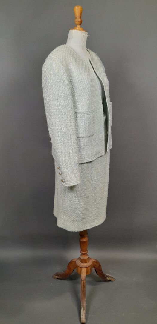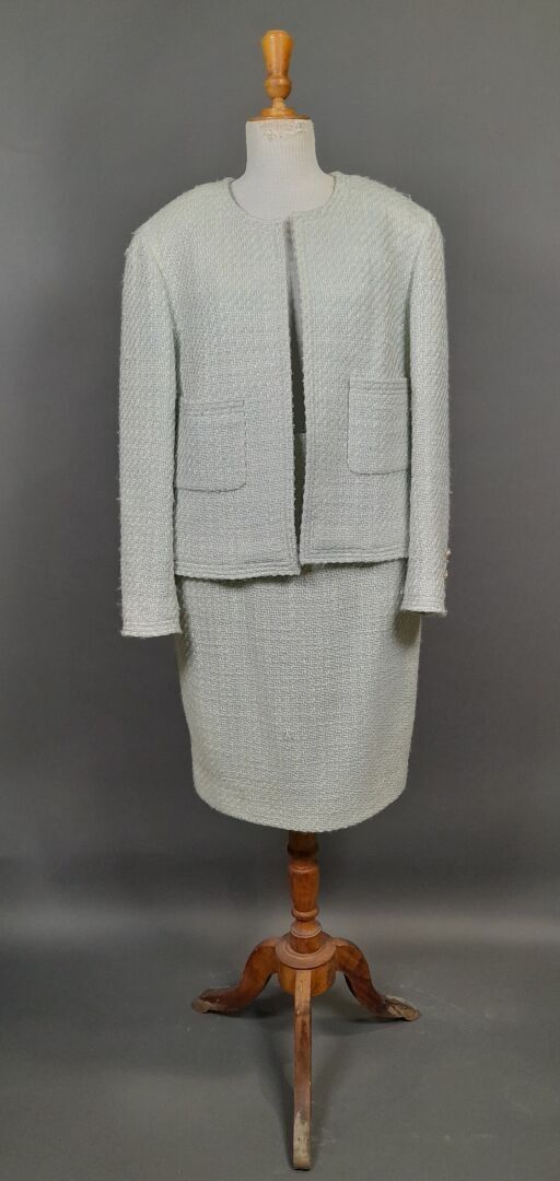 Light blue and ecru wool, polyamide and cotton tweed skirt suit comprising a shouldered jacket with a rounded neckline, two side pockets and handles adorned with transparent plastic buttons embellished with a gilded metal camellia, signed at the back, and matching straight skirt.