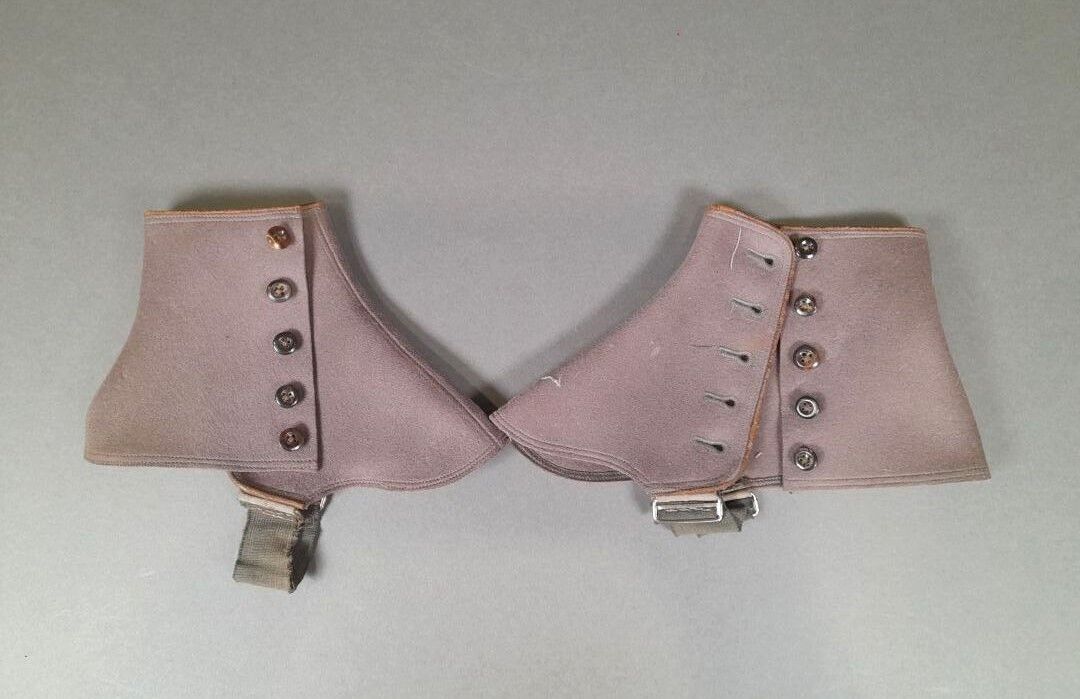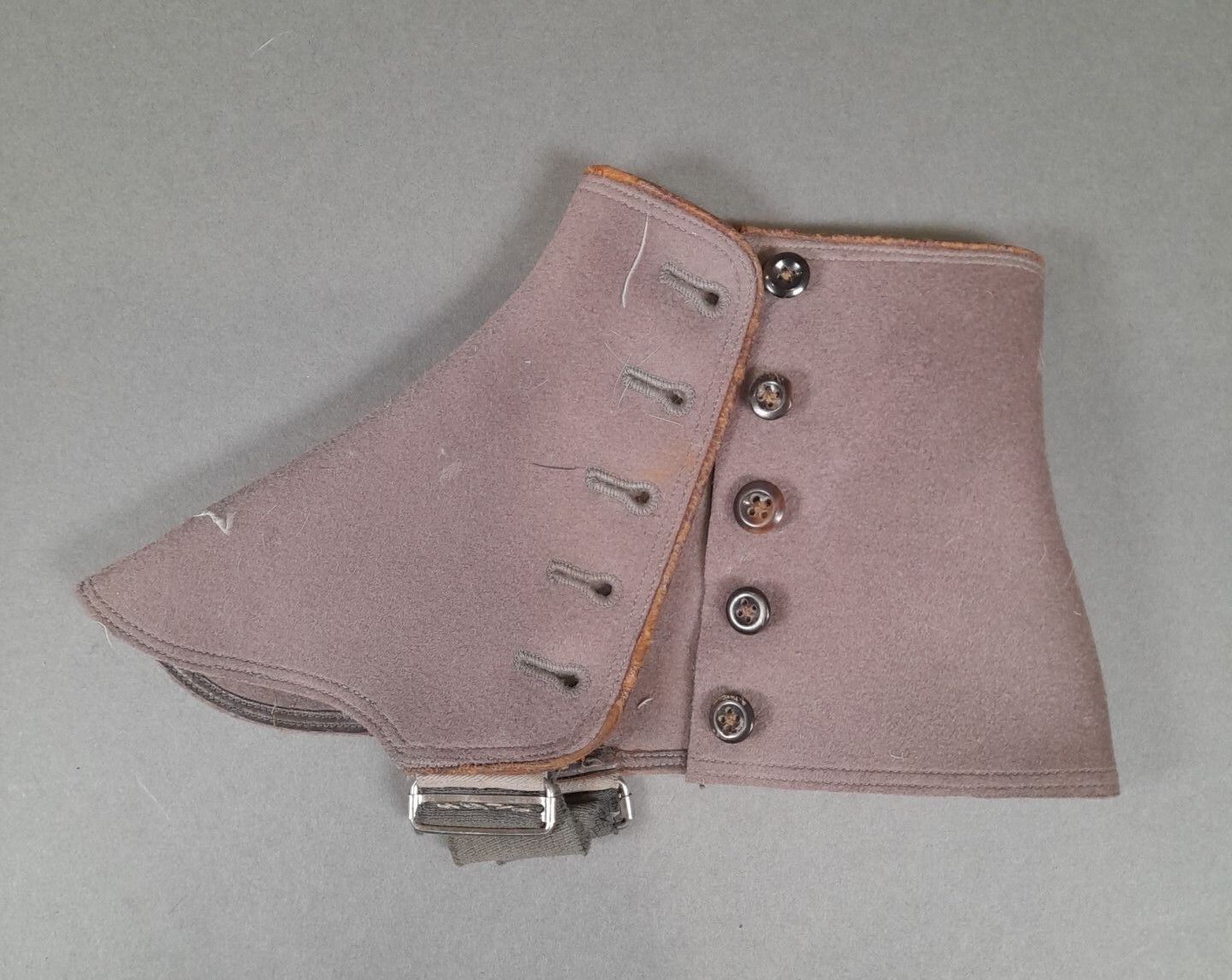 Pair of grey wool gaiters trimmed with brown leather and fastened with small horn buttons.