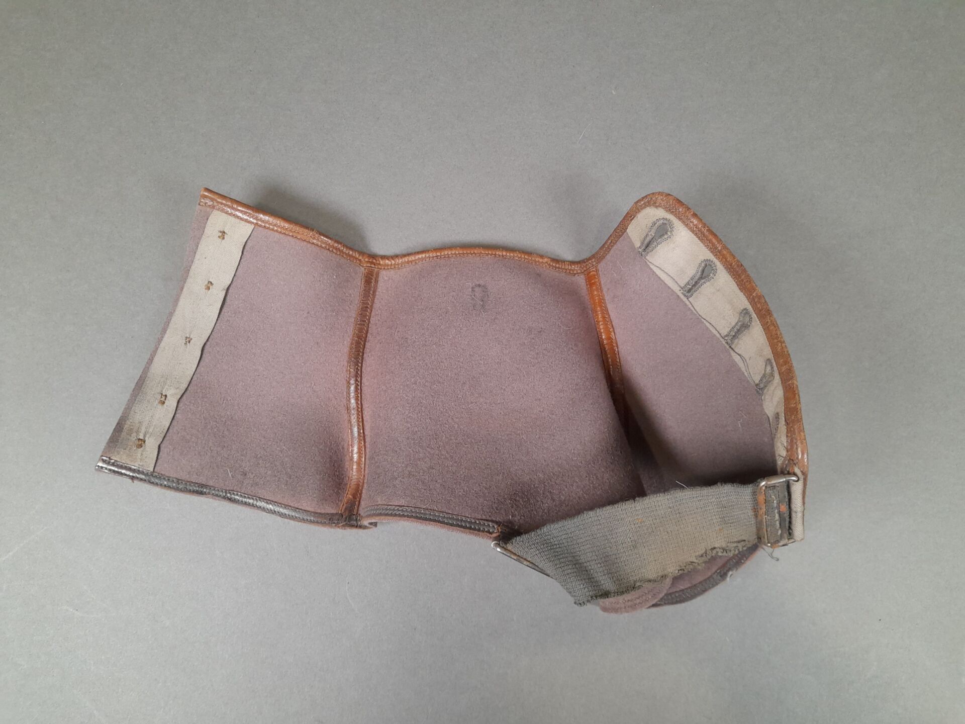 Pair of grey wool gaiters trimmed with brown leather and fas…