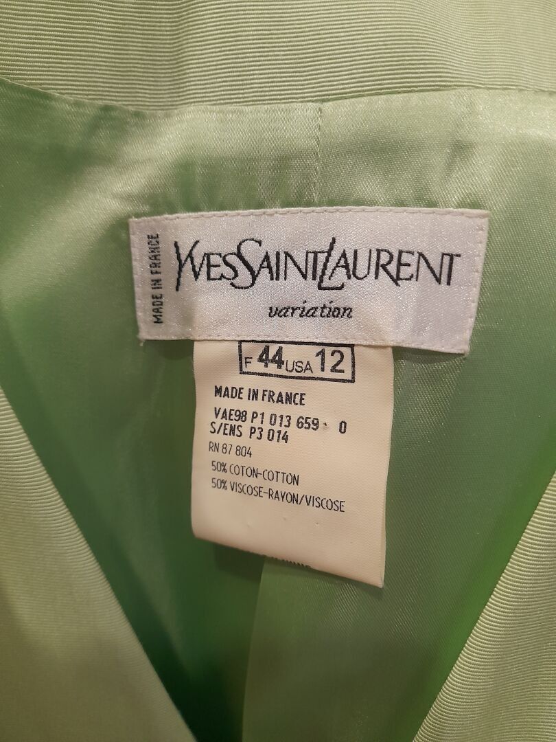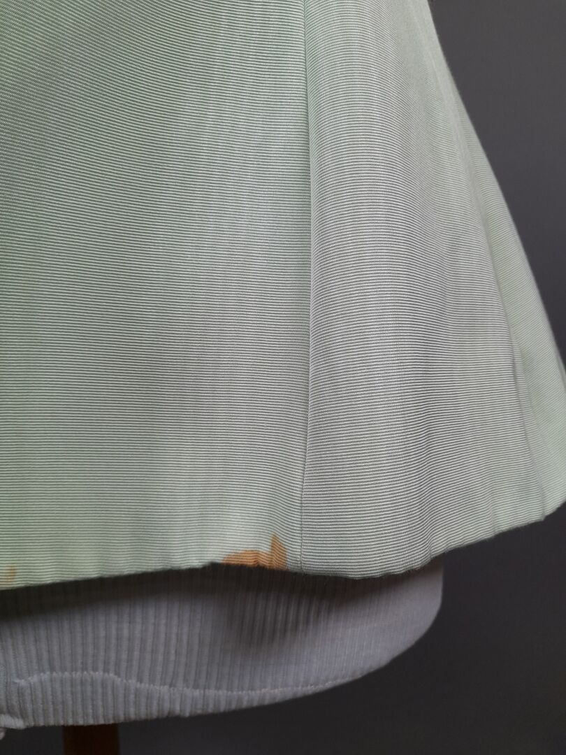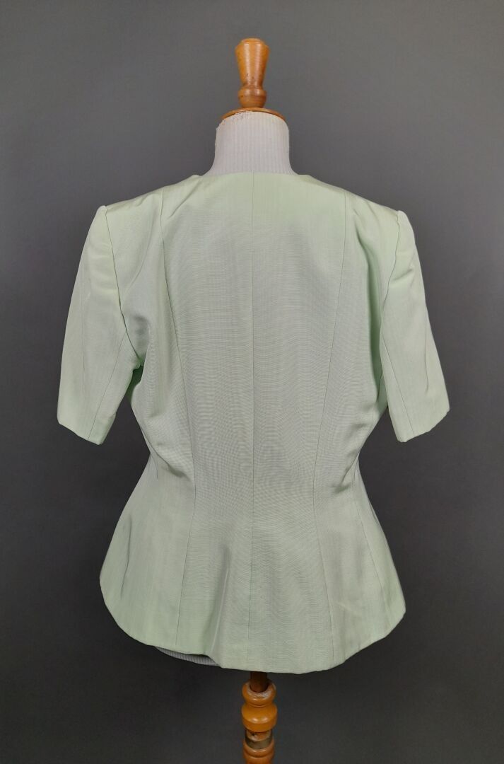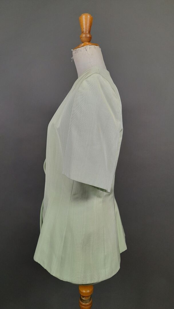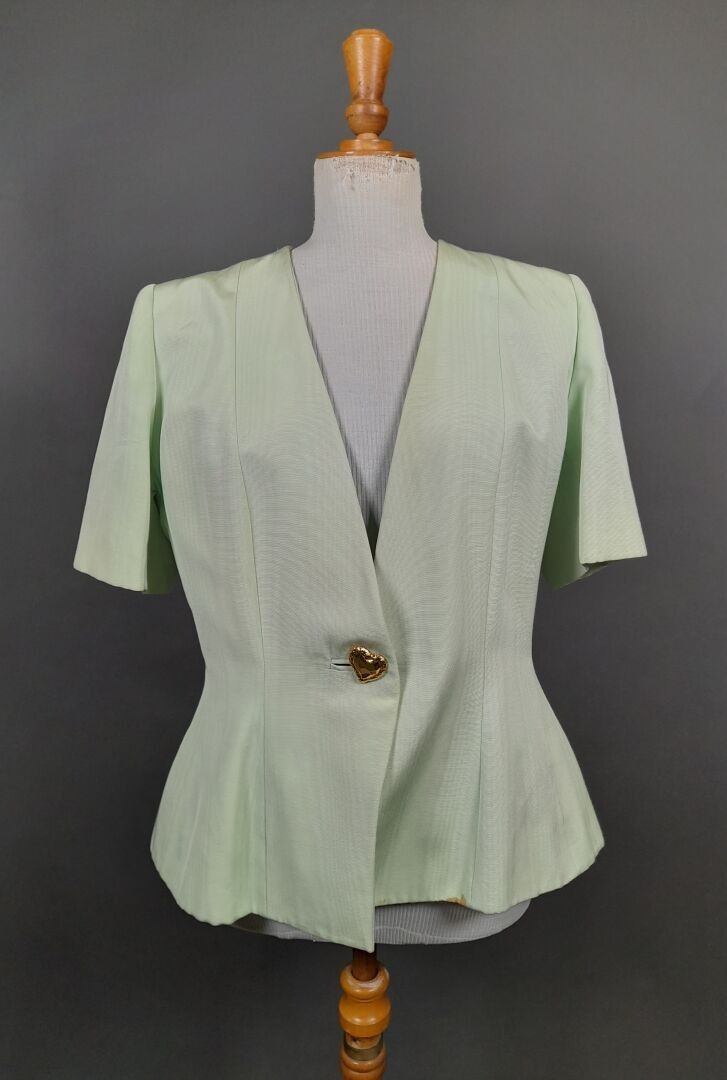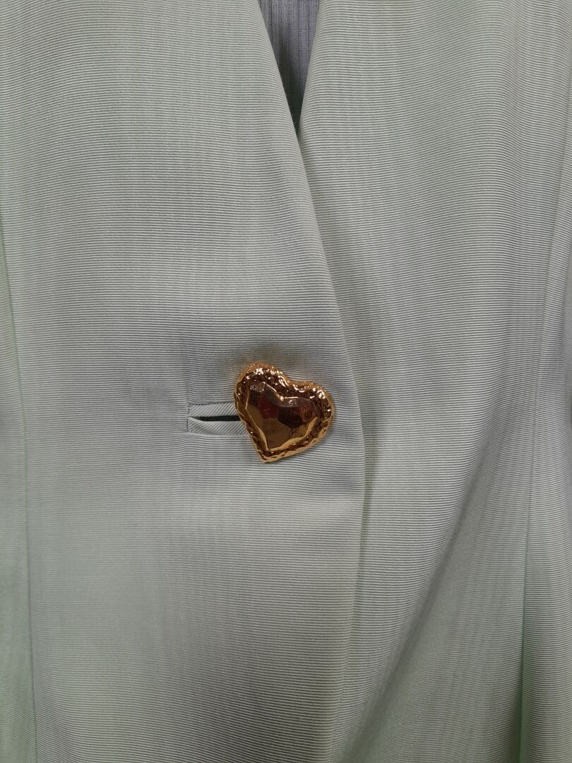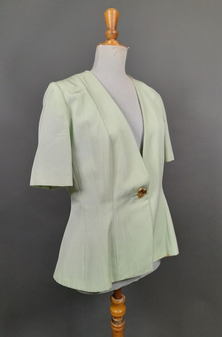 Light green fluted and moiré cotton and viscose suit jacket with short sleeves and V-neckline, fastened at the front with a heart-shaped gold-tone metal button.