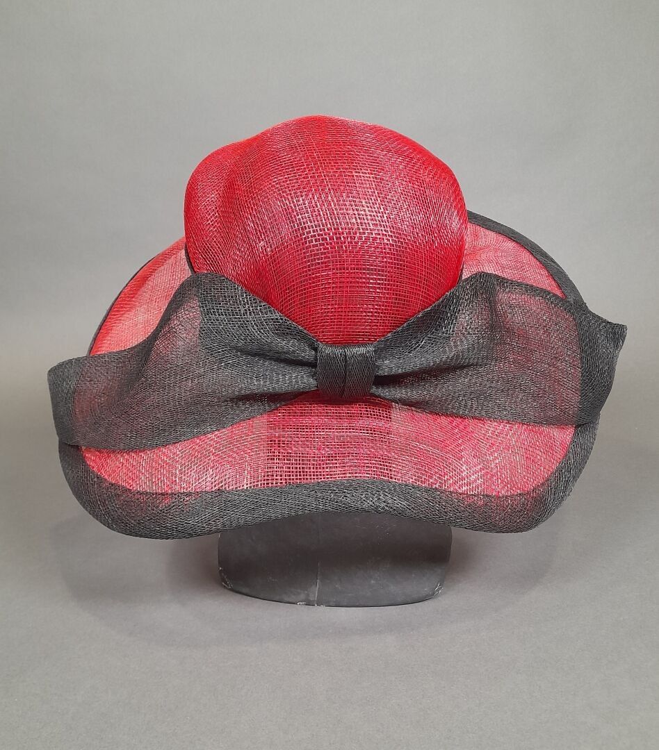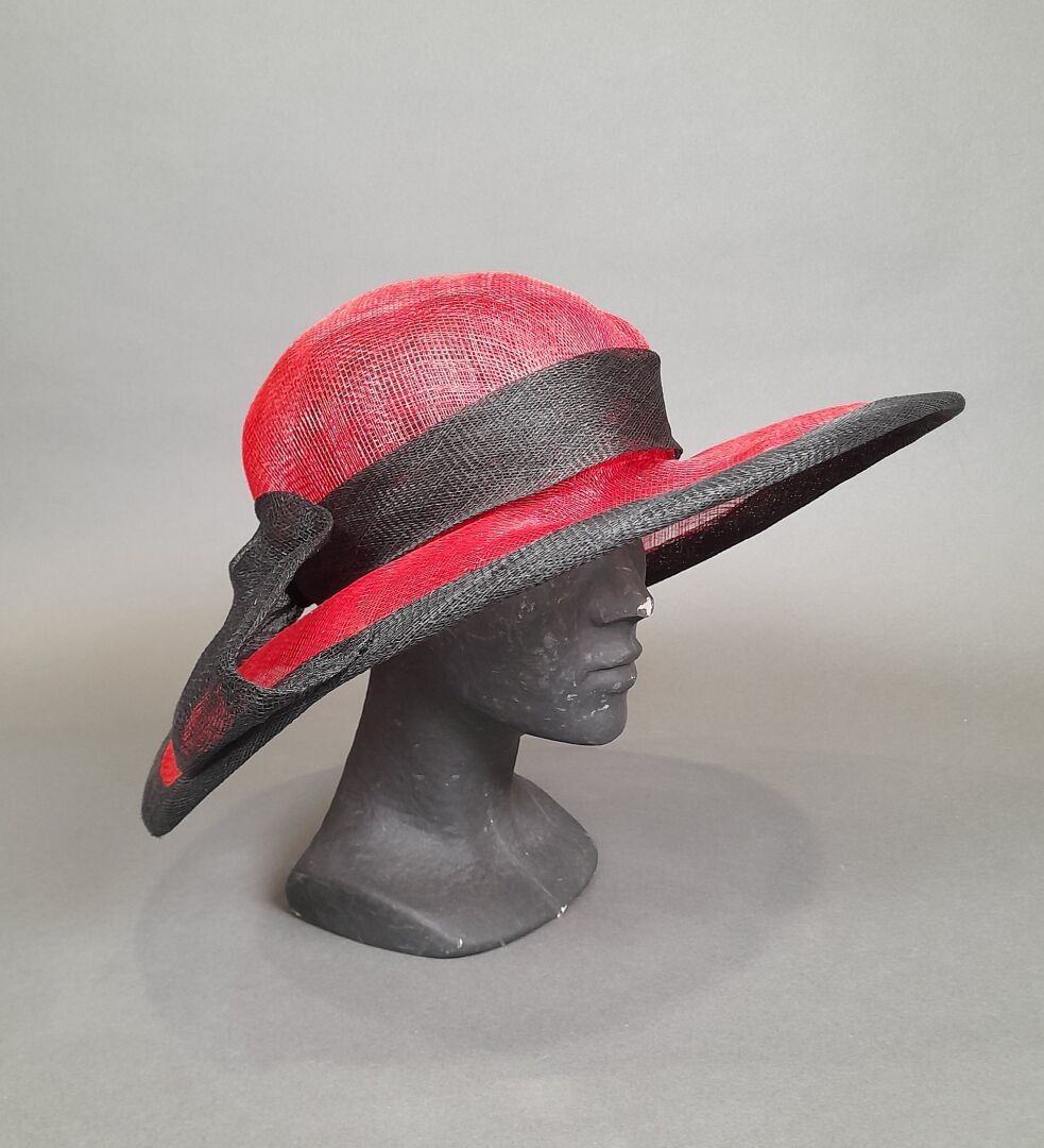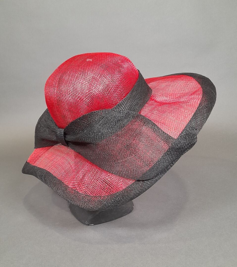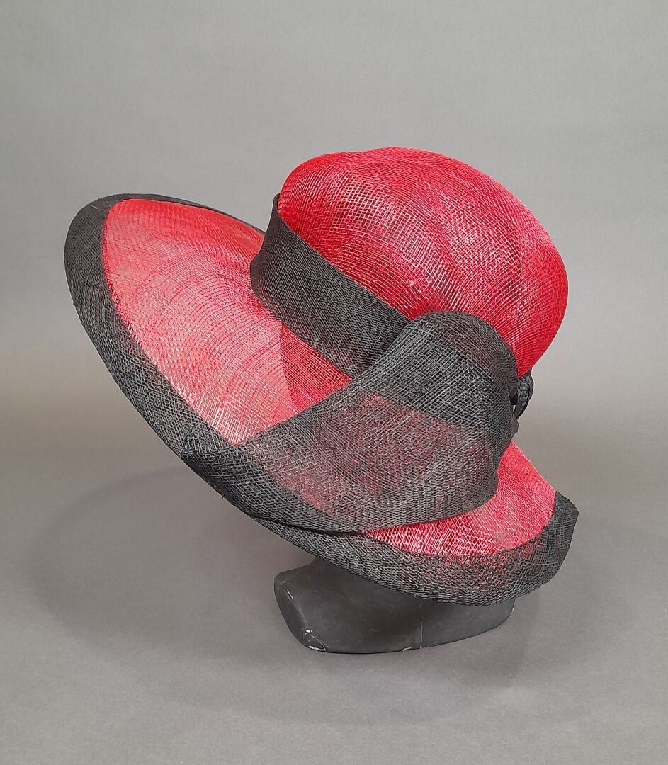 Asymmetrical wide-brimmed cap in red and black sisal.