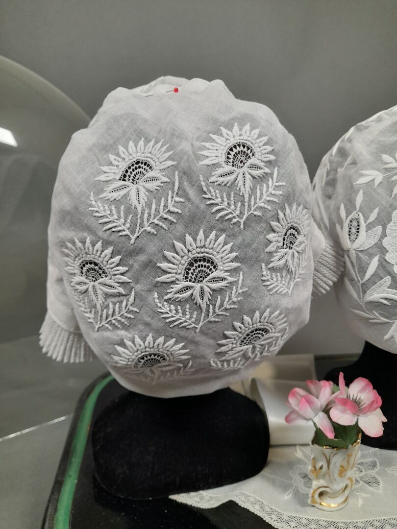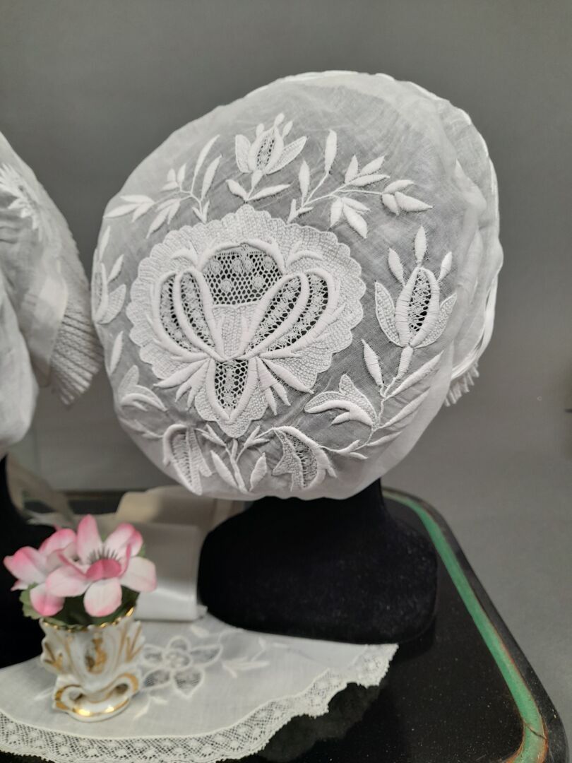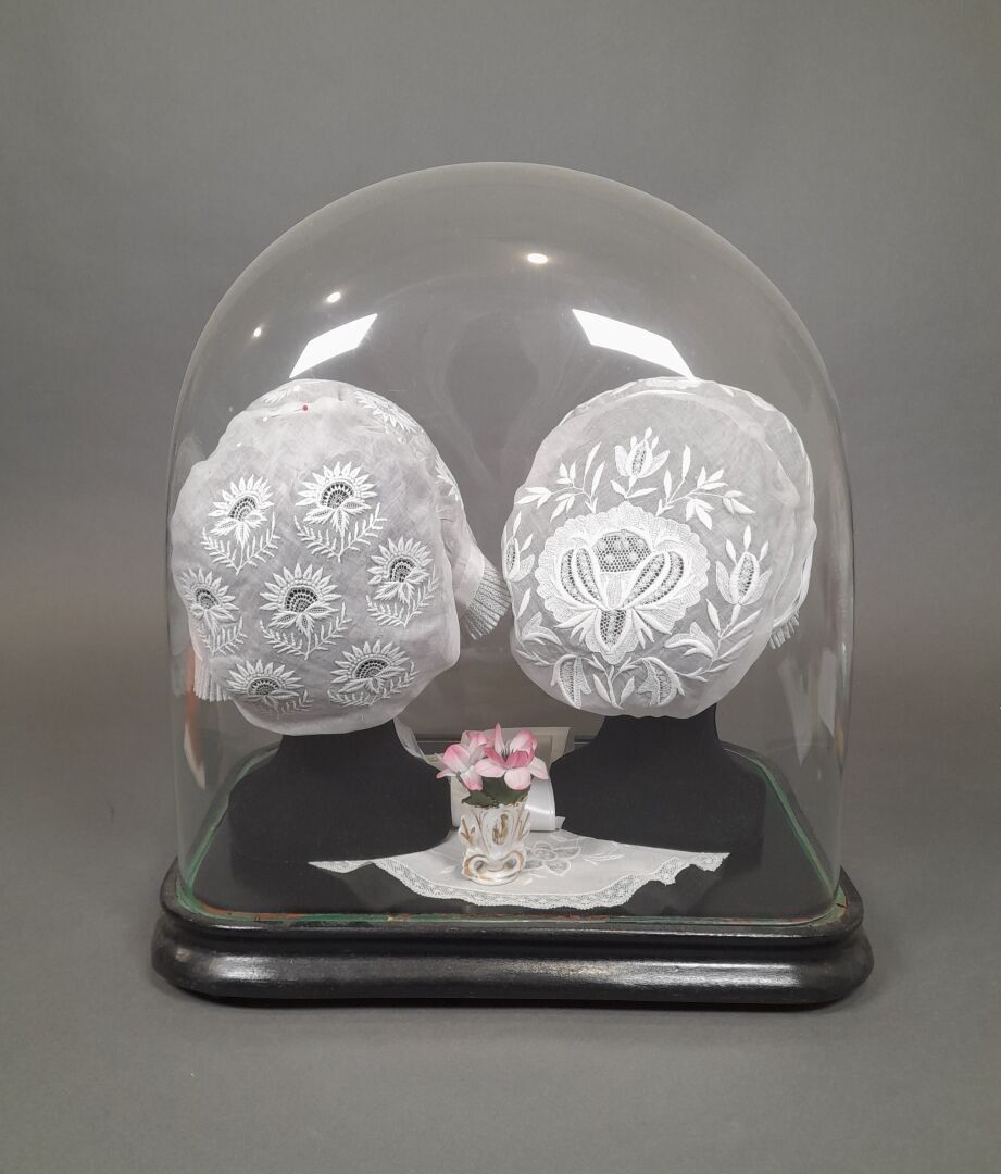 Large bridal globe containing two Touraine cotton muslin bonnets decorated with flowers embroidered in feather dots and sand embellished with needle lace for one, Valenciennes lace for the other, the lites in straw Valenciennes lace.