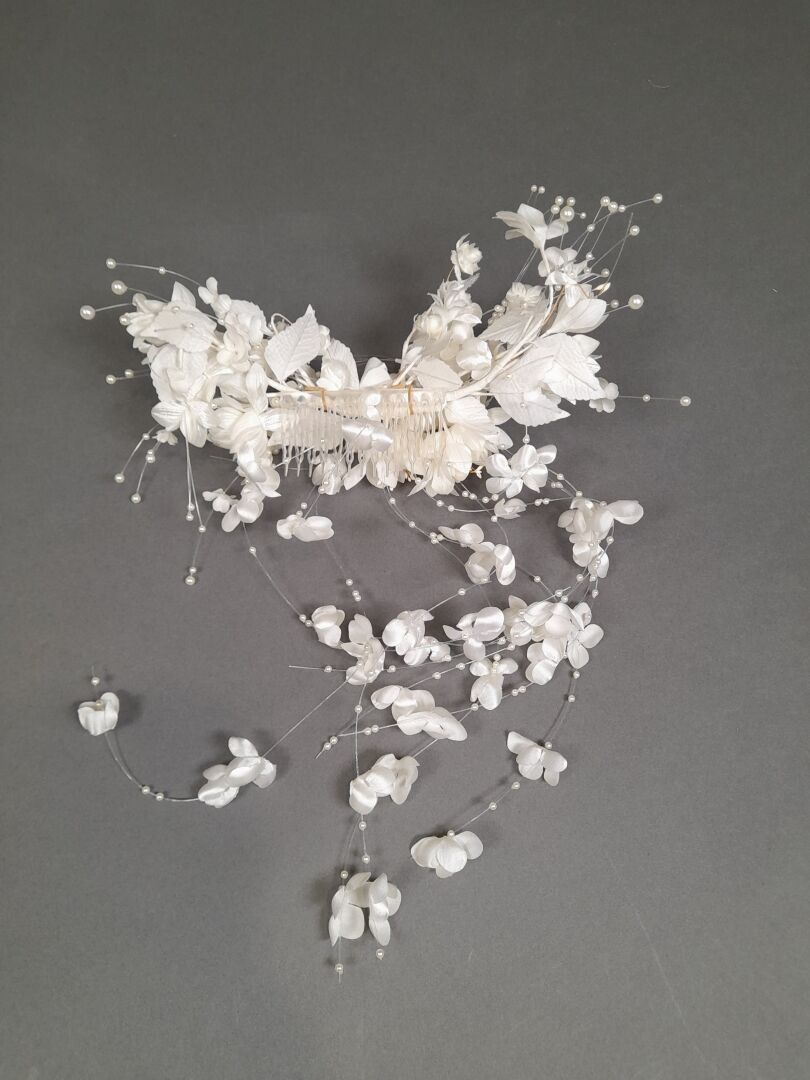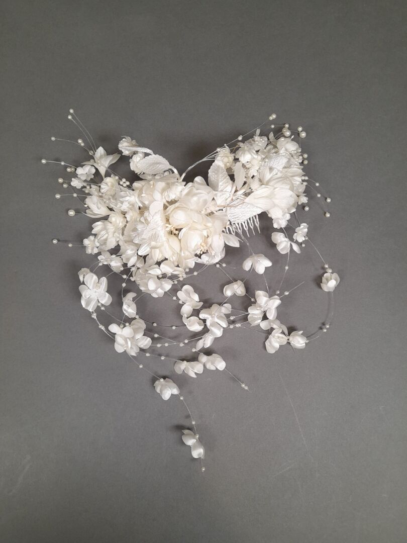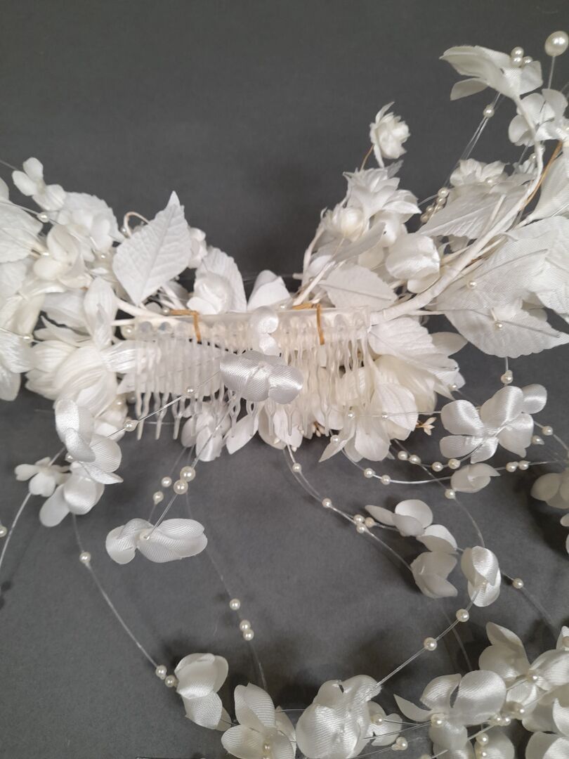 Bride's headdress made of fabric flowers and white pearls mounted on a comb.
