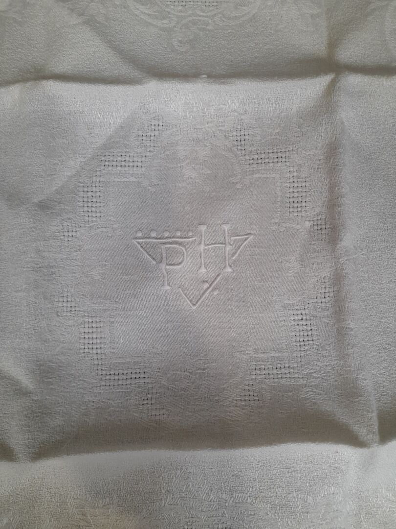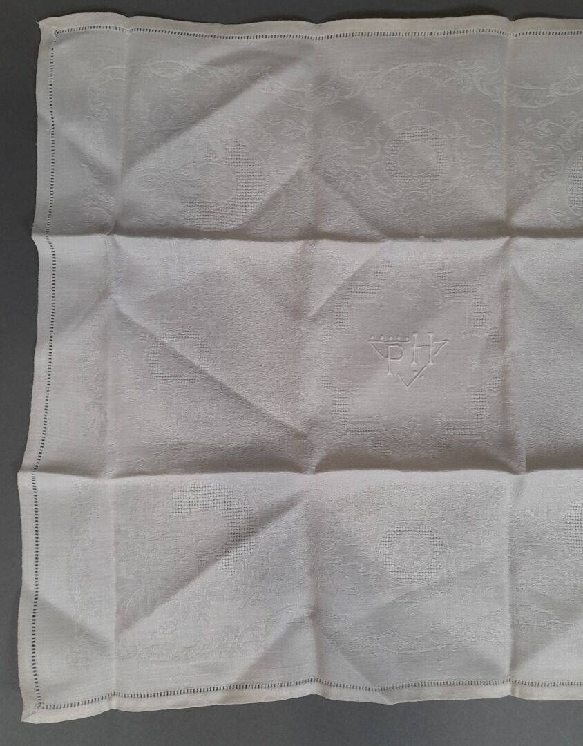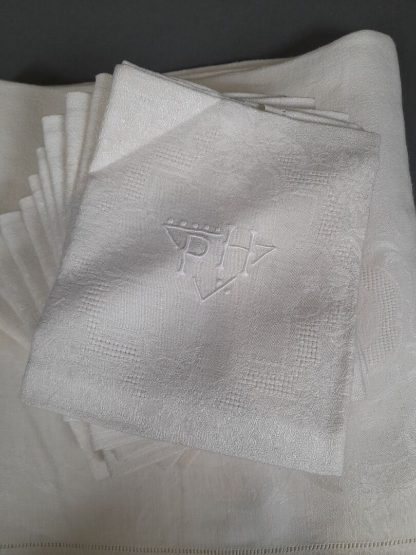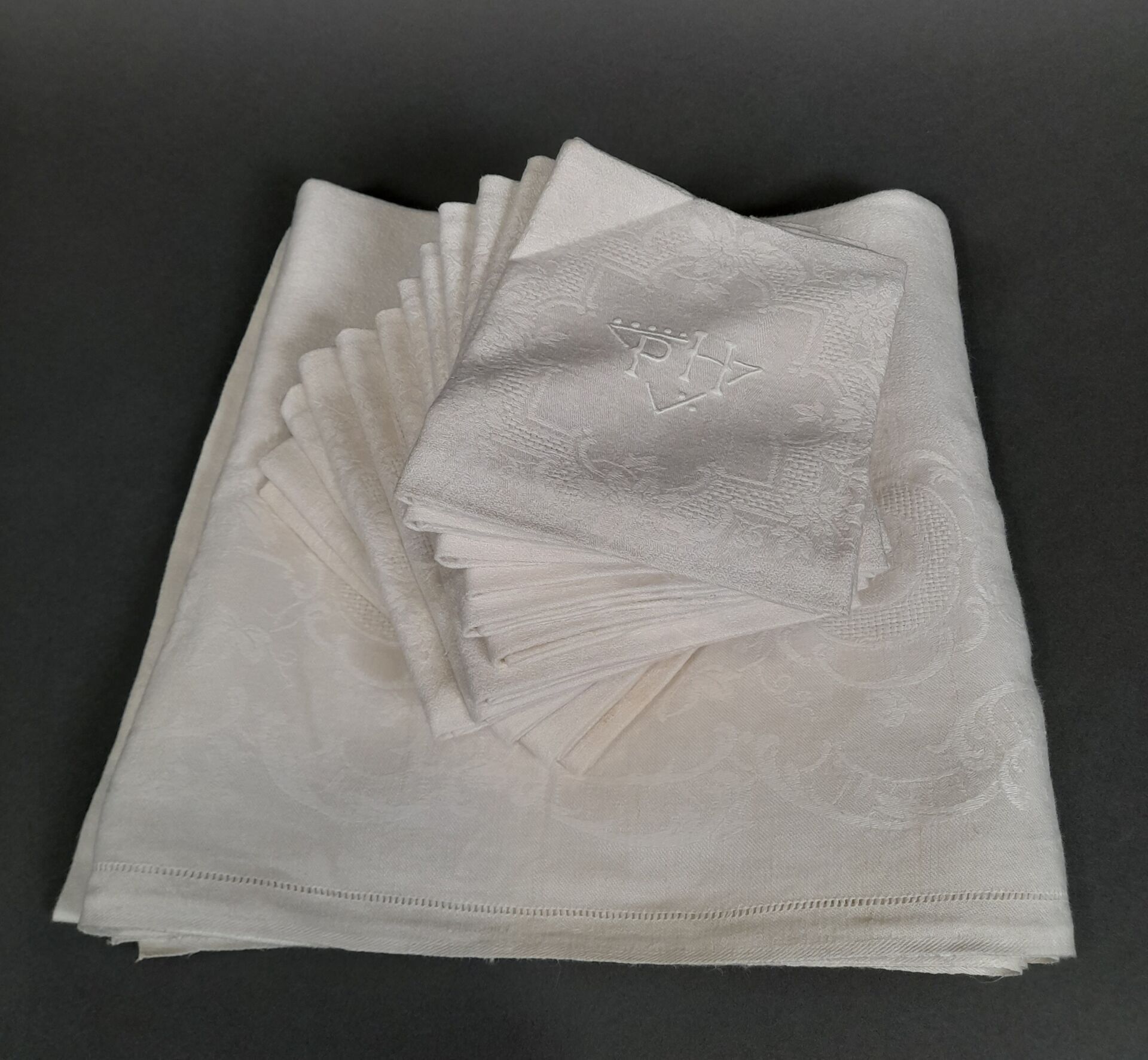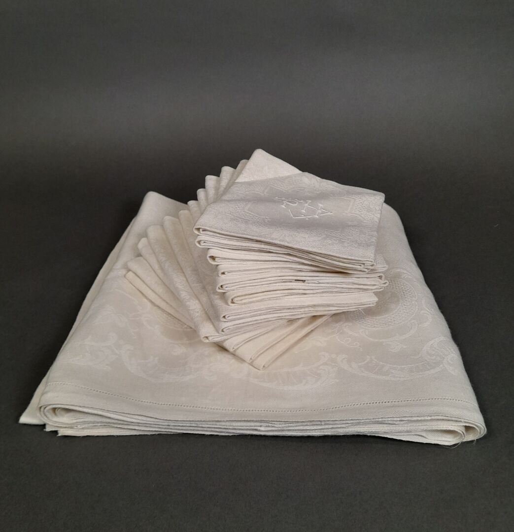 Table service in ecru damask cotton decorated with flowers and PH numerals, comprising a tablecloth and twelve napkins.